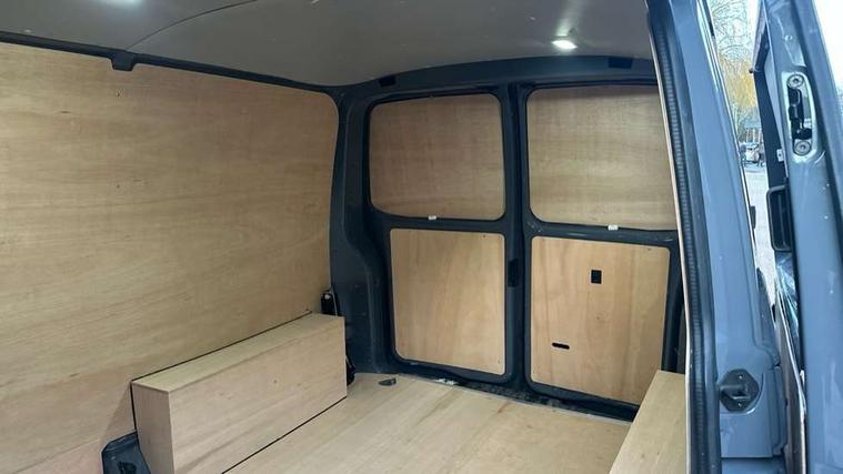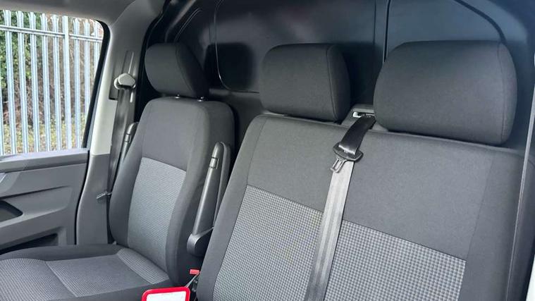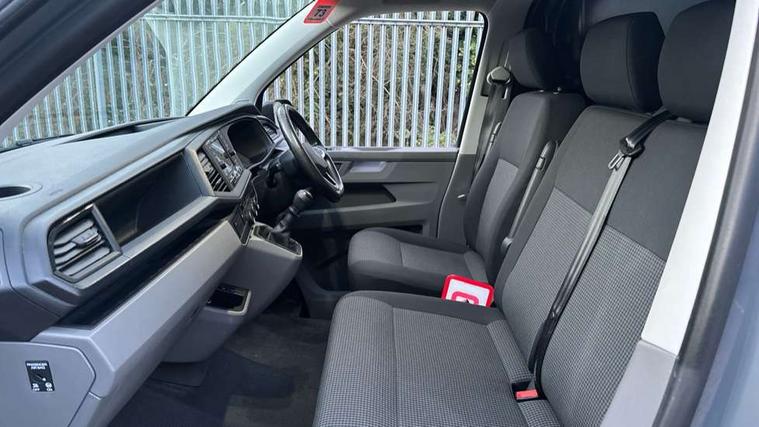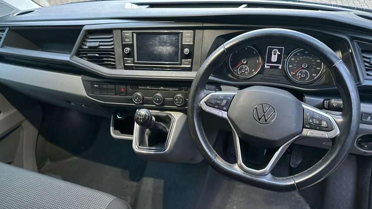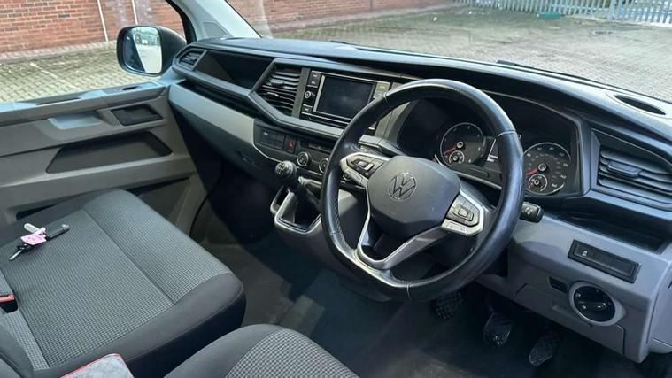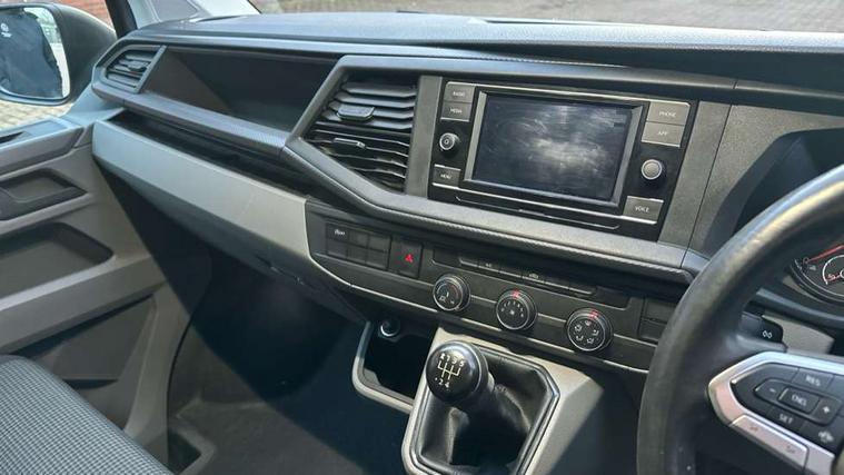 Cross wind assist, Dimmable illuminated instruments, Driver alert with Multi-function display plus, eCall emergency system, Forward collision warning front assist with autonomous emergency braking, Mobile phone interface, Multi function display plus with black and white display, 2 USB interfaces type C in dashboard, 4 speakers with 2 tweeters and 2 woofers, Composition colour radio with 6.5" touchscreen, Digital radio reception (DAB+), Volkswagen app connect, 4 stages windshield wiper intermittent control for windshield wipers, Closing rear wing door with unlatching from the inside, H7 twin halogen headlamps, Heat insulating glass (green) in cab and passenger/load compartment, Heat insulating windshield made of laminated glass, Left convex exterior mirror, Rear wing doors without window apertures, Right convex exterior mirror, Separate Daytime running lights, Transporter nameplate on the rear fender, Unpainted radiator grille with 2 chrome trims, 3 spoke leather wrapped multi function steering wheel, Comfort headliner in cab, hardboard roof trim in passenger and load compartment, Dust/pollen filter, Folding grab handles on roof frame, Front and rear left without window closed side panel in load compartment, Front seats on the right in 1st row of seat, Glove compartment without illumination, Heavy duty tool kit and jack, High partition, Interior plastic loading edge protection, LED Interior lighting in load and passenger compartment, Manual adjustable lumbar support for right single seat in 1st row seats, Standard lower part dashboard in palladium, Without breakaway interior rear view mirror, Without refrigerant, Without right side window apertures in passenger and load compartment, Non smoker pack - Transporter, 3 point height adjustable seat belts on outer seats cab with electric pretensioners, Driver and front passenger airbag with front passenger airbag deactivation, Warning buzzer and light for driver and front passenger seat belt not fastened, Without child safety lock in passenger compartment, Electronic immobiliser, Wheel bolts without wheel locks, 16" chassis with 16" brake system, Diesel particulate filter, Electronic stability control, ABS, ASR with deactivation button, hill start assist and brake assist system, Standard anti drum measures, Start/stop system with regenerative breaking,