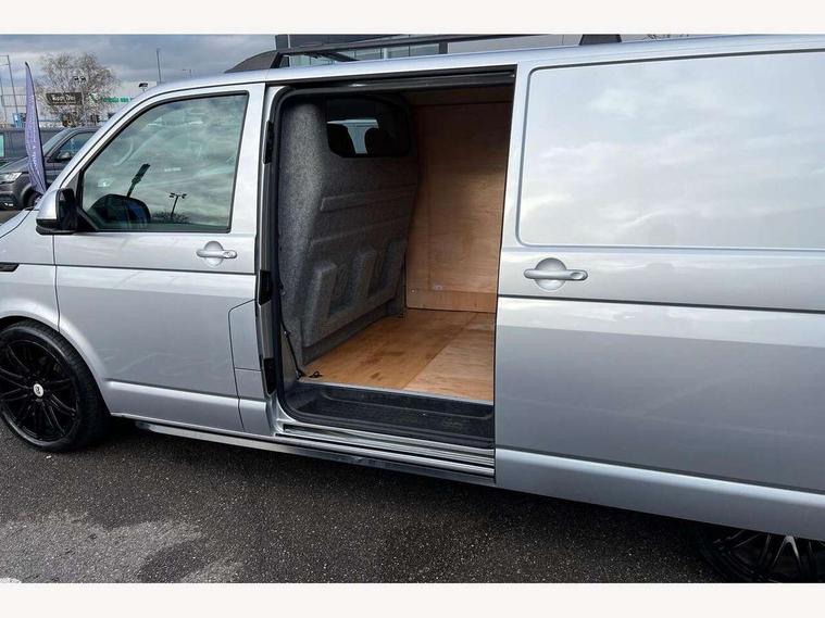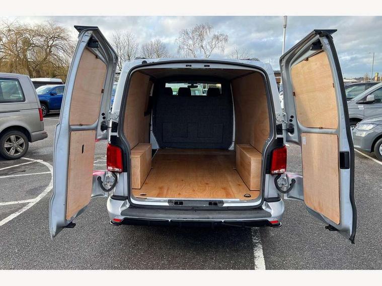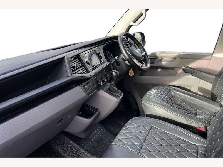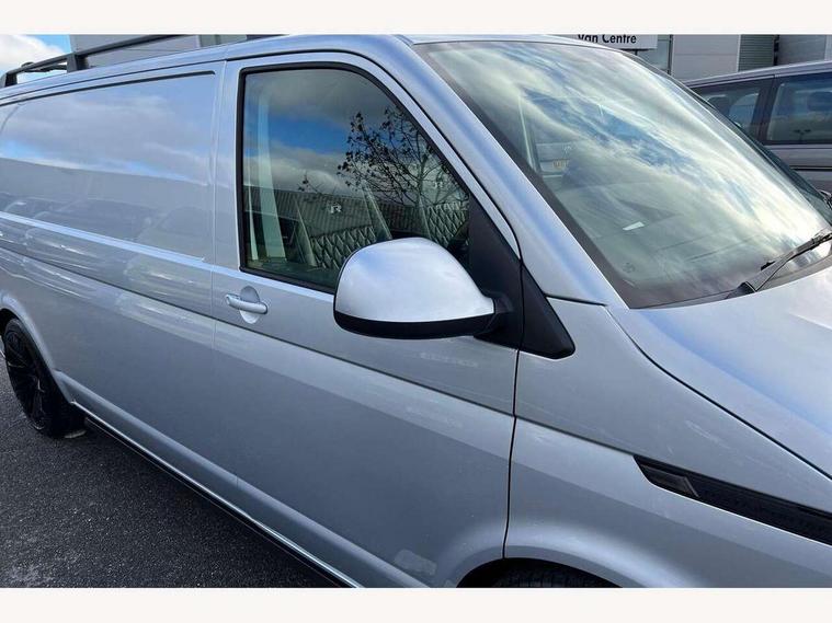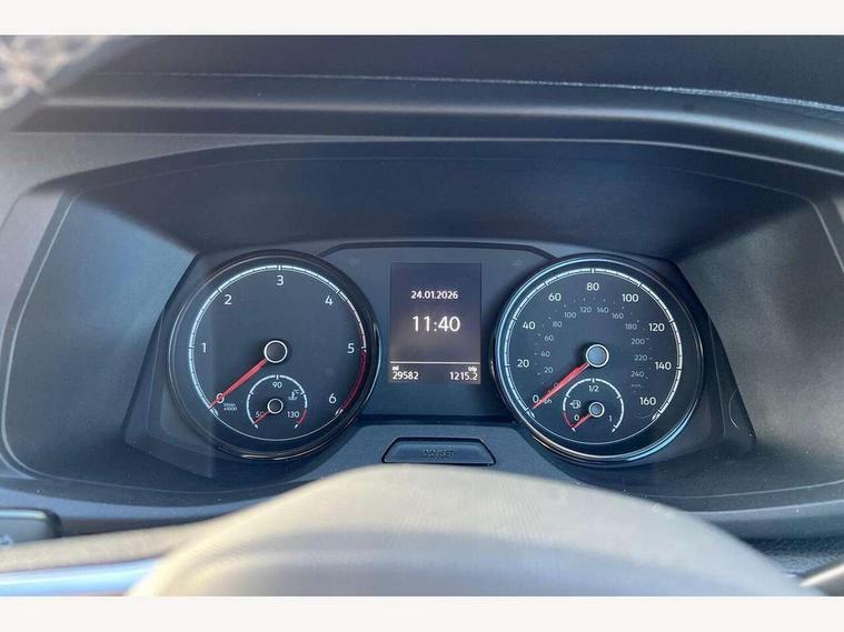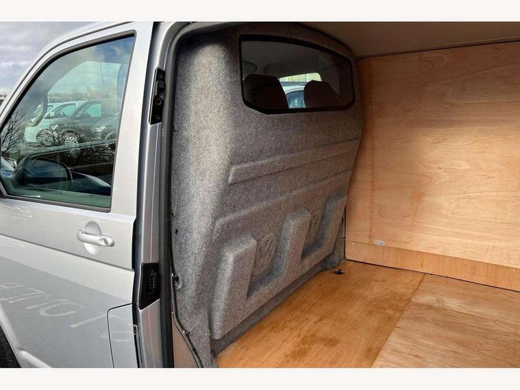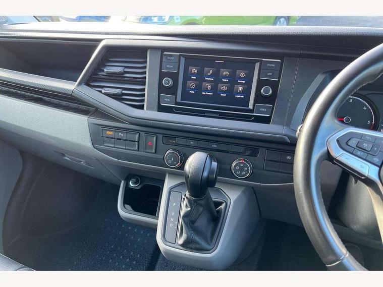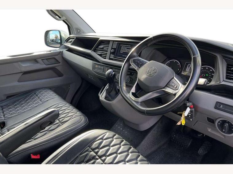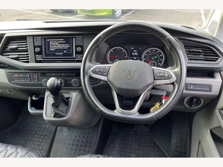 Adaptive cruise control, Cross wind assist, Dimmable illuminated instruments, Driver alert with Multi-function display plus, eCall emergency system, Forward collision warning front assist with autonomous emergency braking, Mobile phone interface, Multi function display plus with black and white display, 2 USB interfaces type C in dashboard, 4 speakers with 2 tweeters and 2 woofers, Composition colour radio with 6.5" touchscreen, Digital radio reception (DAB+), Volkswagen app connect, Automatic headlight control, leaving home and manual coming home feature, Closing rear wing door with unlatching from the inside, Front fog lamps with cornering light, Heat insulating glass (green) in cab and passenger/load compartment, Heated front windscreen, Left convex exterior mirror, Power folding adjustable door mirrors with separately heated, Radiator grille with 2 chrome trims, Rear wing doors without window apertures, Right convex exterior mirror, Transporter nameplate on the rear fender, Windshield wiper intermittent control with rain sensor for windshield wipers, 3 spoke leather wrapped multi function steering wheel, Auto dimming breakaway interior rear view mirror, Comfort headliner in cab, hardboard roof trim in passenger and load compartment, Dust/pollen filter, Front and rear left without window closed side panel in load compartment, Front seats on the right in 1st row of seat, Glove compartment with illumination, Heavy duty tool kit and jack, High partition, Interior plastic loading edge protection, LED Interior lighting in load and passenger compartment, Manual adjustable lumbar support for right single seat in 1st row seats, Refrigerant R134a, Standard lower part dashboard in palladium, Storage compartments on cab seats and reading light, Without right side window apertures in passenger and load compartment, Comfort pack - Transporter, Exterior pack without fog light- Transporter, Non smoker pack - Transporter, 3 point height adjustable seat belts on outer seats cab with electric pretensioners, Driver and front passenger airbag with front passenger airbag deactivation, Warning buzzer and light for driver and front passenger seat belt not fastened, Without child safety lock in passenger compartment, Anti theft alarm system with interior monitoring in cab, backup horn and towing protection, Lockable wheel bolts, 16" chassis with 16" brake system, Diesel particulate filter, Electronic stability control, ABS, ASR with deactivation button, hill start assist and brake assist system, Start/stop system with regenerative breaking, 16" Clayton alloy wheels,