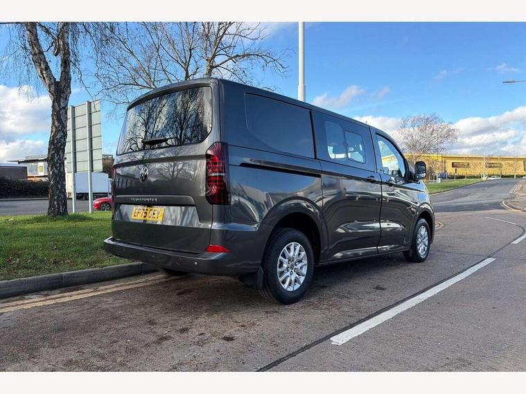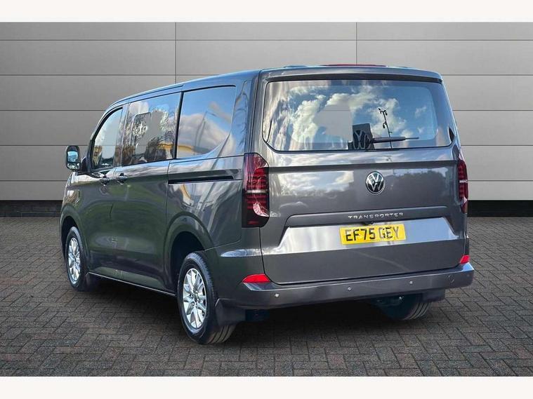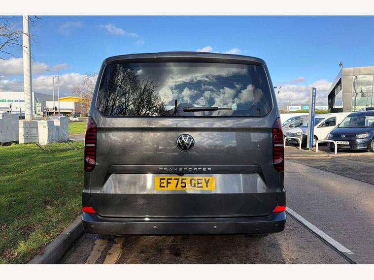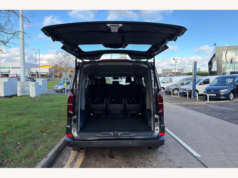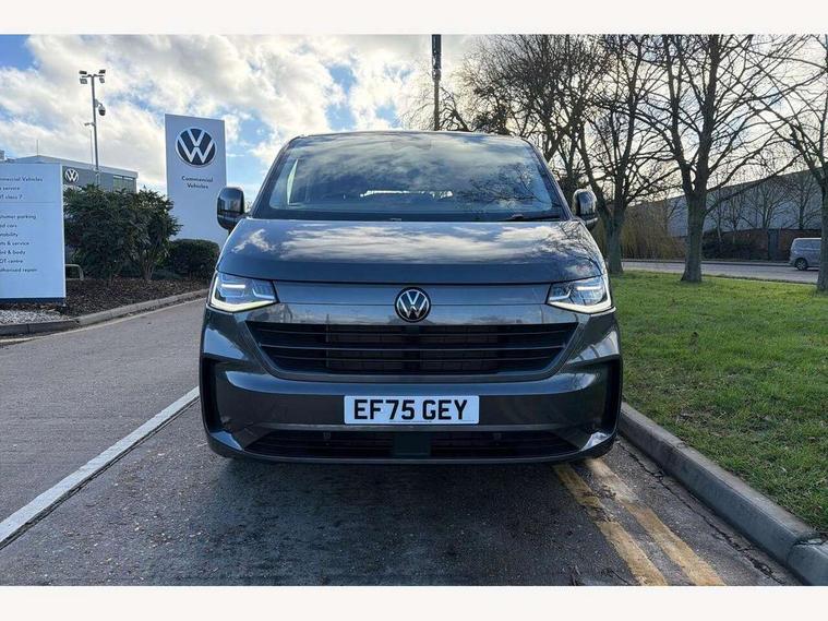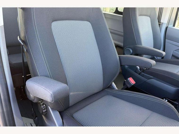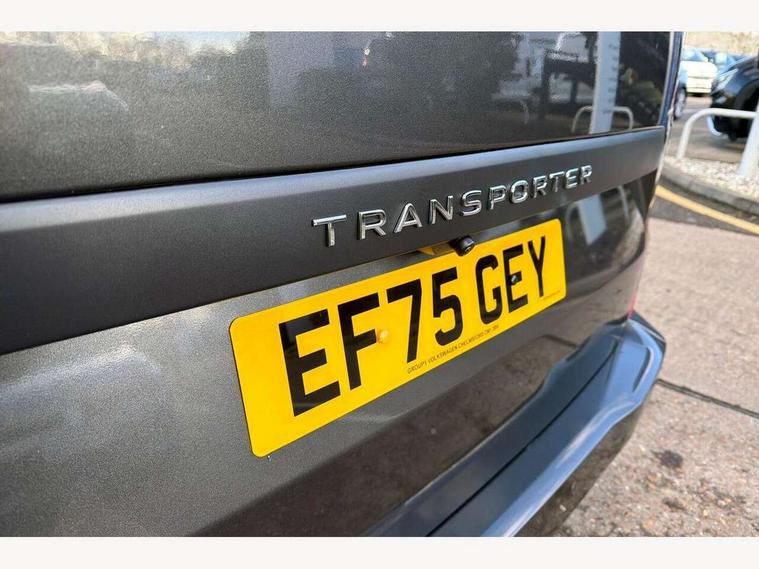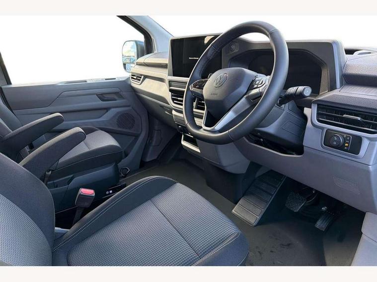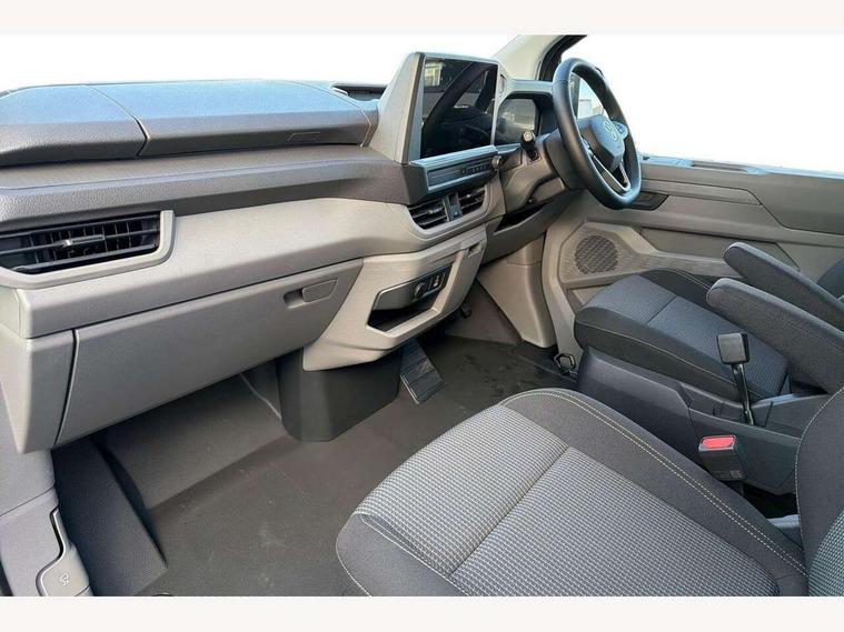 12" digital drivers display, 13" touchscreen infotainment display with wireless app connect and DAB radio, 5G Modem, Cruise control with predictive speed limiter, Dynamic road sign display, eCall emergency system, Front collision warning with braking, Identification label for N1 commercial vehicle registration, Lane assist, PAS, Preparation of VW connect and connect plus, Wrong way driver warning, 6 speakers, Body coloured add on parts, Body coloured door handles, Dual sliding doors with pop-out window vents (left and right) for 2nd row, Mud flaps front and rear, Rear tailgate, Rear Transporter nameplate in black grained decorative trim, Rear window wiper with washer system, Sliding doors on driver and front passenger side, Vehicle opening configuration 1x 1st row of seats, 2x all doors, 12 pin terminal block, 2 LED lights in roof of load compartment, 3 single seats in 2nd row, folding and tumbling, 2x isofix and top tether, 4 tie downs for securing goods in the passenger/load compartment, 4 way height and tilt adjustable head restraints, Black plastic scuff plate for sliding door in cargo, illuminated, Black plastic scuff plate in front without illumination, Covers in the bottom area of all side panels and doors in the load compartment, Dimming breakaway interior rear view mirror, Gear selector lever on steering wheel, LED light units for cab and passenger compartment, Overhead storage compartment, Single driver and single passenger seat in cab, Striped fabric upholstery, Without bulkhead, Without floor covering in load compartment, Driver and front passenger airbag with front passenger airbag deactivation, Dual tone horn, Seat belt pretensioner for front seats, Side and curtain airbags in cab curtain airbags in passenger compartment, Anti theft alarm system with interior monitoring in cab, backup horn and towing protection, Central locking, Preparation for alcohol ignition interlock, 5+ Promise, Alternator - 230A, Electronic Stability Control (ESC),