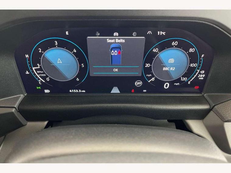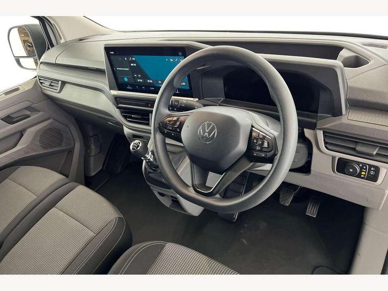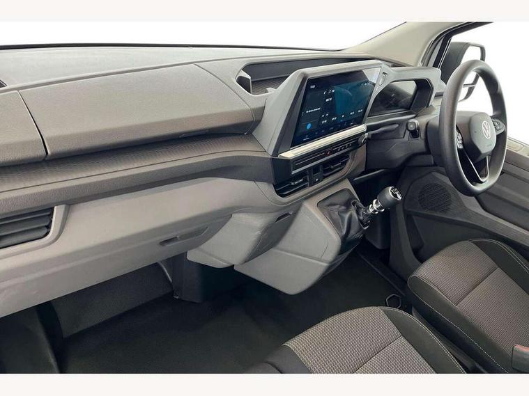 12" digital drivers display, 13" touchscreen infotainment display with wireless app connect and DAB radio, 5G Modem, Apple CarPlay and Android Auto, Cruise control, Dynamic road sign display, eCall emergency system, Electromechanical speed sensitive power steering, height and longitudinally adjustable steering column, Lane assist, Preparation of VW connect and connect plus, Wrong way driver warning, 4 speakers - 2x dashboard, 2x cab doors, Grained black door handles, Heat reflecting side window glass, High beam control, Laminated windshield made of heat-reflecting glass, LED rear combination lamps, Rear Transporter nameplate in black grained decorative trim, Vehicle opening configuration 1x 1st row of seats, 2x all doors, 2x 15-W USB data/charging ports in dashboard and 1x USB-C, 1x USB-A center bottom, 2x LED lights in load compartment, 4 way height and tilt adjustable head restraints, Black plastic scuff plate for sliding door in cargo without illumination, Cabin interior lighting, Lashing rings for reinforced floor covering, Narrow centre console with cup holder and compartment for mobile phone, Overhead storage compartment, Plastic gear lever, Roof grab handle on front passenger side, Rubber floor covering in cab, Standard glove compartment, Striped fabric upholstery, Without passenger seats in load compartment, Exterior pack 1 - Transporter, Interior trim pack - Transporter, Driver and front passenger airbag with front passenger airbag deactivation, Dual tone horn, Front and curtain airbags for driver and front passenger, Seat belt pretensioner for driver seat, Electronic immobiliser, Preparation for alcohol ignition interlock, 5+ Promise, Alternator - 230A, Electronic stability control, ABS, ASR with deactivation button, hill start assist and brake assist system,