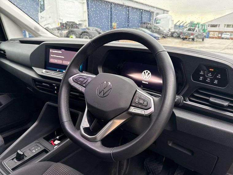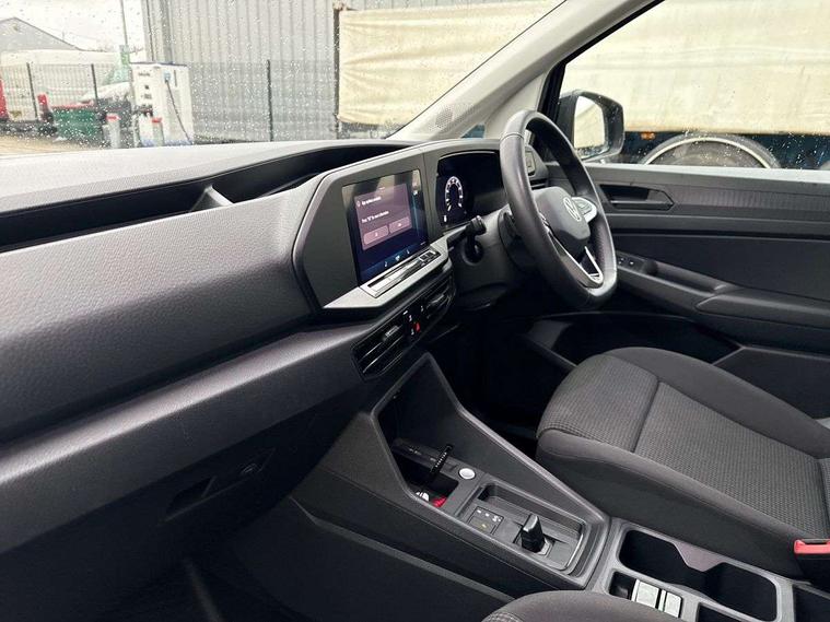 Bluetooth - Mobile phone interface, Car2X technology, Driver alert system, eCall emergency system, Intelligent Speed Assist, Lane assist, Seatbelt warning indicator, Service indicator, Start-stop system with regenerative braking, 2 USB interfaces type C in dashboard, App-Connect - Wireless for Apple CarPlay, DAB Radio, We Connect Plus Preparation, Automatic hazard light activation under emergency braking, Black painted exterior mirror housings, body-colored door handles and Silver sliding door rail, Body coloured bumpers, Electric front windows, LED rear combination lights, LED rear tail lights, Roof rail preparation, Windscreen wiper with variable intermittent delay and wash-wipe system, Dimming breakaway interior rear view mirror, Electronically controlled heating system, ergoComfort seats for driver, Interior light in headliner incorporting LED technology, Lockable glove compartment door with light, Manual heating and ventilation system, Manual height adjustment for front seats and seat cushion inclination and depth adjustment on drivers seat, Multi function leather steering wheel, Power-adjustable lumbar support for drivers seat, Reach and rake adjustable steering column, Six lashing points for securing loads, Steering wheel paddle shift, Storage compartments under driver and front passenger seats, Sun visors with mirror, airbag label on front passenger sun visor, Winter pack plus - Caddy, 3-point seat belts in front, with pretensioner and height adjustment, Driver and front passenger airbag with front passenger airbag deactivation, Tyre pressure monitoring system, Anti-theft alarm system, interior monitoring, backup horn, and towing protection, Electronic engine immobiliser, Remote central locking with deadlocks, interior locking, Anti locking braking system (ABS), Automatic post collision braking system, Brake assist, Diesel particulate filter, Electric parking brake with auto hold function, Electronic brake force distribution (EBD), Electronic differential lock (EDL), Electronic stabilisation programme (ESP), Engine drag torque control (MSR), Hill hold assist, Traction control system (TCS), Decorative beige birch vein inserts, Wheel bolts with anti-theft protection (unlockable),