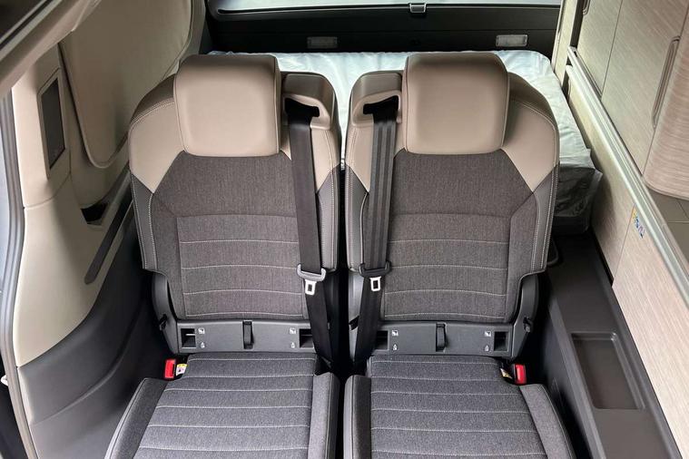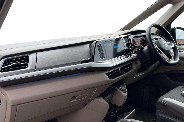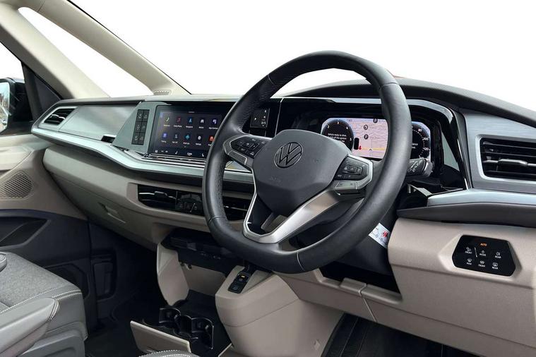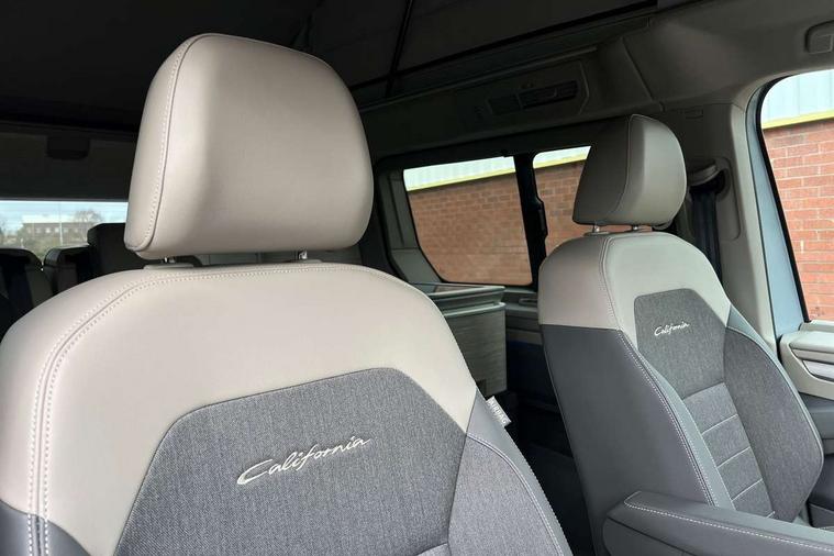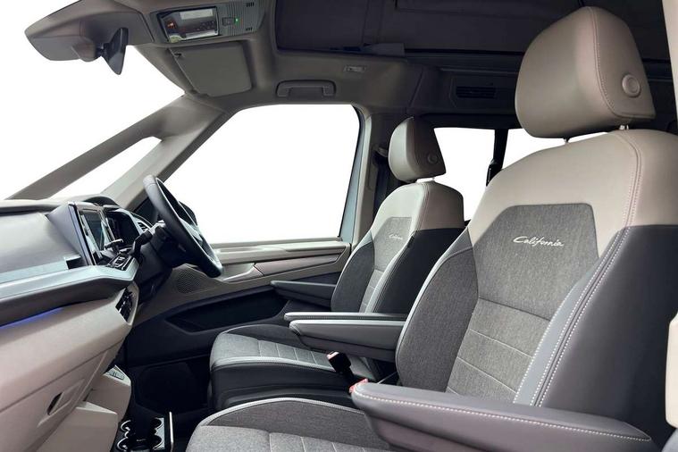 Advanced driver attention and drowsiness monitor, California on tour app, Digital cockpit pro, Discover Pro Navigation system, Driving profile selection, Dynamic road sign display, eCall emergency system, Emergency assist, Front cross traffic assist, Function control unit, IDA voice assistant and voice enhancer, Lane keeping system Lane Assist, Mobile phone interface, Motorhome Registration, Multifunction camera, PAS, Preparation for online services, Preparation for We connect and We connect plus, Servotronic speed sensitive power steering, Speed limiter and predicative speed limiter, Tailgate latching without unlatching function from inside, Tailgate with window aperture and with power latching, Travel assist, Turn assist with evasive assistance, Volkswagen wired and wireless app connect, Alternator 180A, 2nd and 3rd auxiliary batteries with low -voltage converter, Battery 380 A (68 Ah), Battery without capacity specification, Standard battery/generator, Standard suspension and shock absorption, 10.4 inch infotainment system with scalable module options, 2 USB-C ports at the front, 4 USB-C charging sockets in the passenger compartment, 8 Speakers, Digital radio reception (DAB), Dynamic headlight range control, Electro hydraulic elevating roof, with three windows including one front passengers panorama opening, canvas in Basalt Grey, Four speed control for windscreen wipers, Gloss black grille with 2 illuminated chrome trim, Heat and sound insulating laminated safety glass windshield, Heated windscreen, High gloss black door mirrors, Illuminated molding between headlamps, LED 3rd brake light, Nameplate set California, Poor weather light including cornering light, Rear boot, Red LED tail lights, Sliding window in front with fly screen in passenger compartment left/right & including privacy glass in rear, Windscreen wiper intermittent control, 2 single seats with integrated seatbelt and sleeping mat, 230V external inlet with charging feature for vehicle batteries, 230V inverter with socket on driver seat, Additional interior noise attenuation, Ambient interior lighting, Armrest on front swivel seats in both sides with electric lumbar support, Camper parking heater for continuous operation & parking heater for windshield defrosting with radio remote control, Darkening roller blinds and thermo mats, Drawers under the outer seats in the cab and passenger compartment & 2 waste bins, Front and rear headrests, Heated front seats, Heated steering wheel, Kitchen with outdoor folding table for cooking and roof storage box in décor 2, Lockable glove compartment with lighting, Luggage compartment with power latching, Multifunction leather steering wheel with paddle shifters, Reinforced plastic floor covering in wood look, Single front passenger seat, Storage compartment left and right 1st row of seats, Summer kitchen with outside folding table and 230-V outlet for cooking and roof storage box, Surround lighting in door area, Swivel seat on left with height adjustable including drawer, Swivel seat on right with height adjustable including drawer, Velour floor mats in cab, Without loading edge protection, Without luggage compartment cover, Advanced assistance pack - California, Top package - California, 2x3 point automatic seatbelts at the rear outside with ECE label, with/without belt tensioner, Autonomous emergency braking, Child locks, Driver and front passenger airbags with front passenger airbag deactivation button, First aid kit with warning triangle and safety vest, Front Assist with pedestrian and cyclist detection, Front disc brakes, Height adjustable three point automatic seatbelts at front with belt and end fitting tensioners, Occupants detection only display, Side and curtain airbags for driver and front passenger, curtain airbags for outer seats in rear, centre airbag in front, Swerve support and oncoming vehicle braking when turning, Tyre pressure loss indicator, Warning signal and warning lamp for front and rear seat belts not fastened, Anti theft alarm system with interior monitoring in cab, backup horn and towing protection, Central locking + keyless locking and starting system Keyless Advanced with safe lock, Lockable wheel bolts, Preparation for alcohol interlock, 5+ Promise service plan, Dark silver brushed decorative inlays, 235/50 R18 tyres with low rolling resistance, Tool kit, Trims for alloy wheels, Tyre mobility kit, Without spare wheel,