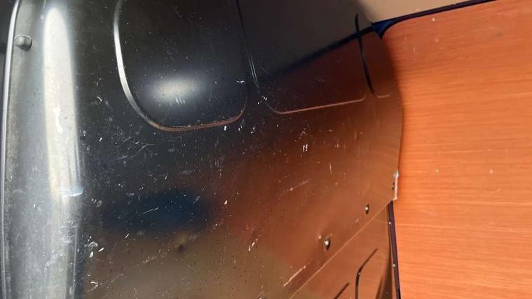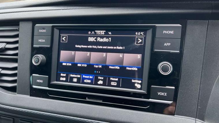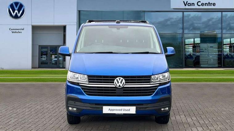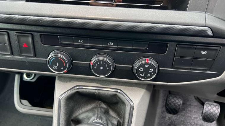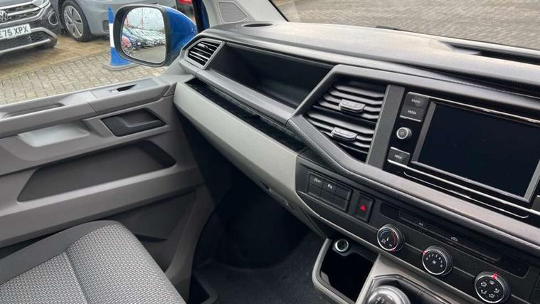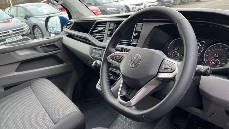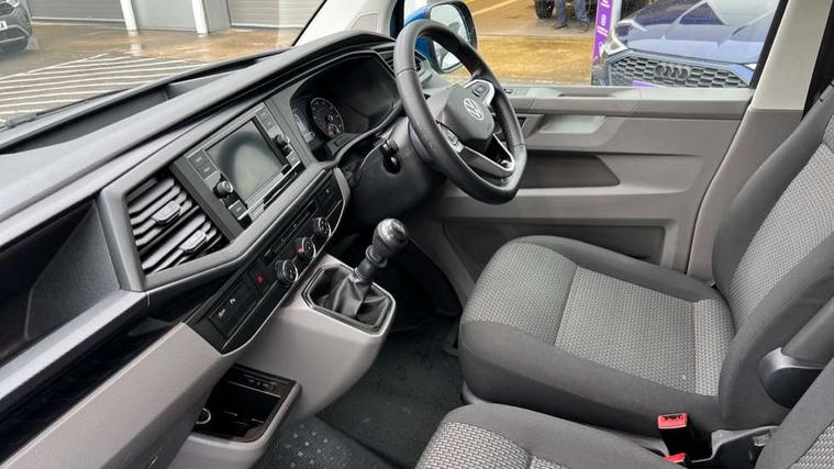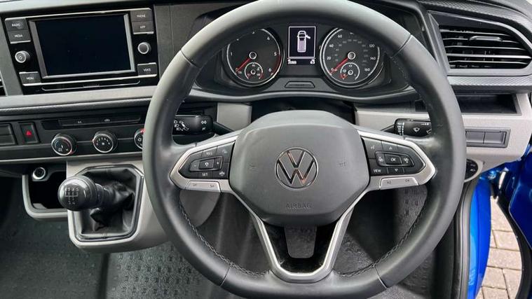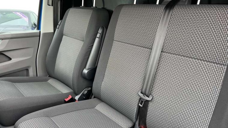 Adaptive cruise control, Cross wind assist, Dimmable illuminated instruments, Driver alert with Multi-function display plus, eCall emergency system, Forward collision warning front assist with autonomous emergency braking, Mobile phone interface, Multi function display plus with black and white display, 2 USB interfaces type C in dashboard, 4 speakers with 2 tweeters and 2 woofers, Composition colour radio with 6.5" touchscreen, Digital radio reception (DAB+), Volkswagen app connect, Automatic headlight control, leaving home and manual coming home feature, Closing rear wing door with unlatching from the inside, Front fog lamps with cornering light, Heat insulating glass (green) in cab and passenger/load compartment, Heated front windscreen, Left convex exterior mirror, Power folding adjustable door mirrors with separately heated, Radiator grille with 2 chrome trims, Rear wing doors without window apertures, Right convex exterior mirror, Transporter nameplate on the rear fender, Windshield wiper intermittent control with rain sensor for windshield wipers, 3 spoke leather wrapped multi function steering wheel, Auto dimming breakaway interior rear view mirror, Comfort headliner in cab, hardboard roof trim in passenger and load compartment, Dust/pollen filter, Front and rear left without window closed side panel in load compartment, Front seats on the right in 1st row of seat, Glove compartment with illumination, Heavy duty tool kit and jack, High partition, Interior plastic loading edge protection, LED Interior lighting in load and passenger compartment, Manual adjustable lumbar support for right single seat in 1st row seats, Refrigerant R134a, Standard lower part dashboard in palladium, Storage compartments on cab seats and reading light, Without right side window apertures in passenger and load compartment, Comfort pack - Transporter, Exterior pack without fog light- Transporter, Non smoker pack - Transporter, 3 point height adjustable seat belts on outer seats cab with electric pretensioners, Driver and front passenger airbag with front passenger airbag deactivation, Warning buzzer and light for driver and front passenger seat belt not fastened, Without child safety lock in passenger compartment, Anti theft alarm system with interior monitoring in cab, backup horn and towing protection, Lockable wheel bolts, 16" chassis with 16" brake system, Diesel particulate filter, Electronic stability control, ABS, ASR with deactivation button, hill start assist and brake assist system, Start/stop system with regenerative breaking, 16" Clayton alloy wheels,