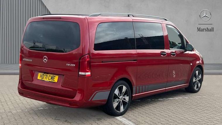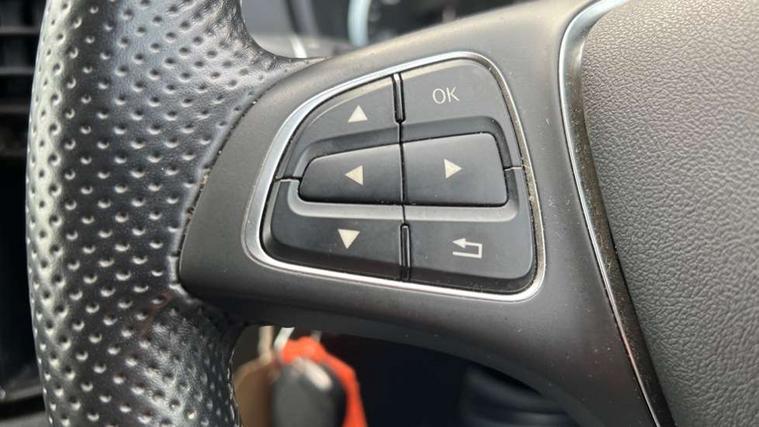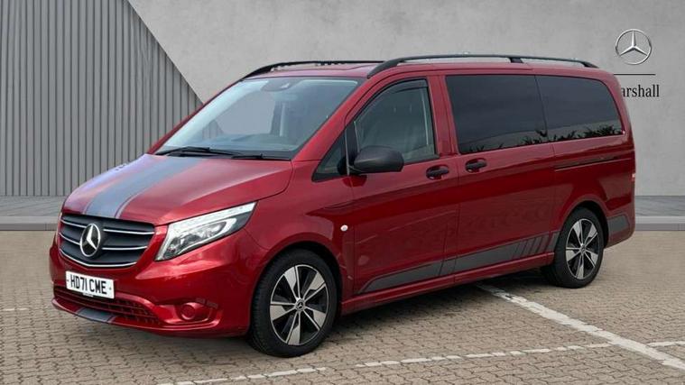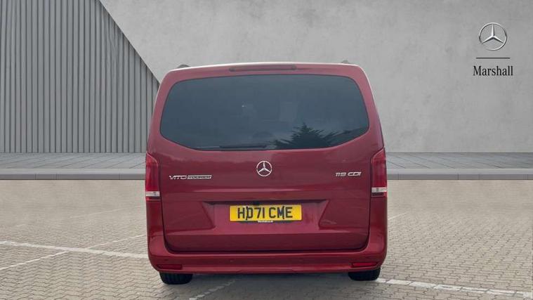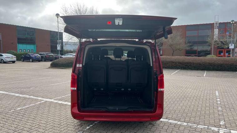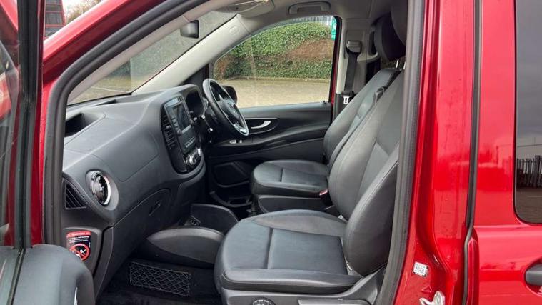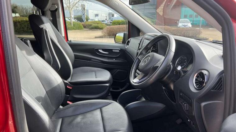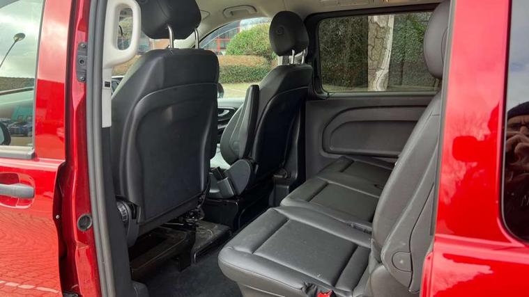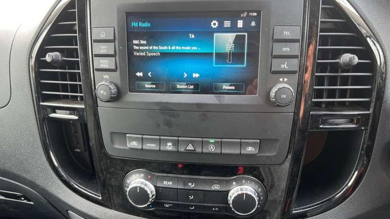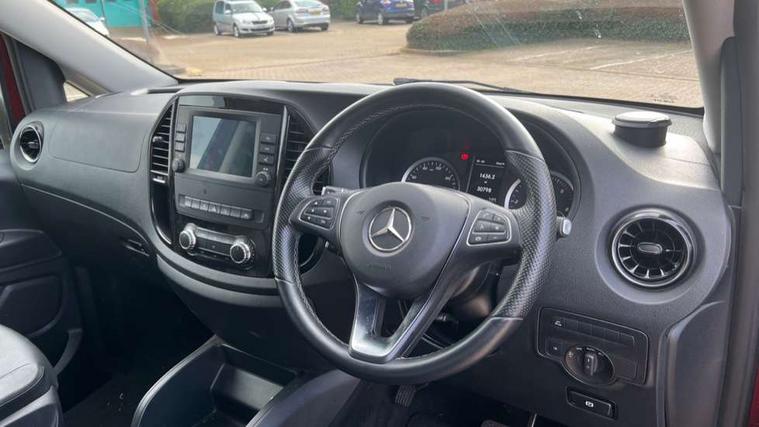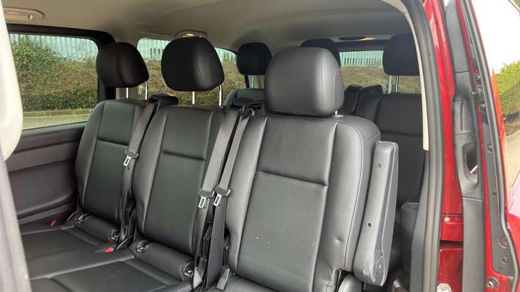 Adjusted look instrument cluster, ASSYST - Servicing counter, Bluetooth hands free kit, Comfort overhead control panel, Cruise control with speed limiter, Digital clock, Headlight range control, Mercedes PRO connect module, PAS, Rescue assist, Rev counter, SD card slot, Seatbelt warning indicator, Tyre pressure monitor, Warning lights, Washer fluid level indicator, 2 speakers, Audio 40 with 7" touchscreen, DAB+, navigation, smartphone integration via apple carplay/android auto, bluetooth with audio streaming+hands free, 2 USB, Aux input socket, Active retainer for sliding door, Adaptive brake lights, AMG side skirts, Black tinted windows in rear, Body coloured door handles, Bonnet and Side sill graphics, Chrome radiator grille, Colour coded front and rear bumpers, Daytime running lights, Electric front windows, Electrically heated and adjustable door mirrors, Electrically operated side loading doors, Fixed window in left side door, Fixed window in right side door, Heat insulating glass, Heated windscreen washer system, LED intelligent light system, LED tail lamps, Rain sensor with headlight assistant and heat insulating glass, Roof rails, Third rear brake light, 8 way adjustable drivers seat, Ambient interior lighting, Armrests for crew/passenger compartment, Ashtray, Cab interior lighting, Centre console + drinks holder, Chrome interior details, Cigarette lighter, Comfort driver seat with armrest and 4 way adjustable headrests, Comfort rear passenger bench seat (1st row) with tilt/removable outer seat, Comfort rear passenger bench seat (2nd row) with tilt/removable outer seat, Driver's seat lumbar support, Electrical auxiliary demister heating elements, Front carpets, Front door storage pockets, Front grab handles, Grab handles in rear, Heated front seat, Heating/cooling air duct to passenger compartment, Leatherette upholstery, LED reading lights with illumination in rear grab handle, Load lashing rings, Locking glovebox, Lumbar support for co-driver seat, Moulded ergonomic facia, Multi function leather steering wheel, Multi-part full side wall panelling, Paddle shift, Quick release attachment system for seat rows, Reach and rake adjustable steering wheel, Rear carpets, Rear tempmatic air conditioning, Seat rail system, Sun visors with Illuminated vanity mirrors, Tool kit under drivers seat, Velour floor mats, Anti theft protection pack - Vito Tourer, Chrome interior appointments pack - Vito Tourer, Mirror pack - Vito Tourer, Parking pack - Vito Tourer, 3 point seatbelts for all seats, Attention assist, Crosswind assist, Driver and passenger seatbelt tensioners, Driver and passenger window airbags, Driver thorax airbag, Driver's airbag, Front passenger airbag deactivation, Isofix child seat preparation, Passenger airbag, Central locking with remote control, Double lock, Electronic immobiliser, ABS/ESP/ASR, Active brake assist, Diesel particulate filter, EBV and BAS, Hill start assist, Mechanical parking brake, Sports suspension, Traction control, Uprated gross vehicle weight (GVW) - 3100kg, Uprated heavy duty battery - 95Ah, Spare wheel,
