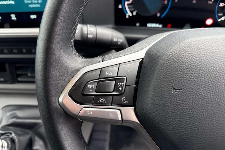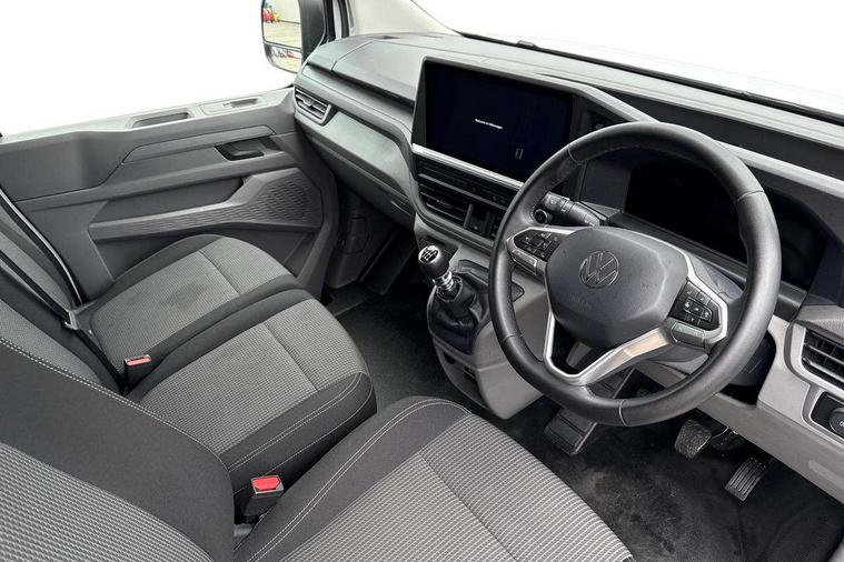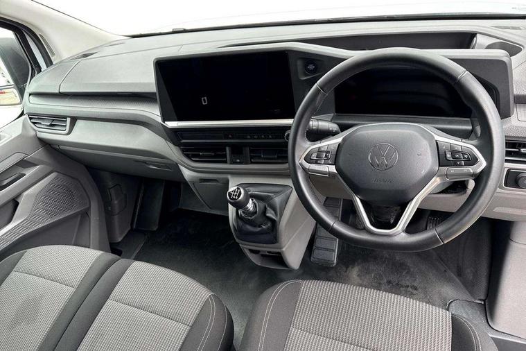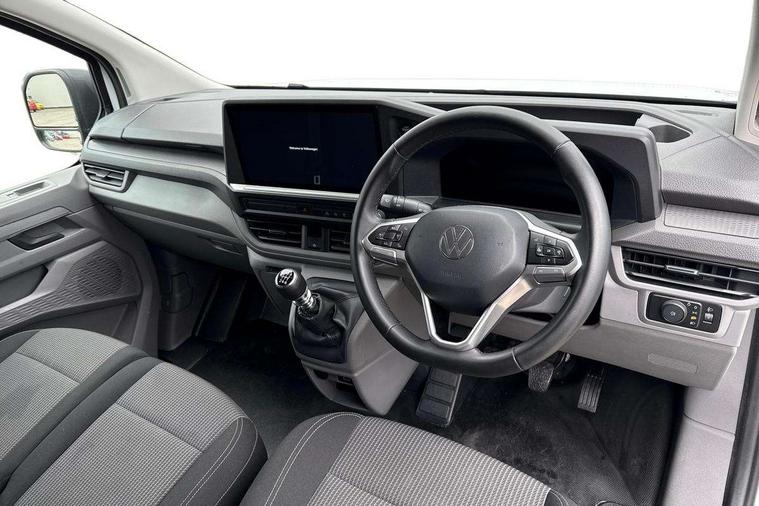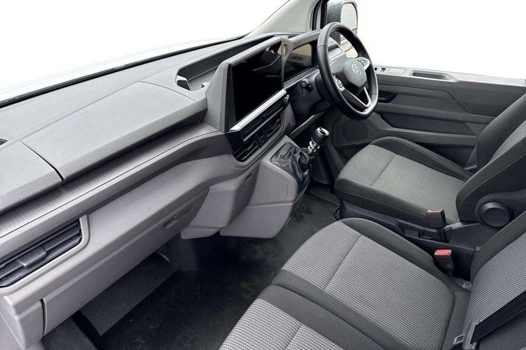 12" digital drivers display, 13" touchscreen infotainment display with wireless app connect and DAB radio, 5G Modem, Apple CarPlay and Android Auto, Cruise control, Dynamic road sign display, eCall emergency system, Electromechanical speed sensitive power steering, height and longitudinally adjustable steering column, Lane assist, Preparation of VW connect and connect plus, Wrong way driver warning, 4 speakers - 2x dashboard, 2x cab doors, Body coloured door handles, Heat reflecting side window glass, Mud flaps front and rear, Rear Transporter nameplate in black grained decorative trim, Vehicle opening configuration 1x 1st row of seats, 2x all doors, 2x 15-W USB data/charging ports in dashboard and 1x USB-C, 1x USB-A center bottom, 2x LED lights in load compartment, 3 spoke leather wrapped multi function steering wheel, 4 way height and tilt adjustable head restraints, Black plastic scuff plate for sliding door in cargo without illumination, Cabin interior lighting, Lashing rings for reinforced floor covering, Leatherette gear lever, Narrow centre console with cup holder and compartment for mobile phone, Overhead storage compartment, Roof grab handle on front passenger side, Rubber floor covering in cab, Striped fabric upholstery, Without passenger seats in load compartment, Driver and front passenger airbag with front passenger airbag deactivation, Dual tone horn, Front and curtain airbags for driver and front passenger, Seat belt pretensioner for driver seat, Anti theft alarm system with interior monitoring in cab, backup horn and towing protection, Electronic immobiliser, Preparation for alcohol ignition interlock, 5+ Promise, Alternator - 230A, Electronic stability control, ABS, ASR with deactivation button, hill start assist and brake assist system,