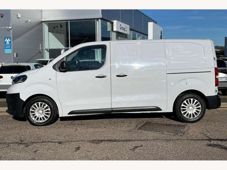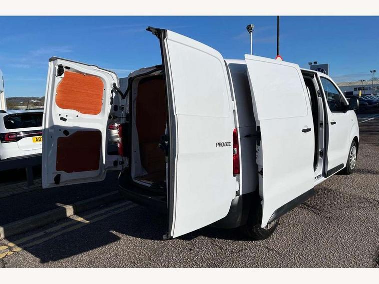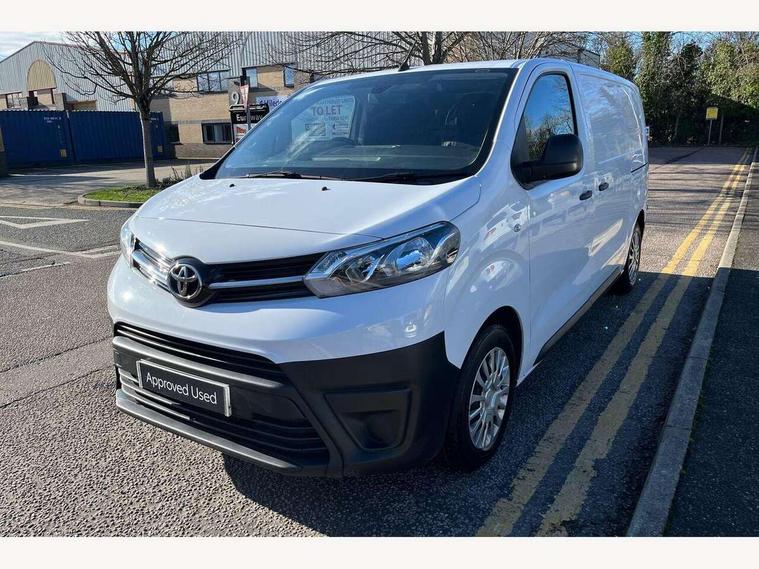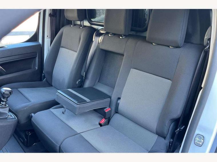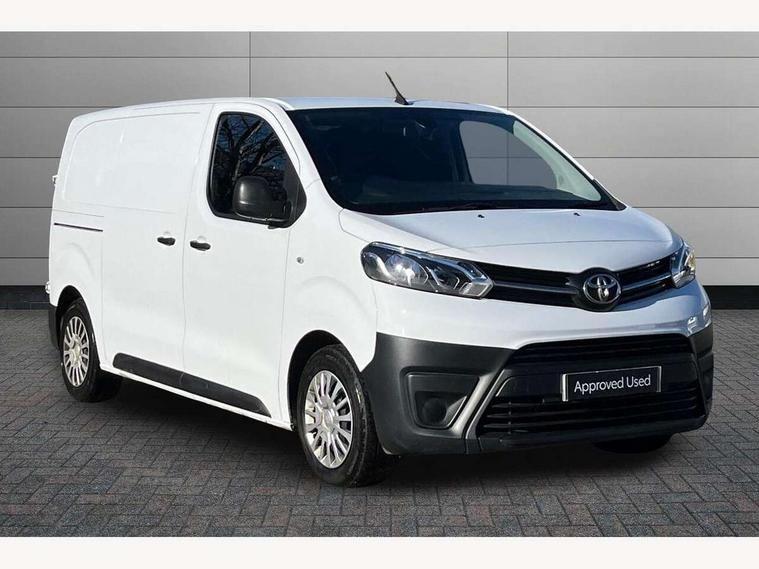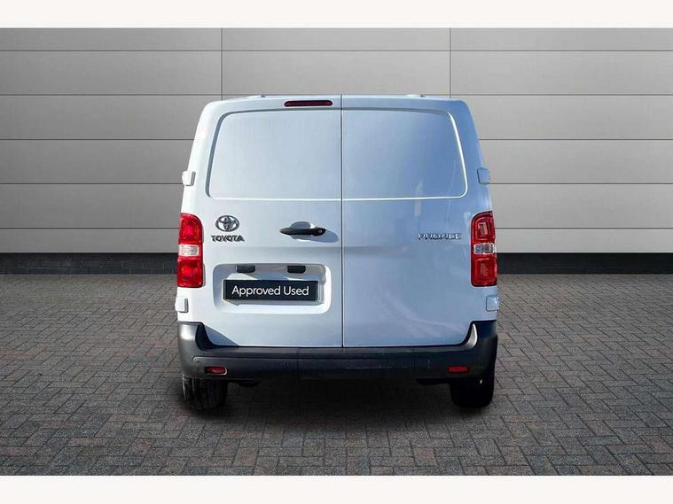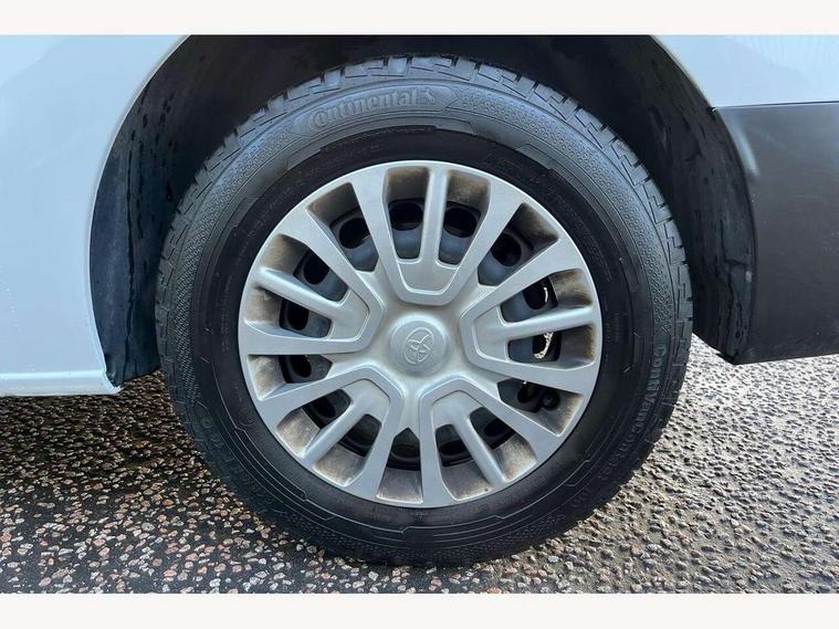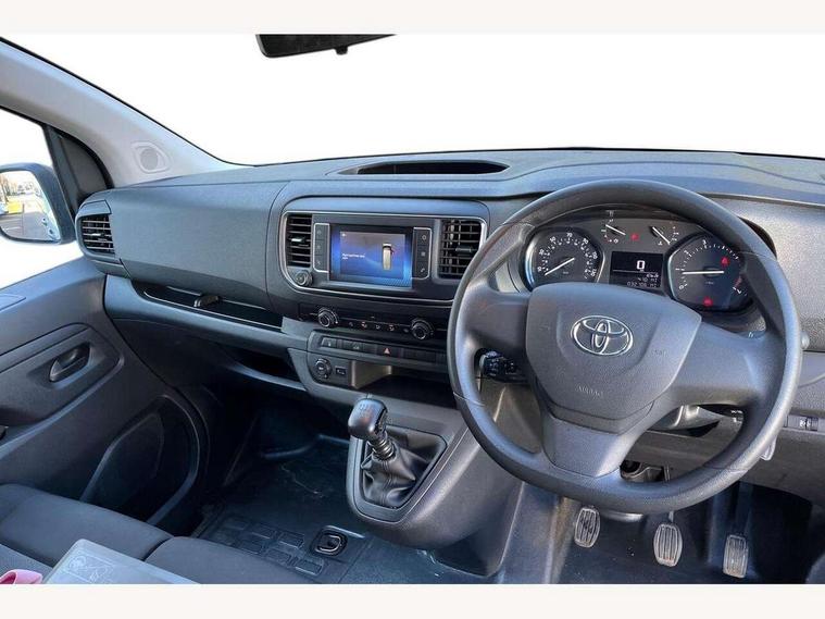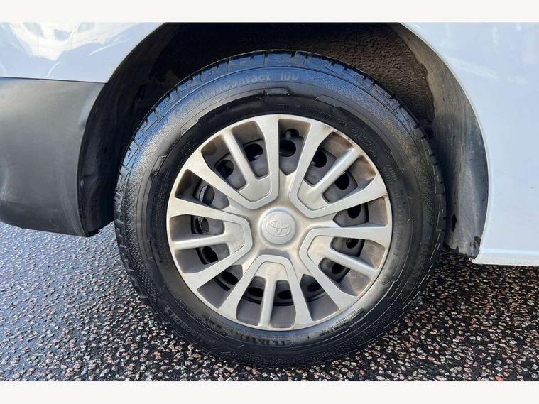 Bluetooth handsfree connectivity, Cruise control, PAS, Tyre pressure warning system (TPWS), 4 speakers, Digital radio (DAB), Radio/CD player, USB connector, 180 degree opening rear doors, Acoustic windscreen, Auto Headlights, Auto wipers, Black bumpers, Black door handles, Black protection moulding on side door, Body Coloured roof, Daytime running lights, Front power windows, Headlight cut-off reminder, Heated door mirrors, LED High mounted stop light, Manually adjustable day/night rear view mirror, Multi reflector halogen headlights, Panel rear wing doors, Power adjustable door mirrors, Rear combination lights, Short Antenna, Smoke tinted (30%) privacy glass on rear passenger window, Two manual sliding side doors, 2 seat front passenger bench, Driver seat armrest, Fabric seats, Front cup holders, Front room lights, Glovebox light, LED Driver and front passenger personal lights, Lighted and chilled upper glove box, Manually reclining and sliding driver and front passenger seats, Open upper dashboard storage compartment, Panel bulkhead with window and protective grille, Storage under passenger bench, Air conditioning and Smart cargo pack - Proace, Parking pack - Proace, Double front passenger airbag, Front passenger airbag on/off switch, Supplement restraint system (SRS) 2 airbags, Alarm, Deadlocks + 2 remote keys, Power door locks, 12V power front outlet, 12v socket in dashboard and rear, Adjustable speed limiter (ASL), Anti lock braking system (ABS), Brake Assist (BA), Stop/start function, Toyota traction select, Vehicle stability control (VSC) and hill start assist control (HAC), Full size spare wheel, Full wheel covers,