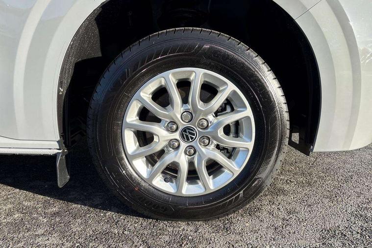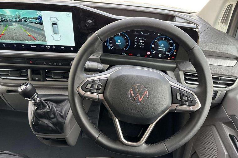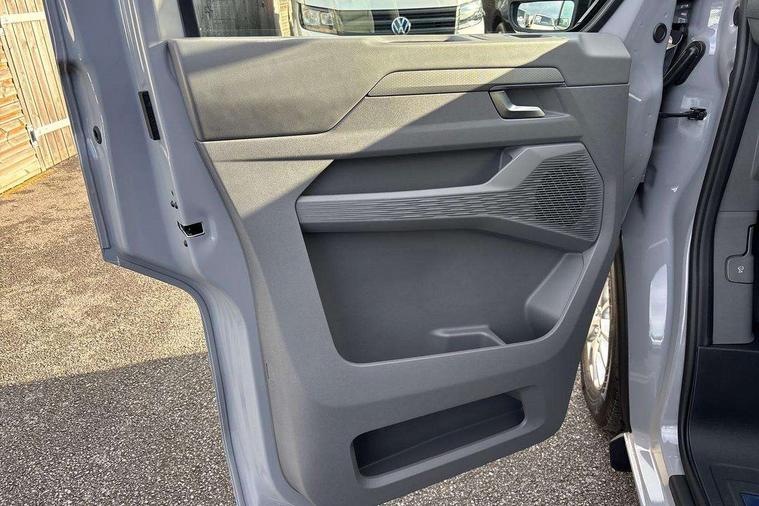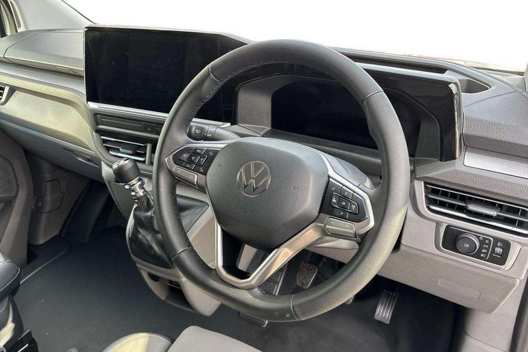 12" digital drivers display, 13" touchscreen infotainment display with wireless app connect and DAB radio, 5G Modem, Adaptive cruise control, Apple CarPlay and Android Auto, Dynamic road sign display, eCall emergency system, Electromechanical speed sensitive power steering, height and longitudinally adjustable steering column, Lane and blind spot assist with exit warning system, Preparation of VW connect and connect plus, Wireless mobile phone charging, Wrong way driver warning, Body colour bumpers, Body coloured door handles, Body coloured door mirrors, Body coloured radiator grille, Electrically heated, adjustable and folding door mirrors, Heat reflecting side window glass, Mud flaps front and rear, Rear Transporter nameplate in black grained decorative trim, Vehicle opening configuration 1x 1st row of seats, 2x all doors, 12V outlet in centre console and 12V outlet on rear right D-pillar, 2x 15-W USB data/charging ports in dashboard and 1x USB-C, 1x USB-A center bottom, 2x LED lights in load compartment, 3x additional super bright LED lights in load compartment, 4 way height and tilt adjustable head restraints, 5 additional USB-C charging ports, Black plastic scuff plate for sliding door in cargo without illumination, Cabin interior lighting, Glasses compartment in driver side roof, Grab handle on A-pillar passenger side, Illuminated lockable glovebox, Lashing rings for reinforced floor covering, Leatherette gear lever, Narrow centre console with cup holder and compartment for mobile phone, Overhead storage compartment, Rubber floor covering in cab, Striped fabric upholstery, Without passenger seats in load compartment, Driver and front passenger airbag with front passenger airbag deactivation, Dual tone horn, Front and curtain airbags for driver and front passenger, Seat belt pretensioner for driver seat, Anti theft alarm system with interior monitoring in cab, backup horn and towing protection, Electronic immobiliser, Lockable wheel bolts, Preparation for alcohol ignition interlock, 5+ Promise, Alternator - 230A, Electromechanical brake booster, Electronic stability control, ABS, ASR with deactivation button, hill start assist and brake assist system,