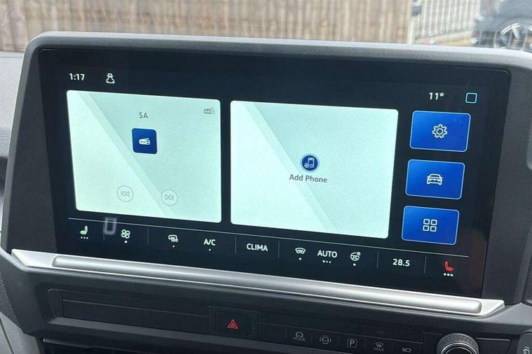 12" digital drivers display, 13" touchscreen infotainment display with wireless app connect and DAB radio, 5G Modem, Adaptive cruise control, Apple CarPlay and Android Auto, Dynamic road sign display, eCall emergency system, Electromechanical speed sensitive power steering, height and longitudinally adjustable steering column, Lane and blind spot assist with exit warning system, Preparation of VW connect and connect plus, Traffic jam assist, Wireless mobile phone charging, Wrong way driver warning, Body colour bumpers, Body coloured door handles, Body coloured door mirrors, Body coloured radiator grille, Electrically heated, adjustable and folding door mirrors, Heat reflecting side window glass, Mud flaps front and rear, Rear Transporter nameplate in black grained decorative trim, Vehicle opening configuration 1x 1st row of seats, 2x all doors, 12V outlet in centre console and 12V outlet on rear right D-pillar, 2x 15-W USB data/charging ports in dashboard and 1x USB-C, 1x USB-A center bottom, 2x LED lights in load compartment, 3x additional super bright LED lights in load compartment, 4 way height and tilt adjustable head restraints, 5 additional USB-C charging ports, Black plastic scuff plate for sliding door in cargo without illumination, Cabin interior lighting, Gear selector lever on steering wheel, Glasses compartment in driver side roof, Grab handle on A-pillar passenger side, Illuminated lockable glovebox, Lashing rings for reinforced floor covering, Narrow centre console with cup holder and compartment for mobile phone, Overhead storage compartment, Rubber floor covering in cab, Striped fabric upholstery, Without passenger seats in load compartment, Driver and front passenger airbag with front passenger airbag deactivation, Dual tone horn, Front and curtain airbags for driver and front passenger, Seat belt pretensioner for driver seat, Anti theft alarm system with interior monitoring in cab, backup horn and towing protection, Electronic immobiliser, Lockable wheel bolts, Preparation for alcohol ignition interlock, 5+ Promise, Alternator - 230A, Electromechanical brake booster, Electronic stability control, ABS, ASR with deactivation button, hill start assist and brake assist system,