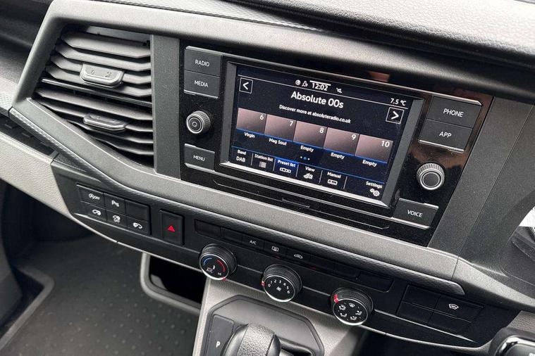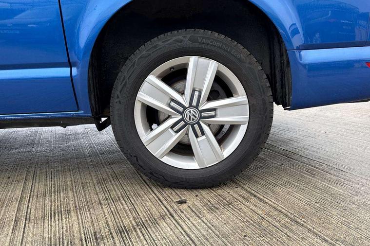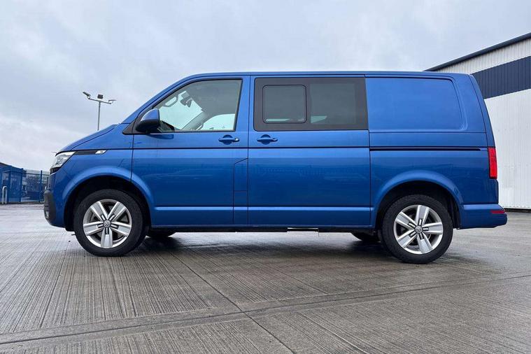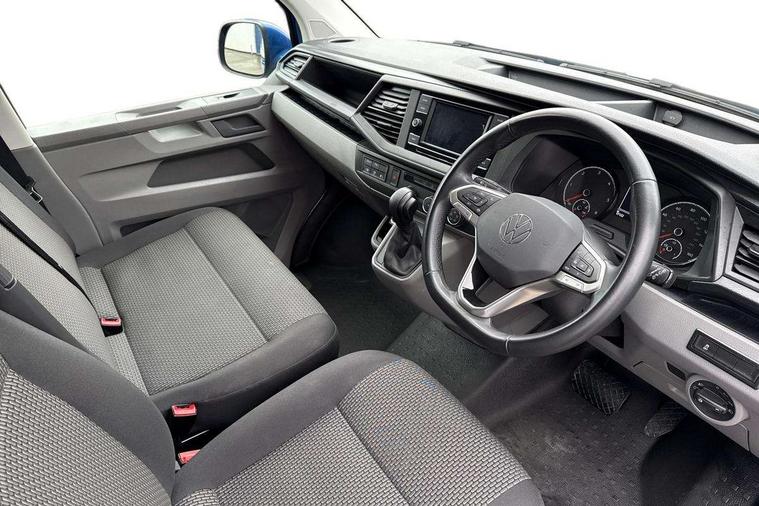 Adaptive cruise control, Child seat anchors ISOFIX and top tether in 2nd row of seats, Cross wind assist, Dimmable illuminated instruments, Driver alert with black and white multi function display plus, eCall emergency system, Forward collision warning front assist with autonomous emergency braking, Headlight range control, Mobile phone interface, Without voice control, 2 USB interfaces type C in dashboard, 4 speakers with 2 tweeters and 2 woofers, Composition colour radio with 6.5" touchscreen, Digital radio reception (DAB+), Volkswagen app connect, Automatic headlight control, leaving home and manual coming home feature, Front fog lamps with cornering light, Green heat insulating glass, Heated front windscreen, Illuminated steps in passenger/load compartment, Left convex exterior mirror, Power folding adjustable door mirrors with separately heated, Privacy glass from the B-pillar and heat-insulating glass in front, Radiator grille with 2 chrome trims, Rear window with heated insulating glass, heated rear window wiper and washer system, Right convex exterior mirror, Tailgate closing with unlatching from the inside, Transporter nameplate on the rear fender, Windshield wiper intermittent control with rain sensor for windshield wipers, Without adhesive film, 3 spoke leather wrapped multi function steering wheel, Additional sound deadening measures in cab and passenger compartment, Auto dimming breakaway interior rear view mirror, Comfort headliner in cab, hardboard roof trim in passenger and load compartment, Dust/pollen filter, Folding grab handles and storage compartments on cab seats, reading light, Front seats on the right in 1st row of seat, Glove compartment with illumination, Heavy duty tool kit and jack, Interior plastic loading edge protection, Lashing rings for load restraint system, LED Interior lighting in load and passenger compartment, Manual height adjustable and lumbar support for driver and single passenger seats, Medium height for vehicles with window aperture hardboard side trim panels in passenger/load compartment, Refrigerant R134a, Standard lower part dashboard in palladium, Without partition, Without seats in 3rd row of seats, Comfort pack - Transporter, Exterior pack without fog light- Transporter, Light and vision pack - Transporter, Non smoker pack - Transporter, 3 point height adjustable seat belts on outer seats cab with electric pretensioners, Driver and front passenger airbag with front passenger airbag deactivation, Power operated child safety lock, Warning buzzer and light for driver seat belt not fastened, Anti theft alarm system with interior monitoring in cab, backup horn and towing protection, Lockable wheel bolts, 16" chassis with 16" brake system, Additional 12V socket, Diesel particulate filter, Electronic stability control, ABS, ASR with deactivation button, hill start assist and brake assist system, Speed limiter, Start/stop system with regenerative breaking, 17" Devonport alloy wheels, Wheel trims,