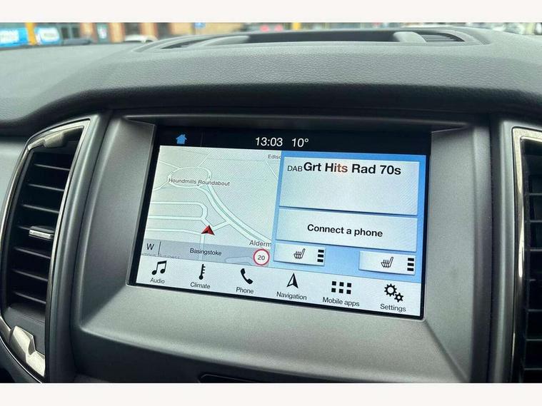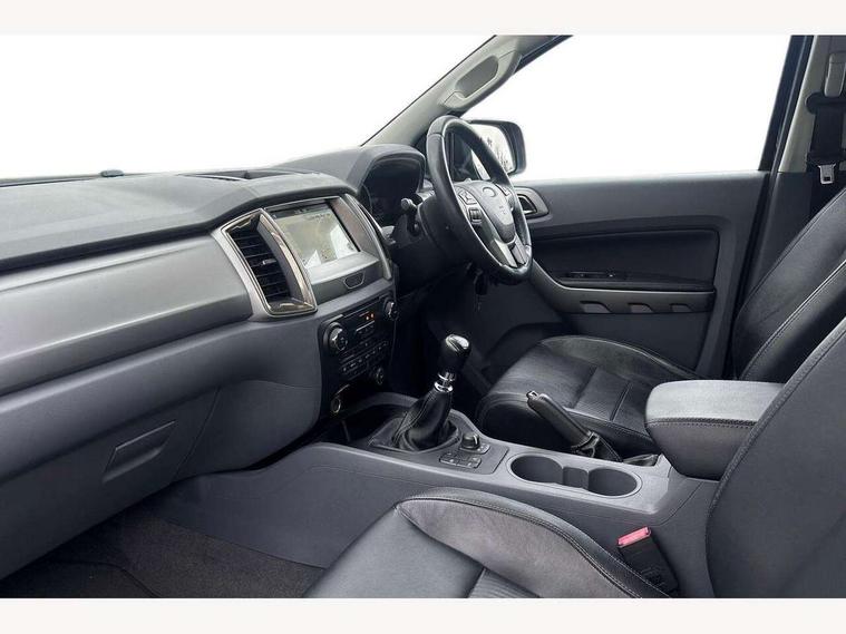 Bluetooth hands free kit with voice control, Easy fuel capless refuelling system, Front parking sensor, Multifunction colour display, Outside air temperature display with ice warning, PAS, Rear view camera, Reverse parking sensor, Satellite navigation system, Seatbelt warning indicator, SYNC 3.0 with 8" Colour touch screen, Trip computer, Tyre pressure monitor, 6 speakers, Aux input socket, DAB with CD and MP3 player, Steering wheel mounted audio controls, USB connection, Auto dimming rear view mirror, Black door belt line moulding, Black door handles, Black electrically adjustable and heated door mirrors, Black front grille, Black rear bumper, Black side steps, Black side vent, Body colour bumpers, Body colour wheel arch mouldings, C-channel loadbox tie downs, Daytime running lights, Door mirror memory, Door mirror mounted LED turn signals, Electric folding door mirrors, Electric rear windows, Electric windows, one touch lowering + anti trap device (Driver only), Front fog lights, Headlamp levelling, Heated front window, Heated rear cab window, Mica paint, Mud flaps front and rear, Privacy glass, Puddle lights in door mirrors, Rain sensitive wipers and auto headlights, Sports bar and roof rails, Steel double skinned pick up box with 2 position tailgate and inner fenders, Under hood engine cover, 4 speed air recirculation fan + heater, 8 way adjustable and heated driver/single passenger seat with lumbar support, Centre console coolbox, Door operated dome light with courtesy switches on all doors, Driver and passenger sunvisors with illuminated vanity mirrors, Electronic air temperature control (EATC), Fixed bench with 2 height adjustable head restraints, Front centre armrest with storage bin, Front centre console with dual cup holders and armrest with double lidded storage box, Front door storage pockets, Front passenger grab handle, Front seat back map pockets, High performance bedliner with protective side wall, High series finish instrument panel, Illuminated glovebox, Interior tie down hooks and load rest, Leather door inserts, Leather gearknob, Leather wrapped steering wheel, Load area light, Map reading lights, Overhead stowage with mood lighting, Overhead sunglasses holder, Premium carpet mats, Reach and rake adjustable steering column, Rear cup holders, Soho grain leather upholstery, Tie down rails and rope hooks, 3x3 point rear seatbelts, Child proof rear door locks, Driver and passenger airbag, Front passenger airbag deactivation, Front seatbelt pre-tensioners with load limiters, ISOFIX child seat mountings, Knee airbag, Side curtain airbags, Side Thorax Airbags, Speed sensing door locks, Additional flip key, Immobiliser, Lockable tailgate, Locking wheel nuts, Remote central locking, Thatcham category 1 alarm, 2 x 12V power outlets, ABS + EBD, Emergency brake assist, ESP including traction control, Rear 12v plug, Centre console bezel with silver finish, 17" Panther black alloy wheels,