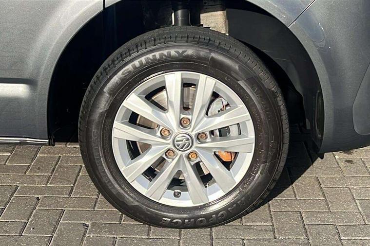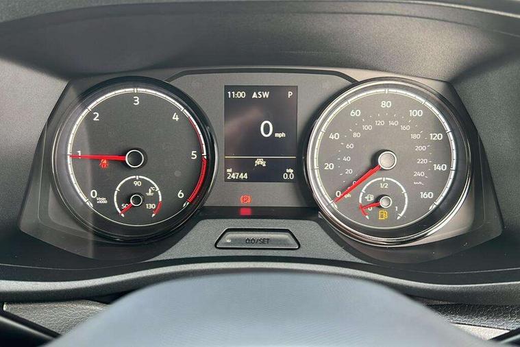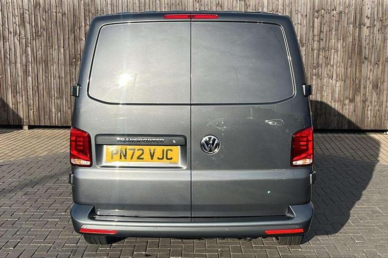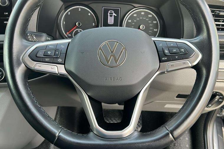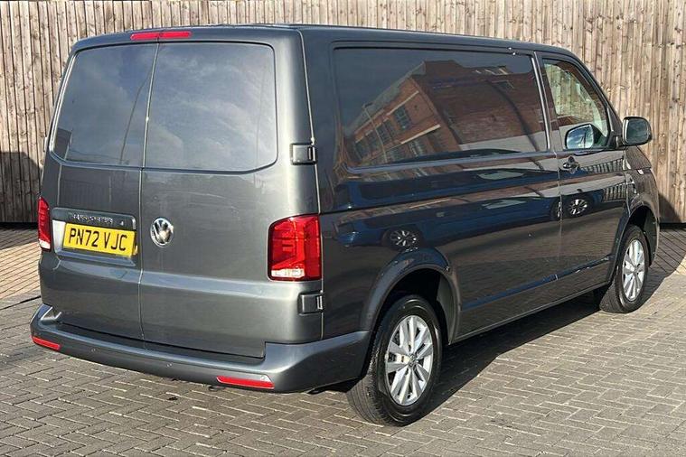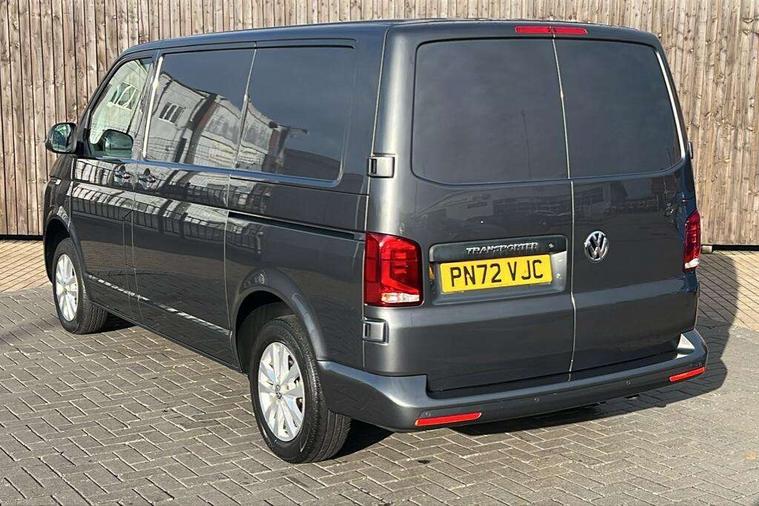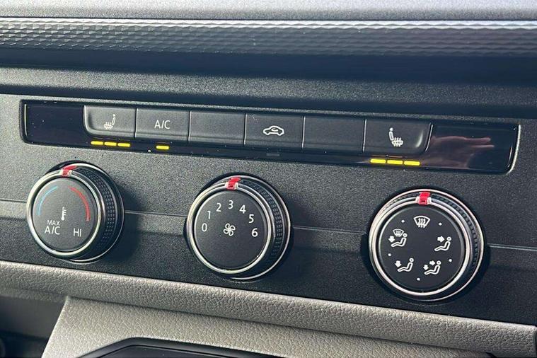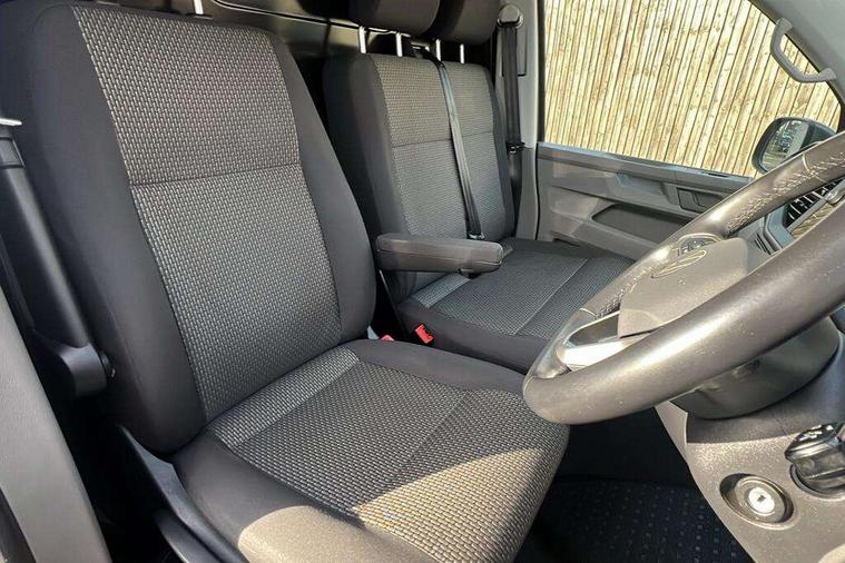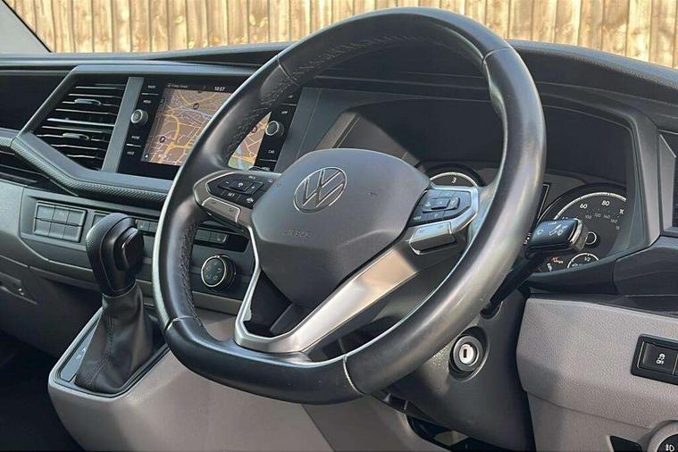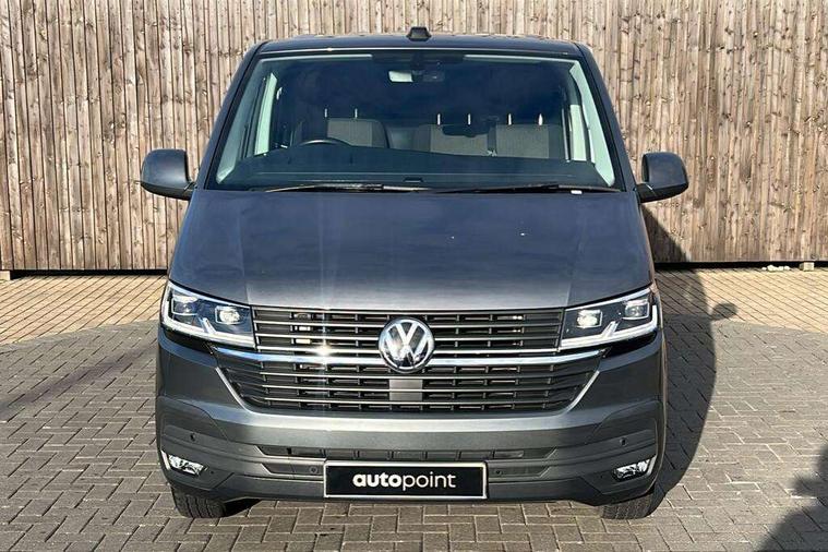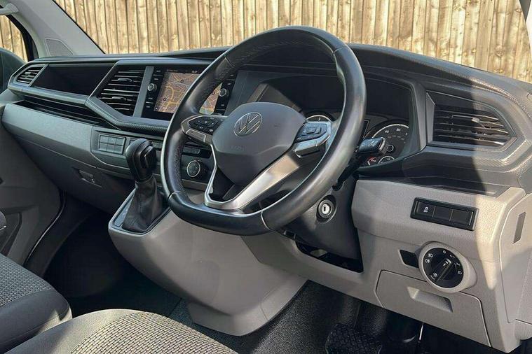 Adaptive cruise control, Cross wind assist, Dimmable illuminated instruments, Driver alert with Multi-function display plus, eCall emergency system, Electromechanical speed sensitive power steering, height and longitudinally adjustable steering column, Forward collision warning front assist with autonomous emergency braking, Mobile phone interface, Multi function display plus with black and white display, 2 USB interfaces type C in dashboard, 4 speakers with 2 tweeters and 2 woofers, Composition colour radio with 6.5" touchscreen, Digital radio reception (DAB+), Volkswagen app connect, Automatic headlight control, leaving home and manual coming home feature, Closing rear wing door with unlatching from the inside, Front fog lamps with cornering light, Heat insulating glass (green) in cab and passenger/load compartment, Heated front windscreen, Left convex exterior mirror, Power folding adjustable door mirrors with separately heated, Radiator grille with 2 chrome trims, Rear wing doors without window apertures, Right convex exterior mirror, Transporter nameplate on the rear fender, Windshield wiper intermittent control with rain sensor for windshield wipers, 3 spoke leather wrapped multi function steering wheel, Auto dimming breakaway interior rear view mirror, Comfort headliner in cab, hardboard roof trim in passenger and load compartment, Dust/pollen filter, Front and rear left without window closed side panel in load compartment, Front seats on the right in 1st row of seat, Glove compartment with illumination, Heavy duty tool kit and jack, High partition, Interior plastic loading edge protection, LED Interior lighting in load and passenger compartment, Manual adjustable lumbar support for right single seat in 1st row seats, Refrigerant R134a, Standard lower part dashboard in palladium, Storage compartments on cab seats and reading light, Without right side window apertures in passenger and load compartment, Comfort pack - Transporter, Exterior pack without fog light- Transporter, Light and vision pack - Transporter, Non smoker pack - Transporter, 3 point height adjustable seat belts on outer seats cab with electric pretensioners, Driver and front passenger airbag with front passenger airbag deactivation, Warning buzzer and light for driver and front passenger seat belt not fastened, Without child safety lock in passenger compartment, Anti theft alarm system with interior monitoring in cab, backup horn and towing protection, Lockable wheel bolts, 16" chassis with 16" brake system, Additional 12V socket, Diesel particulate filter, Electronic stability control, ABS, ASR with deactivation button, hill start assist and brake assist system, Start/stop system with regenerative breaking, 16" Clayton alloy wheels,