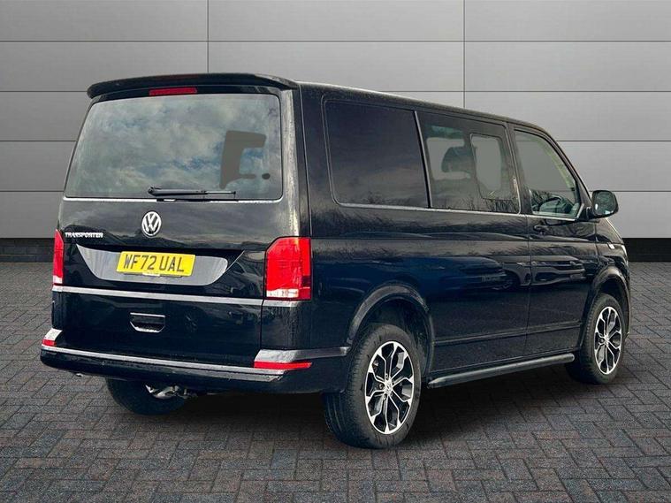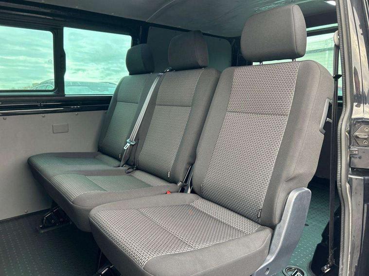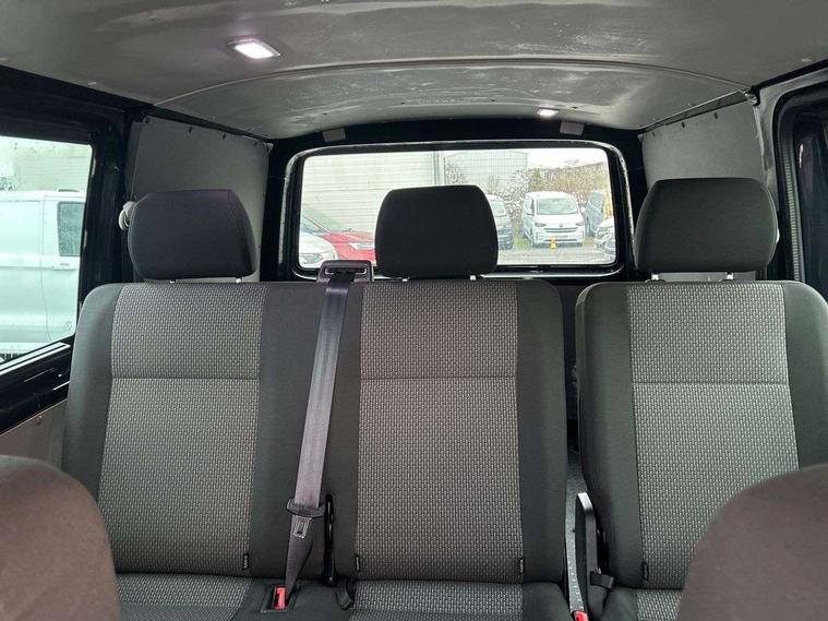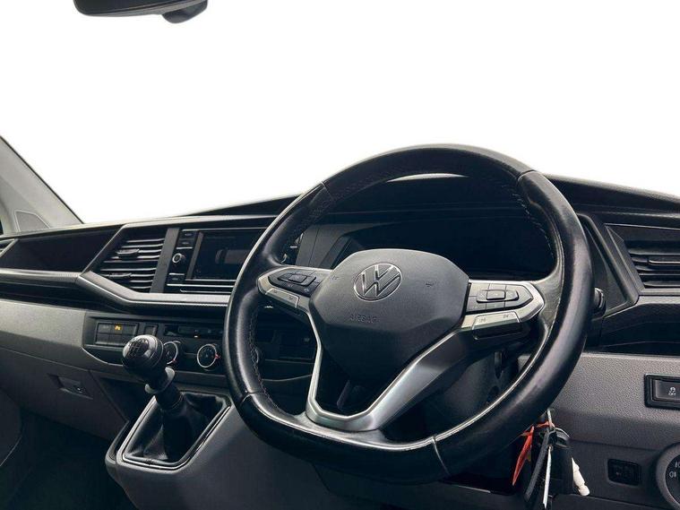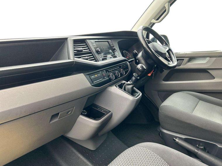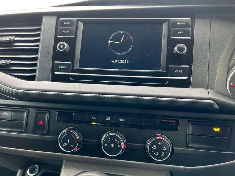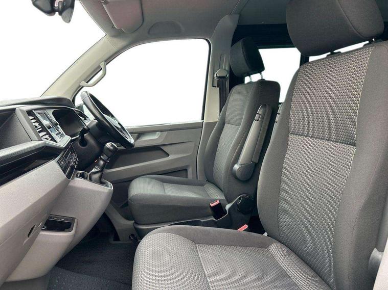 Adaptive cruise control, Child seat anchors ISOFIX and top tether in 2nd row of seats, Cross wind assist, Dimmable illuminated instruments, Driver alert with black and white multi function display plus, eCall emergency system, Forward collision warning front assist with autonomous emergency braking, Headlight range control, Mobile phone interface, Without voice control, 2 USB interfaces type C in dashboard, 4 speakers with 2 tweeters and 2 woofers, Composition colour radio with 6.5" touchscreen, Digital radio reception (DAB+), Volkswagen app connect, Automatic headlight control, leaving home and manual coming home feature, Front fog lamps with cornering light, Green heat insulating glass, Heated front windscreen, Illuminated steps in passenger/load compartment, Left convex exterior mirror, Power folding adjustable door mirrors with separately heated, Privacy glass from the B-pillar and heat-insulating glass in front, Radiator grille with 2 chrome trims, Rear window with heated insulating glass, heated rear window wiper and washer system, Right convex exterior mirror, Tailgate closing with unlatching from the inside, Transporter nameplate on the rear fender, Windshield wiper intermittent control with rain sensor for windshield wipers, Without adhesive film, 3 spoke leather wrapped multi function steering wheel, Additional sound deadening measures in cab and passenger compartment, Auto dimming breakaway interior rear view mirror, Comfort headliner in cab, hardboard roof trim in passenger and load compartment, Dust/pollen filter, Folding grab handles and storage compartments on cab seats, reading light, Front seats on the right in 1st row of seat, Glove compartment with illumination, Heavy duty tool kit and jack, Interior plastic loading edge protection, Lashing rings for load restraint system, LED Interior lighting in load and passenger compartment, Medium height for vehicles with window aperture hardboard side trim panels in passenger/load compartment, Refrigerant R134a, Standard lower part dashboard in palladium, Without partition, Without seats in 3rd row of seats, Comfort pack - Transporter, Exterior pack without fog light- Transporter, Light and vision pack - Transporter, Non smoker pack - Transporter, 3 point height adjustable seat belts on outer seats cab with electric pretensioners, Driver and front passenger airbag with front passenger airbag deactivation, Power operated child safety lock, Warning buzzer and light for driver seat belt not fastened, Anti theft alarm system with interior monitoring in cab, backup horn and towing protection, Lockable wheel bolts, 16" chassis with 16" brake system, Diesel particulate filter, Electronic stability control, ABS, ASR with deactivation button, hill start assist and brake assist system, Speed limiter, Start/stop system with regenerative breaking, 16" Clayton alloy wheels, Wheel trims,