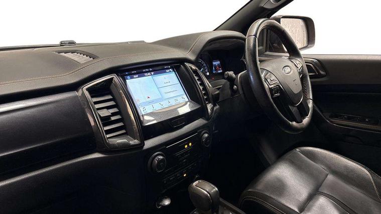 2 key fob, Collision mitigation braking system, Electric power assisted steering, Fixed rear view camera, Front parking aid, Intelligent speed assistance, Lane keeping aid, Rear parking sensor, Traffic sign recognition, Trip computer, Body coloured plastic front bumper, Boulder grey exterior door handle, Boulder grey exterior door mirror, Boulder grey radiator grille, Daytime running lights, Dual power heated fold back door mirror with puddle lamp and signal, Dyno grey sports hoop with side rails, Electrically operated windows with one shot driver's window, Electrochromic interior mirror, Front splash guard and mud flaps, Heated windshield and rear window, High mounted stop lamp with cargo area light, LED Front fog lamp, LED headlamps, Moulded in colour tailgate handle, Painted front fender grille, Privacy glass, Rain sensitive windshield wipers, Rear bumper chrome under-bar, Rear bumper step in boulder grey, Rear mudflaps, Roof rails, Side step with brushed inserts, Tailgate - Easy-lift/lower mechanism, Under hood engine cover, Underbody protection, Centre console coolbox, Chrome interior door handle, Driver seat back mounted map pocket, Dual control system - Electronic air temperature control (EATC), Ebony headliner, Heated front seat, Journey grain partial leather upholstery with Wildtrak logo, Leather gearknob, LED ambient interior lighting, Power adjustable 8 way driver seat, Premium front and rear floor mats with Wildtrak logo, Reach and rake adjustable steering column, Roof storage for driver sunglasses, Sport leather stitched steering wheel, Tie down rails and rope hooks, Wildtrak door trim panel insert, ICE feature pack 129 - Ranger, Driver and front passenger airbag, side airbag, curtain airbag and driver knee airbag, ISOFIX child safety seat attachment, Tyre pressure sensors, Double locking power door lock with flip key, Immobiliser, Locking wheel nuts, Passive anti theft system, Passive keyless entry and start system, Power tailgate lock, Spare wheel lock, Thatcham category 1 alarm security system, ABS, ESP and roll over mitigation, Emergency brake assist, Engine start/stop system, Locking rear axle, Power converter,