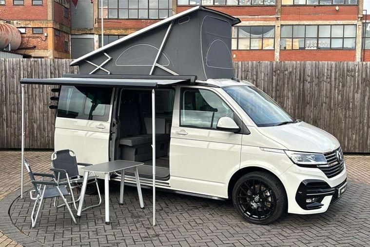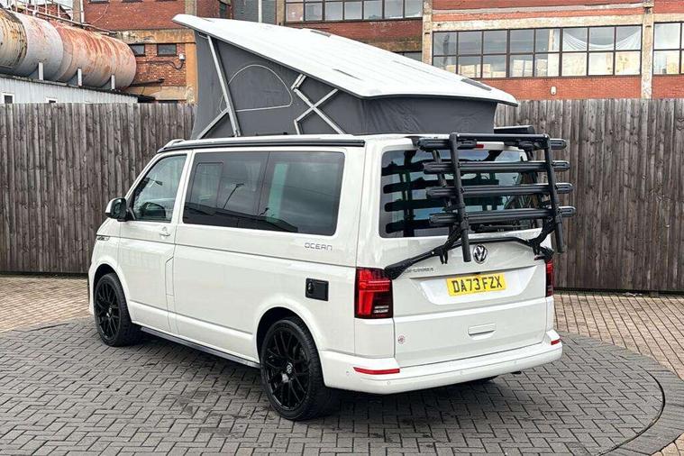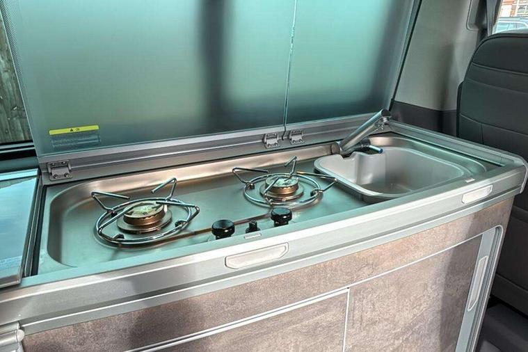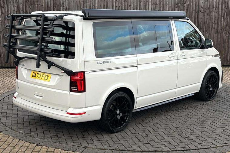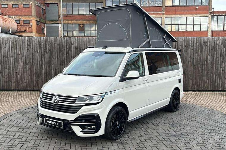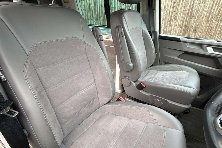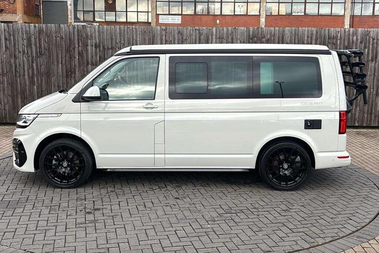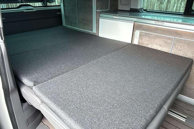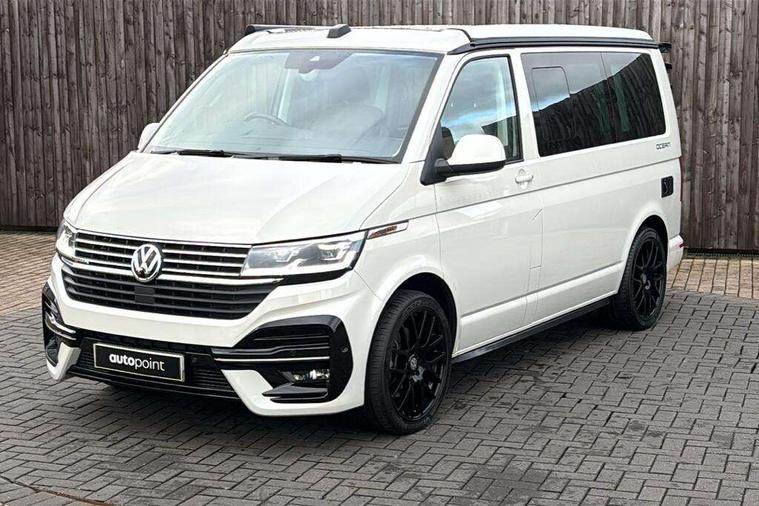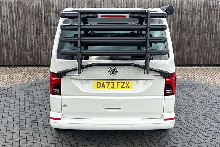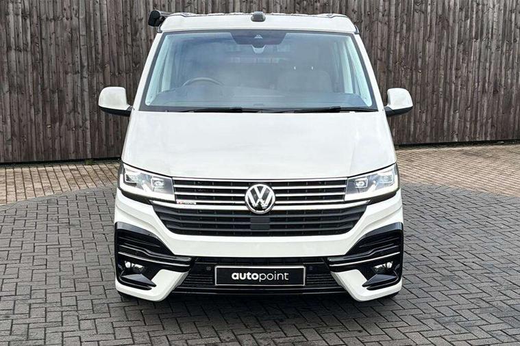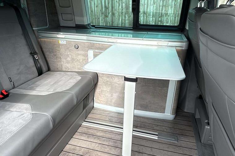 8" touch screen, Cross wind assist, Digital cockpit and driver alert system, eCall emergency system, Lane assist with side assist, Mobile phone interface, Navigation system preparation, Service interval indicator, Speed limiter, Start/stop system with regenerative braking, Tailgate latch without unlocking function from inside, Tailgate with window aperture and with power latching, Voice control system, Wired and wireless app connect, 17 inch chassis with 17 inch disc brakes in front and 16 inch disc brake in rear, 2 additional batteries with free maintanace including 1 additional battery with cut-off relay, 2 (type C) USB interfaces in dashboard, 8 speakers (4 tweeters + 4 woofers), Digital radio reception (DAB+), Regional code ECE for radio, Additional dust seals on the outside, Automatic headlight range control, Body colour bumpers, Body coloured door handles, California nameplate on the fender and on the rear, Electrically adjustable, heated, folding exterior mirrors, Electrohydrolic operated pop up roof with 3 windows and 1 front aperture, Front fog lights with cornering function, Heat insulating cab side windows, passenger compartment side windows tinted and with double glazing, Heated washer nozzles in front and washer fluid level indicator, High level 3rd brake light, LED headlamps with LED separate daytime running light, Left convex exterior mirror, Mounting rails on the roof (preparation for movable roof rack), Power adjustable, heated exterior mirrors, Privacy glass with heat insulation, Radiator grille painted in black with 5 chrome trims, additional chrome trim at lower radiator grille, Rear boot, Rear window with insulating glass, rear window wiper and washer system, Right convex exterior mirror, Sliding window in front with fly screen and fixed window in rear in load passenger compartment left, Sliding window in front with fly screen and fixed window in rear in load passenger compartment right, Without left sliding door in load/passenger compartment, 1 waste bin in door storage compartment of the cab, 12V outlets in dashboard X 2, 2 velour floor mats, 2-seater bench/bed, movable along rail system and folds down into a two person bed, 230V inlet with charging feature for vehicle batteries and 230V outlet in the interior, 3 spoke leather wrapped multifunction steering wheel, Additional LED light in the pop up roof, tailgate and kitchen cupboards, Allergen filter, Armrest for both cab seats, Camping table for inside/outside in sliding door and 2 folding chairs in tailgate, Child seat anchors ISOFIX and top tether for Multivan/California in 2nd to 4th row of seats, Climatronic 3 zone air conditioning with 2nd evaporator, auxiliary heater, air conditioned headliner and additional passenger control, Dimmable illuminated instruments, Electromechanical speed sensitive power steering, height and longitudinally adjustable steering column, Front head restraints, Fully functional kitchen with gas hob, sink and 42 litre compressor cool box, Glove compartment with illumination, Grab handles on A pillar for access, on driver and front passenger side, Heated driver and front passenger seats, Illuminated steps in passenger/load compartment, Illuminated sun visors with mirror and airbag label on front passenger sun visor, Interior light concept for camper with comfort in passenger compartment incl additional LED light in the pop up roof for the loft bed, in the tailgate, Interior loading edge protection in plastic, Jack and tool kit, Manually adjustable lumbar supports for left and right single seat in the 1st row of seats, Operating voltage 12V including 230V outlet on driver seat, Plastic floor covering in passenger/load compartment, Programmable parking heater with radio remote control and auxiliary heater, Rear head restraints, Refrigerant R1234yf, Roof bed (2000 x 1200 mm) with spring plates and mattress, Soft folding grab handles on roof frame, Special interior noise suppression measures, Special sound deadening measures in cab and passenger compartment, Step illumination with California lettering, Swivel seat on the left, with lumbar support in 1st row of seats, Swivel seat on the right, with lumbar support in 1st row of seats, Waeco compressor fridge, Without height adjustment for driver and single passenger seats, Lights and vision pack - California Ocean, Smokers pack - California, Airbags - Drivers and front passengers side and curtain airbags, Driver/Front Passenger airbags, Electronic stability control, ABS, ASR, EDL, brake assist system, Front assist with Autonomous emergency braking for Adaptive cruise control (ACC), Height adjustable 3 point seat belts on outer seats in cab with electric pretensioners, Hill start assist, Manual passenger airbag deactivation function, Power operated child safety locks, Single tone horn, Warning buzzer and light for driver seat belt not fastened, Anti theft alarm system with interior monitoring in cab, backup horn and towing protection, Central locking system with radio remote control, system controls inside and safelock, Lockable wheel bolts, Comfort dashboard lower part in palladium with chrome elements and bezels painted in black,