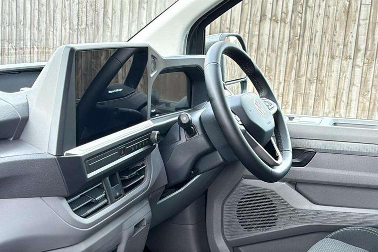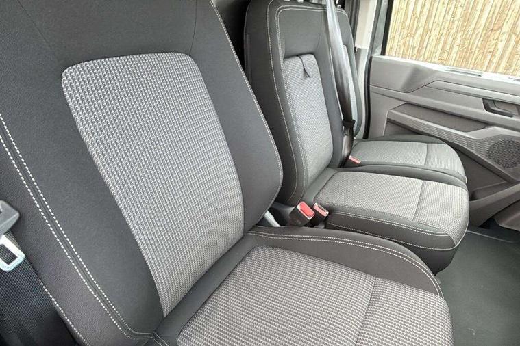 12" digital drivers display, 13" touchscreen infotainment display with wireless app connect and DAB radio, 5G Modem, Adaptive cruise control, Apple CarPlay and Android Auto, Dynamic road sign display, eCall emergency system, Electromechanical speed sensitive power steering, height and longitudinally adjustable steering column, Lane and blind spot assist with exit warning system, Preparation of VW connect and connect plus, Traffic jam assist, Wireless mobile phone charging, Wrong way driver warning, Body colour bumpers, Body coloured door handles, Body coloured door mirrors, Body coloured radiator grille, Electrically heated, adjustable and folding door mirrors, Heat reflecting side window glass, Mud flaps front and rear, Rear Transporter nameplate in black grained decorative trim, Vehicle opening configuration 1x 1st row of seats, 2x all doors, 12V outlet in centre console and 12V outlet on rear right D-pillar, 2x 15-W USB data/charging ports in dashboard and 1x USB-C, 1x USB-A center bottom, 2x LED lights in load compartment, 3x additional super bright LED lights in load compartment, 4 way height and tilt adjustable head restraints, 5 additional USB-C charging ports, Black plastic scuff plate for sliding door in cargo without illumination, Cabin interior lighting, Gear selector lever on steering wheel, Glasses compartment in driver side roof, Grab handle on A-pillar passenger side, Illuminated lockable glovebox, Lashing rings for reinforced floor covering, Narrow centre console with cup holder and compartment for mobile phone, Overhead storage compartment, Rubber floor covering in cab, Striped fabric upholstery, Without passenger seats in load compartment, Driver and front passenger airbag with front passenger airbag deactivation, Dual tone horn, Front and curtain airbags for driver and front passenger, Seat belt pretensioner for driver seat, Anti theft alarm system with interior monitoring in cab, backup horn and towing protection, Electronic immobiliser, Lockable wheel bolts, Preparation for alcohol ignition interlock, 5+ Promise, Alternator - 230A, Electromechanical brake booster, Electronic stability control, ABS, ASR with deactivation button, hill start assist and brake assist system,