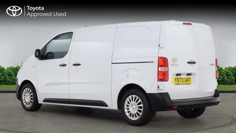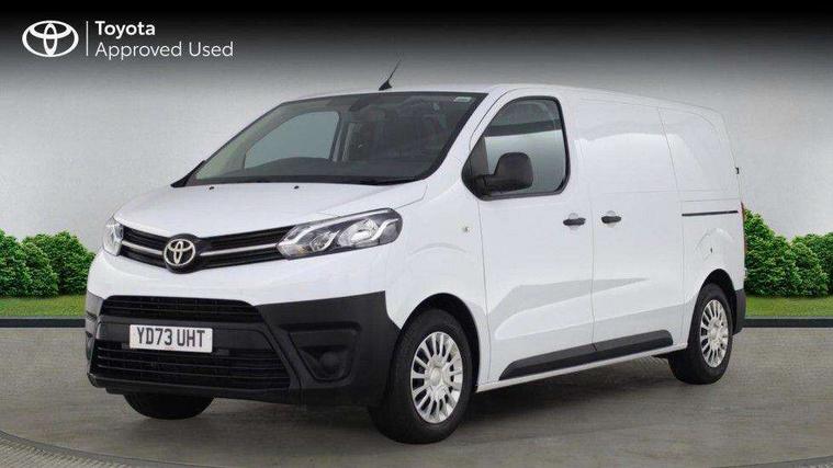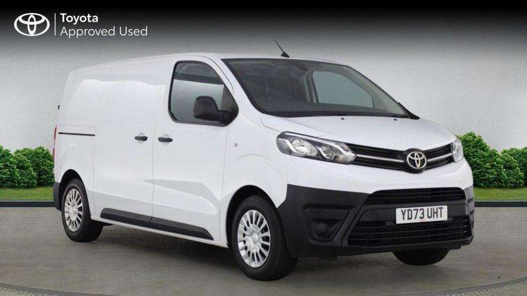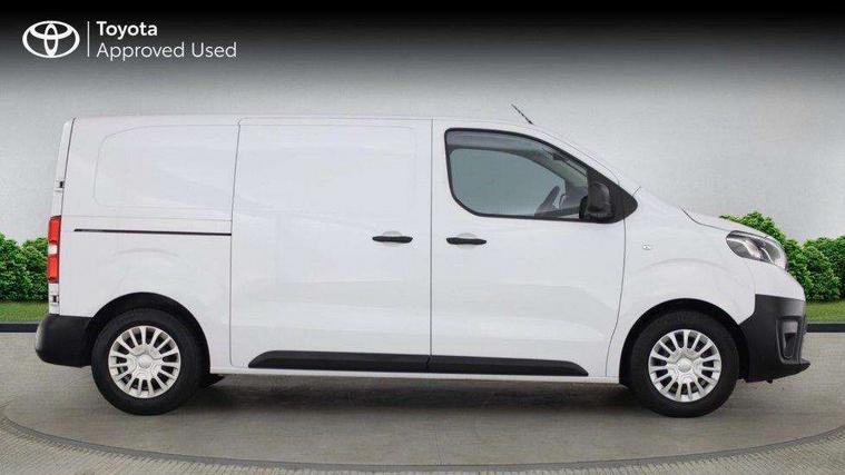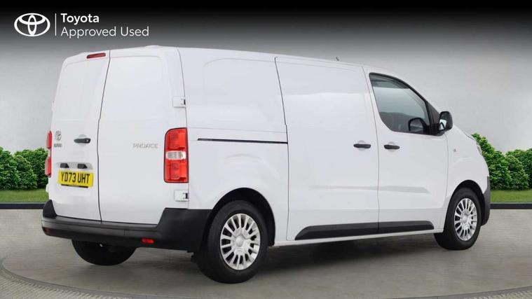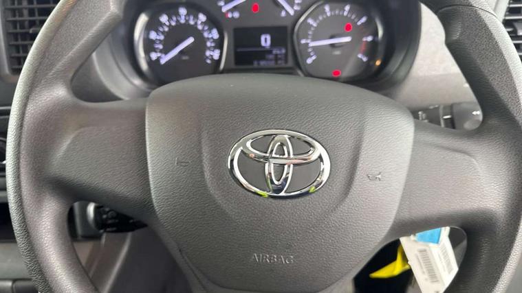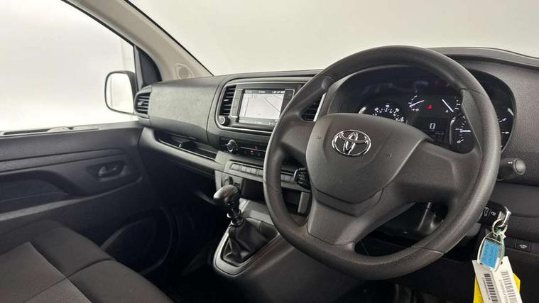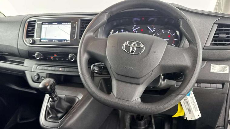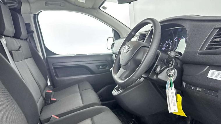 Bluetooth handsfree connectivity, Cruise control, PAS, Tyre pressure warning system (TPWS), 4 speakers, Digital radio (DAB), Radio/CD player, USB connector, 180 degree opening rear doors, Acoustic windscreen, Auto Headlights, Auto wipers, Black bumpers, Black door handles, Black protection moulding on side door, Body Coloured roof, Daytime running lights, Front power windows, Headlight cut-off reminder, Heated door mirrors, LED High mounted stop light, Manually adjustable day/night rear view mirror, Multi reflector halogen headlights, Panel rear wing doors, Power adjustable door mirrors, Rear combination lights, Short Antenna, Smoke tinted (30%) privacy glass on rear passenger window, Two manual sliding side doors, 2 seat front passenger bench, Driver seat armrest, Fabric seats, Front cup holders, Front room lights, Glovebox light, LED Driver and front passenger personal lights, Lighted and chilled upper glove box, Manually reclining and sliding driver and front passenger seats, Open upper dashboard storage compartment, Panel bulkhead with window and protective grille, Storage under passenger bench, Air conditioning and Smart cargo pack - Proace, Parking pack - Proace, Double front passenger airbag, Front passenger airbag on/off switch, Supplement restraint system (SRS) 2 airbags, Alarm, Deadlocks + 2 remote keys, Power door locks, 12V power front outlet, 12v socket in dashboard and rear, Adjustable speed limiter (ASL), Anti lock braking system (ABS), Brake Assist (BA), Stop/start function, Toyota traction select, Vehicle stability control (VSC) and hill start assist control (HAC), Full size spare wheel, Full wheel covers,