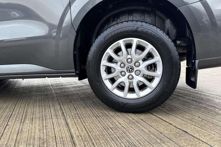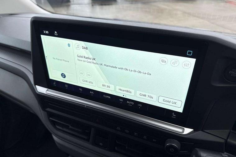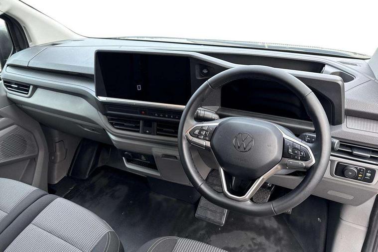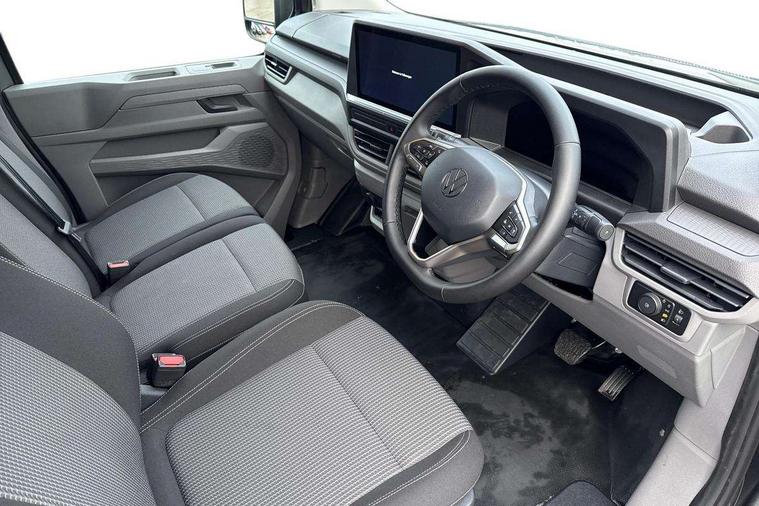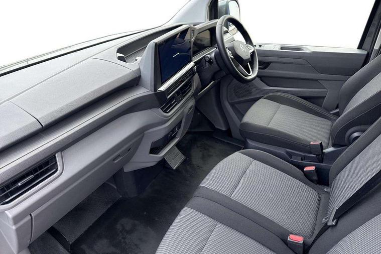 12" digital drivers display, 13" touchscreen infotainment display with wireless app connect and DAB radio, 5G Modem, Adaptive cruise control, Apple CarPlay and Android Auto, Dynamic road sign display, eCall emergency system, Electromechanical speed sensitive power steering, height and longitudinally adjustable steering column, Lane and blind spot assist with exit warning system, Preparation of VW connect and connect plus, Wireless mobile phone charging, Wrong way driver warning, Body colour bumpers, Body coloured door handles, Body coloured door mirrors, Body coloured radiator grille, Electrically heated, adjustable and folding door mirrors, Heat reflecting side window glass, Mud flaps front and rear, Rear Transporter nameplate in black grained decorative trim, Vehicle opening configuration 1x 1st row of seats, 2x all doors, 12V outlet in centre console and 12V outlet on rear right D-pillar, 2x 15-W USB data/charging ports in dashboard and 1x USB-C, 1x USB-A center bottom, 2x LED lights in load compartment, 3x additional super bright LED lights in load compartment, 4 way height and tilt adjustable head restraints, 5 additional USB-C charging ports, Black plastic scuff plate for sliding door in cargo without illumination, Cabin interior lighting, Glasses compartment in driver side roof, Grab handle on A-pillar passenger side, Illuminated lockable glovebox, Lashing rings for reinforced floor covering, Leatherette gear lever, Narrow centre console with cup holder and compartment for mobile phone, Overhead storage compartment, Rubber floor covering in cab, Striped fabric upholstery, Without passenger seats in load compartment, Driver and front passenger airbag with front passenger airbag deactivation, Dual tone horn, Front and curtain airbags for driver and front passenger, Seat belt pretensioner for driver seat, Anti theft alarm system with interior monitoring in cab, backup horn and towing protection, Electronic immobiliser, Lockable wheel bolts, Preparation for alcohol ignition interlock, 5+ Promise, Alternator - 230A, Electromechanical brake booster, Electronic stability control, ABS, ASR with deactivation button, hill start assist and brake assist system,