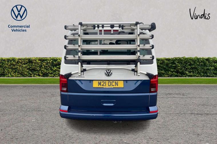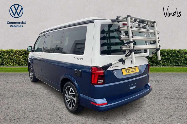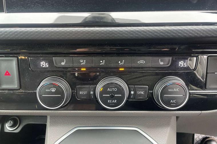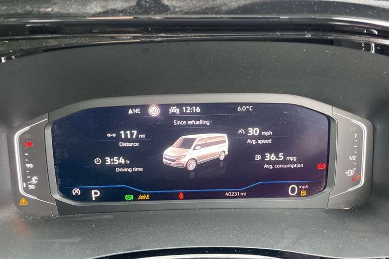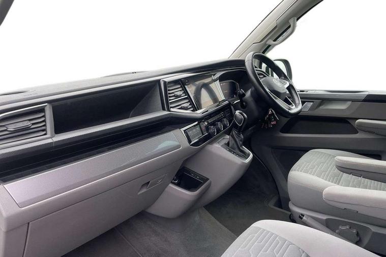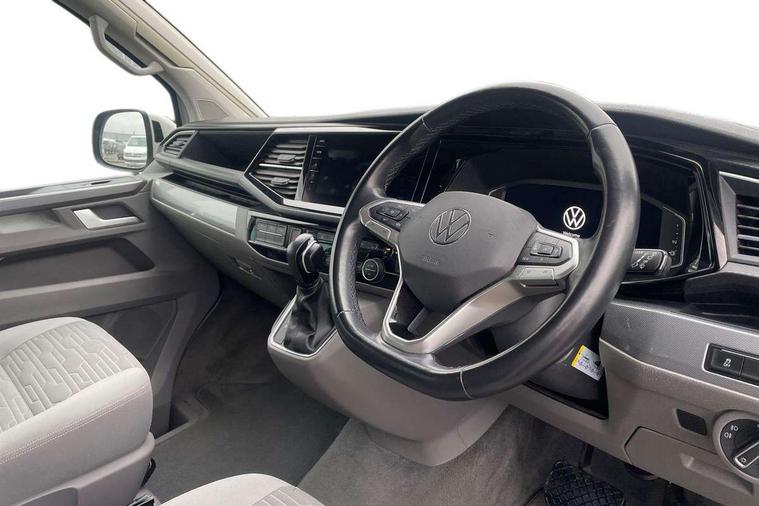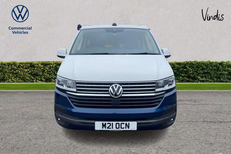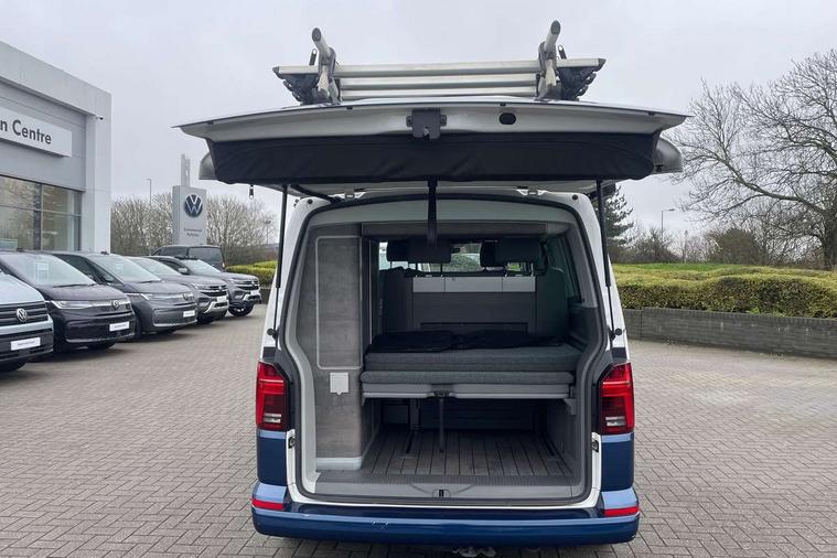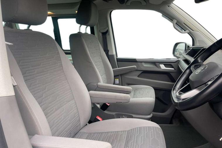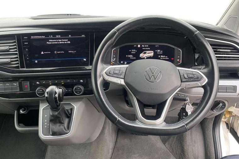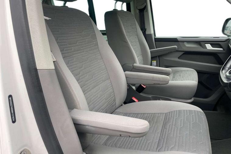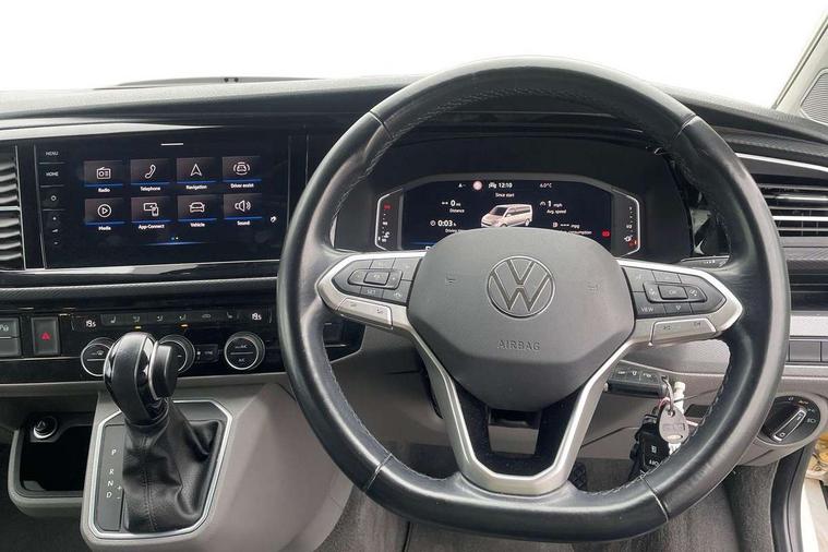 8" touch screen, Cross wind assist, Digital cockpit and driver alert system, eCall emergency system, Mobile phone interface, Navigation system preparation, Service interval indicator, Speed limiter, Start/stop system with regenerative braking, Tailgate latch without unlocking function from inside, Tailgate with window aperture and with power latching, Voice control system, Wired and wireless app connect, 17 inch chassis with 17 inch disc brakes in front and 16 inch disc brake in rear, 2 additional batteries with free maintanace including 1 additional battery with cut-off relay, 2 (type C) USB interfaces in dashboard, 8 speakers (4 tweeters + 4 woofers), Digital radio reception (DAB+), Regional code ECE for radio, Additional dust seals on the outside, Automatic headlight range control, Body coloured door handles, California nameplate on the fender and on the rear, Electrohydrolic operated pop up roof with 3 windows and 1 front aperture, Front fog lights with cornering light, Heat insulating cab side windows, passenger compartment side windows tinted and with double glazing, Heated washer nozzles in front and washer fluid level indicator, LED headlamps with LED separate daytime running light, Left convex exterior mirror, Mounting rails on the roof (preparation for movable roof rack), Power adjustable, heated, power folding exterior mirrors, folding possible via vehicle key, Privacy glass with heat insulation, Radiator grille painted in black with 5 chrome trims, additional chrome trim at lower radiator grille, Rear window with insulating glass, rear window wiper and washer system, Right convex exterior mirror, Sliding window in front with fly screen and fixed window in rear in load passenger compartment left, Sliding window in sliding door and fixed window in rear passenger compartment, right, Without left sliding door in load/passenger compartment, 1 waste bin in door storage compartment of the cab, 12V outlets in dashboard X 2, 2 velour floor mats, 2-seater bench/bed, movable along rail system and folds down into a two person bed, 230V inlet with charging feature for vehicle batteries and 230V outlet in the interior, 3 spoke leather wrapped multifunction steering wheel, Additional LED interior lighting, featuring lighting in pop-up roof, tailgate and kitchen cupboards, Allergen filter, Armrest for both cab seats, Camping table for inside/outside in sliding door and 2 folding chairs in tailgate, Child seat anchors ISOFIX and top tether for Multivan/California in 2nd to 4th row of seats, Climatronic 3 zone air conditioning with 2nd evaporator, auxiliary heater, air conditioned headliner and additional passenger control, Dimmable illuminated instruments, Electromechanical speed sensitive power steering, height and longitudinally adjustable steering column, Front head restraints, Fully functional kitchen with gas hob, sink and 42 litre compressor cool box, Glove compartment with illumination, Grab handles on A pillar for access, on driver and front passenger side, Heated driver and front passenger seats, Illuminated steps in passenger/load compartment, Illuminated sun visors with mirror and airbag label on front passenger sun visor, Interior light concept for camper with comfort in passenger compartment, Interior loading edge protection in plastic, Jack and tool kit, Manually adjustable lumbar supports for left and right single seat in the 1st row of seats, Operating voltage 12V including 230V outlet on driver seat, Plastic floor covering in passenger/load compartment, Programmable parking heater with radio remote control and auxiliary heater, Rear head restraints, Refrigerant R1234yf, Roof bed (2000 x 1200 mm) with spring plates and mattress, Soft folding grab handles on roof frame, Special interior noise suppression measures, Special sound deadening measures in cab and passenger compartment, Step illumination with California lettering, Swivel seat on the left, with lumbar support in 1st row of seats, Swivel seat on the right, with lumbar support in 1st row of seats, Waeco compressor fridge, Without height adjustment for driver and single passenger seats, Lights and vision pack - California, Smokers pack - California, Airbags - Drivers and front passengers side and curtain airbags, Driver/Front Passenger airbags, Electronic stability control, ABS, ASR, EDL, brake assist system, Front assist with Autonomous emergency braking for Adaptive cruise control (ACC), Height adjustable 3 point seat belts on outer seats in cab with electric pretensioners, Hill start assist, Manual passenger airbag deactivation function, Power operated child safety locks, Single tone horn, Warning buzzer and light for driver seat belt not fastened, Anti theft alarm system with interior monitoring in cab, backup horn and towing protection, Central locking system with radio remote control, system controls inside and safelock, Lockable wheel bolts, Comfort dashboard lower part in palladium with chrome elements and bezels painted in black,