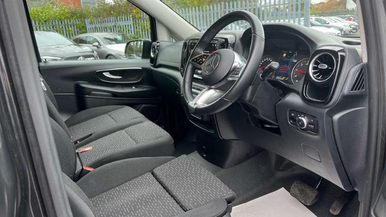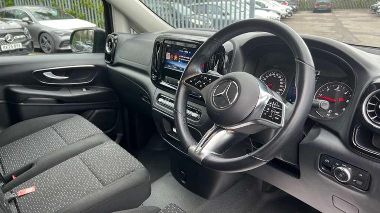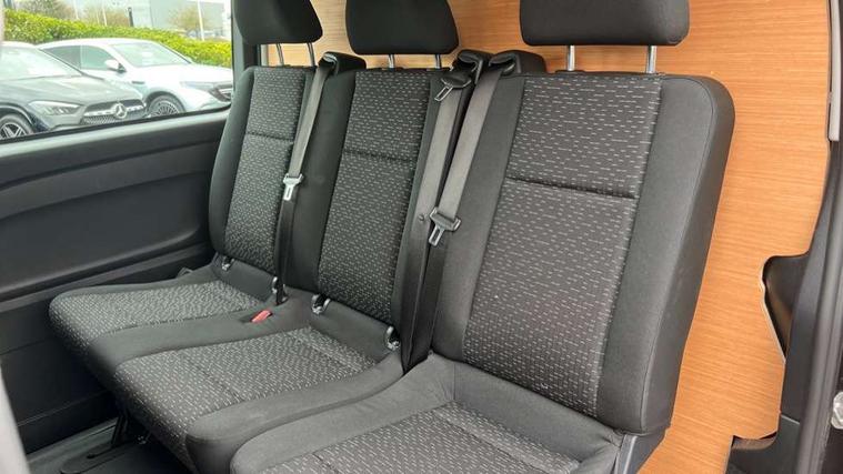 Active lane keeping assist, Blind spot assist, Comfort overhead control panel, Cruise control with speed limiter, Modern instrument cluster with 5.5" TFT color display, PAS, Pre installation for navigation, Wireless tyre pressure monitoring, 2 way front and rear loudspeakers, Digital radio (DAB), MBUX multimedia system with 10.25" touchscreen, Adaptive brake lights, Auto dimming interior rear view mirror, Chrome radiator grille, Colour coded front and rear bumpers, Daytime running lights, Detachable body parts painted body colour, Electrically heated and adjustable wing mirrors, Exit lamps, Front fog lights, Headlight assistant, Heat insulating glass, LED tail lamps, brake lamps and indicators, Multibeam LED with highbeam assist plus, Shaded black glass in rear, Tailgate, Third rear brake light, Twin side loading doors, Weld nuts, sidewall for conversions, Window front left, fixed, in sidewall / sliding door, Window front right, fixed, in sidewall / sliding door, Window in tailgate with wipe-wash system, 3 seat bench in 1st row with folding outer seat, Ashtray, Cigarette lighter, Comfort driver's seat, Driver's seat lumbar support, Electrical component for trailer socket, Front door storage pockets, Front footwell lights, Grab handles for drivers and co-driver doors, Grab handles in rear, Height and rake adjustable steering wheel, Illuminated vanity mirrors with sunvisors, Interior ambient lighting, Interior panelling higher execution, Leather steering wheel, Locking glove compartment, Multifunctional steering wheel, Plastic flooring, TPO in passenger compartment, Ventilation nozzles, Anti theft protection pack - Vito, Chrome interior appointment pack - Vito, Mirror pack - Vito, Parking package with reversing camera - Vito, Smartphone integration package - Vito/Vito Tourer, 3 point seatbelts for all seats, Accident recovery and breakdown management, Attention assist, Child safety locks on passenger compartment doors, Co-driver airbag, Crosswind assist, Driver's airbag, Mercedes-Benz emergency call system, Central locking with remote control, Immobiliser, 24 litre larger AdBlue tanks, 70L fuel tank, 9G tronic automatic gearbox, ABS/ESP/ASR, Active brake assist, Diesel particulate filter, EBV and BAS, Hill start assist, Mechanical parking brake, Traction control,