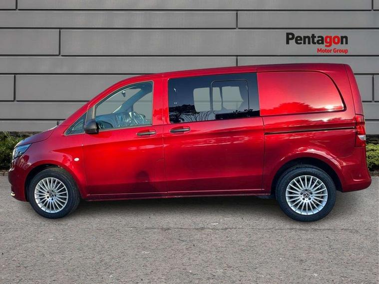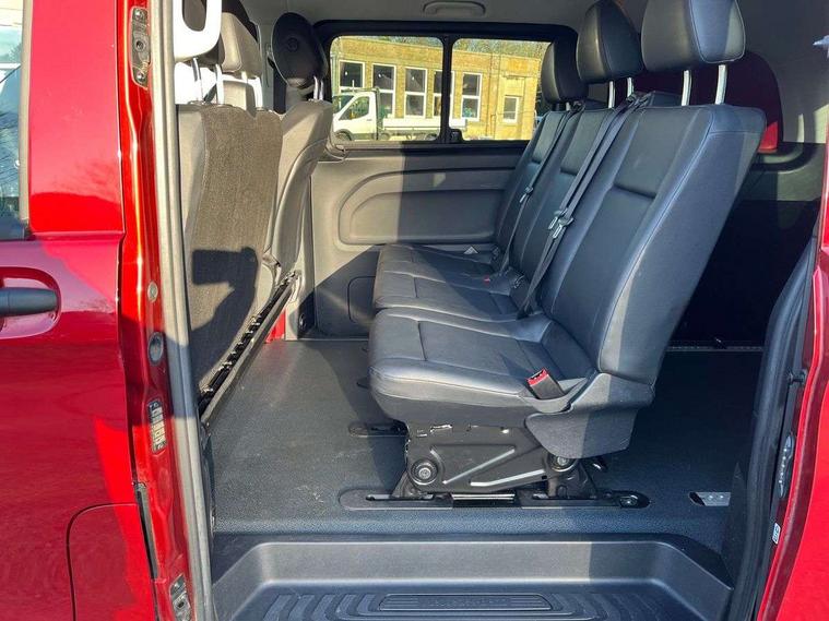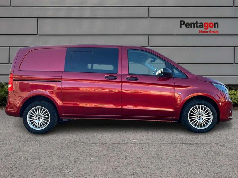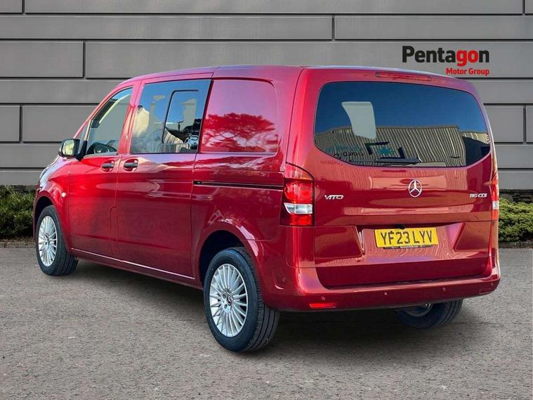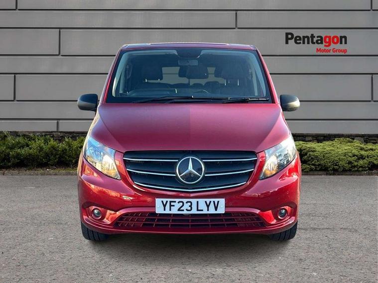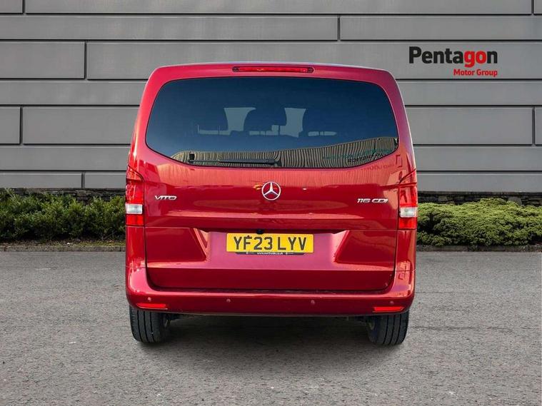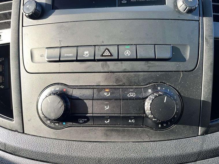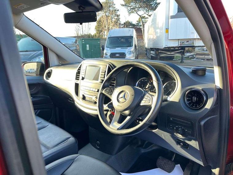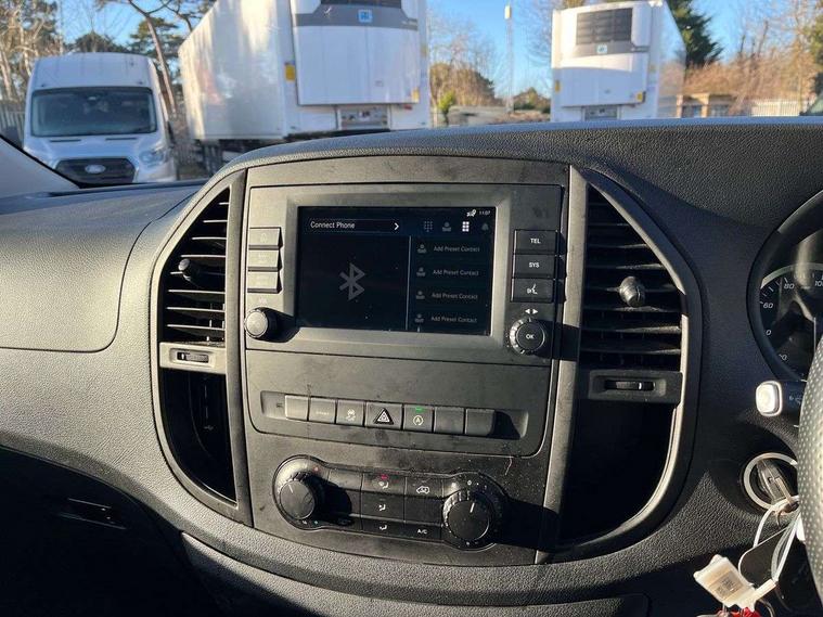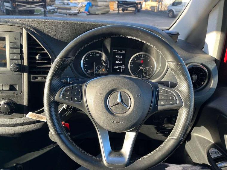 Chrome instrument cluster, Comfort overhead control panel, Digital clock, Headlight range control, Low fuel warning light, Parktronic system, PAS, Reversing camera, Seatbelt warning indicator, Warning lights, Wireless tyre pressure monitoring, Adaptive brake lights, Black tinted windows in rear, Chrome radiator grille, Colour coded front and rear bumpers, Daytime running lights, Electrically heated and adjustable wing mirrors, Front fog lights, Heat insulating glass, Tailgate with window, Third rear brake light, Ashtray, Cigarette lighter, Comfort eight way adjustable driver's seat, Driver's seat lumbar support, Electrical component for trailer socket, Front door storage pockets, Height and rake adjustable steering wheel, Locking glove compartment, Multifunctional steering wheel, Velour floor mats, Ventilation nozzles, Wood load flooring, Anti theft protection pack - Vito, 3 point seatbelts for all seats, Accident recovery management, Attention assist, Co-driver airbag, Crosswind assist, Driver's airbag, Central locking with remote control, Double locking, Electronic immobiliser, 24 litre larger AdBlue tanks, 9G tronic automatic gearbox, ABS/ESP/ASR, Active brake assist, Diesel particulate filter, EBV and BAS, Hill start assist, Mechanical parking brake, Traction control,