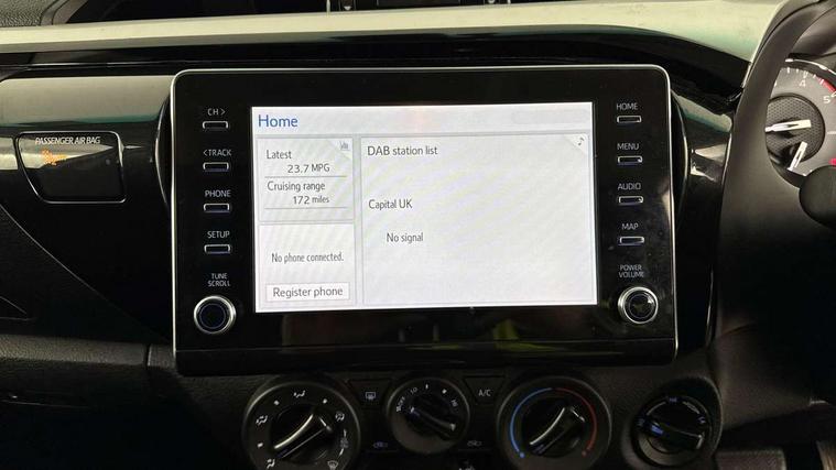 4.2" Multi information display, Bluetooth connectivity, Fuel heater, Intelligent adaptive cruise control, Lane departure warning system, Lights on warning buzzer, PAS, Pre-collision system with pedestrian detection, Rear view camera, Road sign assist, Smart phone integration with Android auto & Apple CarPlay, Static guidelines on rear view camera, Tachometer, Touch 2 multimedia system with 8" display, 6 speakers, Digital radio (DAB), MP3 compatibility, USB connector, Auto Headlights, Black side steps, Body coloured front bumper, Chrome door handles, Chrome door mirrors, Chrome rear bumper, Chrome trim on radiator grille, Daytime running lights, Electric front windows with one touch drivers window, Emergency brake light assist (EBS), Follow me home headlights, Green tinted glass, Headlamp levelling, Headlight cut-off reminder, Headlight washers, Heated door mirrors, Heated rear window, LED front fog lights, Mud flaps front and rear, Multi reflector halogen headlights, Power rear side window, Power retractable door mirrors, Rear fog lights, Rear window privacy glass, Trailer sway control, Underbody protection cover, Variable front wipers, Windscreen shadeband, 220V power socket, 60/40 split tip-up rear bench seat, Carpet covered floor, Centre console coolbox, Centre console with lid, storage and armrest, Cloth upholstery, Cooler in upper glove box, Driver seat height adjuster, Inner load hooks on cargo deck, Leather steering wheel and gearshift lever, Locking glovebox, Manual air conditioning, Rear seat tip-up function, Tilt adjustable steering wheel, Automatic front passenger airbag on/off switch, Child proof rear door locks, Front passenger airbag detector, Front seatbelt pre-tensioners + force limiters, Front seatbelt reminder, Isofix child seat preparation, Rear seatbelt pre-tensioners with load limiters, Supplement restraint system (SRS) 7 airbags - driver and passenger, knee, side and curtain, Immobiliser, Lockable tailgate, Remote central locking, 2 12v sockets, ABS with EBD, Auto limited slip differntial, Brake assist, Downhill Assist Control (DAC), Hill start assist, Load sensing proportioning system, Rear differential lock with auto disconnect, Stop/start function, Traction control, Vehicle stability control, All terrain tyres, Full size steel spare wheel,