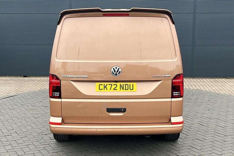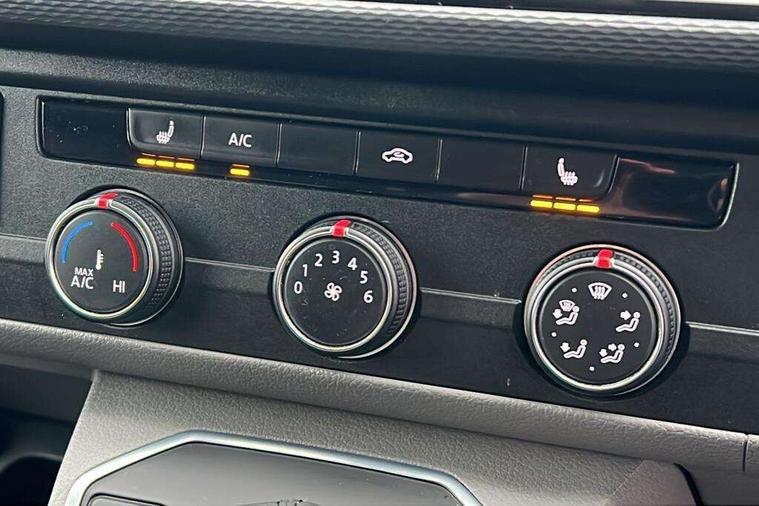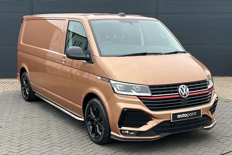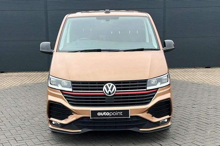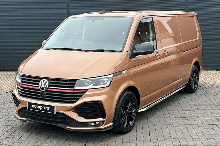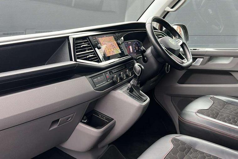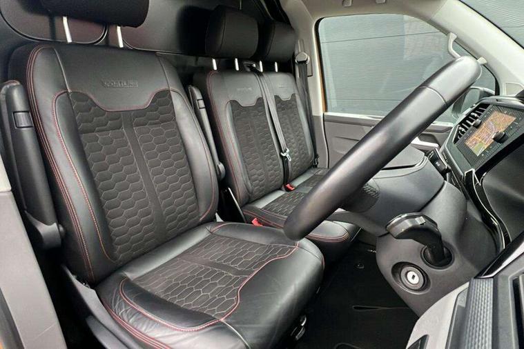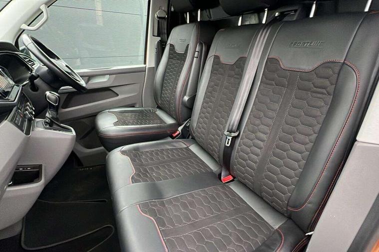 Adaptive cruise control, Cross wind assist, Digital cockpit, Dimmable dashboard ilumination, Driver alert system, eCall emergency system, Electromechanical steering, Front and rear parking sensors, Front assist including city emergency braking system, Multi function display plus with black and white display, Rear view camera, 4 speakers with 2 tweeters and 2 woofers, Digital radio reception (DAB+), Discover Media navigation system with 8.0" touch-screen including Streaming and Internet, Volkswagen app connect, Auto dimming interior rear view mirror, Automatic headlight control, leaving home and manual coming home feature, Body colour bumpers, Body coloured door handles, Enhanced front bumper including lower front diffuser, Front electric windows, Front fog lamps with cornering light, Gloss black wing mirrors, Heat insulating windows in cab, Heated laminated windshield, High beam assist, Illuminated chrome side bars, LED headlights with LED daytime running lights and LED tail lights, Power folding door mirrors, Power latching for passenger side sliding door, Power latching tailgate without windows, Rear tailgate spoiler, Sportline front wing and rear tailgate badging, Windshield wiper with intermittent control with rain sensor, 12V socket, Armrests for both front seats, Carpet floor covering in cab, Comfort dashboard, Dash panel with open stowage compartments, drink holders and lockable glovebox, Dust/pollen filter, Electronically controlled front air conditioning system and second heating system in passenger compartment, Entry handle on A-pillar on drivers and front passengers side, Folding grab handles on roof frame, Gloss black inserts in dashboard, Glove compartment with illumination, Half height side trim panels and roof trim panels made of hardboard, Heated driver and front passenger seats, Heavy duty tool kit and jack, High partition, Interior lighting with LED technology in load compartment, Interior styling and badging, Leather trimmed multi-function steering wheel with height and longitudinal adjustment, LED Interior lighting with two reading lights in the roof console, Nappa leather/alcantara upholstery with red contrast stitching, One waste bin in door storage compartment, Reinforced Folding lashing rings for load restraint system, Sportline carpet mats, Sun visors with mirror and airbag label on front passenger sun visor, Driver and front passenger airbag with front passenger airbag deactivation, Single tone horn, 2 remote control folding keys, Anti theft alarm system with interior monitoring in cab, backup horn and towing protection, Engine immobiliser, Lockable wheel bolts, Additional 12V socket, Automatic post collision braking system, Diesel particulate filter, Eibach 30mm lowering springs, Electronic stability control, ABS, ASR with deactivation button, electronic differnetial lock, hill start assist and brake assist system, Start/stop system with regenerative breaking, Dashboard upper in Titanium Black, dashboard lower in Palladium and floor covering in Titanium Black, 18" Sportline Gloss black alloy wheels, Tyre mobility kit in lieu of spare wheel with 12 volt compressor and tyre sealant,