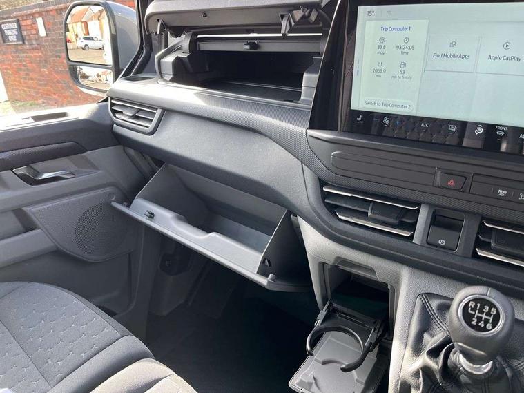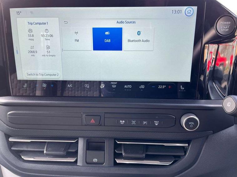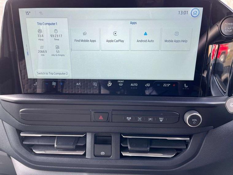 13" Touchscreen, 5G embedded modem, AECS NO SMS/Roll Detect 2G, PAS, Tyre pressure monitor, SYNC 4 - Android Auto/Apple Car Play, advance speech recognition, over the air update capability, Automatic headlights, Automatic windscreen wipers, Body coloured door mirrors, Body coloured front bumper, Body coloured rear bumpers, Daytime running lights, Electric front windows with one touch facility for driver and front passenger, Front mud flaps, Front splash guards, Low roof line, Quickclear front window defroster, Rear cargo hinged door, Rear splash guards, Trailer sway control, 6 Load compartment tie down loops, Courtesy light, Interior grab handle with driver's sunglasses holder, LED lights, Locking glove box lid, Sensico gearshift knob, 2 remote keys, Alcohol Interlock wiring preparation pack, Keyless entry and start, Locking wheel lug nut, Thatcham category 1 alarm, 20L AdBlue tank, ABS, Diesel particulate filter, ESP, Hill launch assist, Traction control, Full wheelcovers,