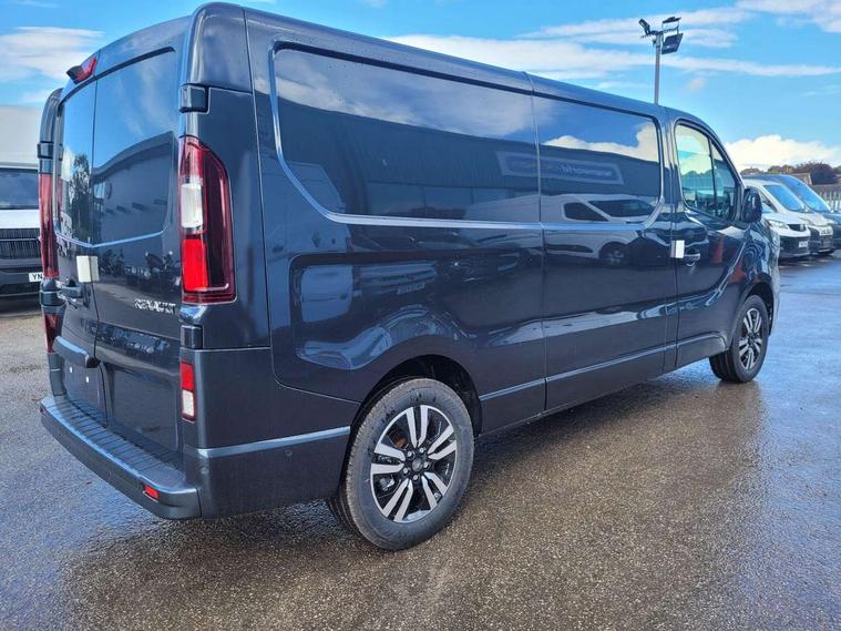 360 degree parking sensors (front, rear and lateral ultra sonic sensors), 7" Colour TFT driver information display, Driver attention alert, Driver drowsiness warning, E-Call - automated emergency call, Easy link navigation with 8" touchscreen DAB radio with bluetooth, USB + aux input, compatible with Apple CarPlay and Android Auto, ECO mode button, Gearshift indicator, Intelligent Speed Assist, Lane departure warning system, PAS, Trip computer, Wireless smart phone integration with Android auto & Apple CarPlay, Automatic high beam, Blind spot mirror on passenger sunvisor, Body coloured door mirrors, Body coloured front bumper, Body coloured side mouldings, Chrome Grille, Electric front windows with one touch drivers window, Front fog lights, Full LED headlights with C-shaped DRL, Heated with electric adjustment door mirrors and external temperature sensors, New brand identity, Roof bar fixings, Wide view mirror, 12V power socket in front, 16 load anchorage points, Climate control, Closed glovebox, Height adjustable drivers seat with armrest and lumbar adjustment, Interior LED cabin lighting, Java cloth upholstery, LED load space lighting, Premium dashboard with horizontal grain and chrome styling, Premium faux leather steering wheel, Look pack - Trafic, Parking pack - Trafic, Visibility pack - Trafic, 3 point height adjustable seatbelts with pretensioners and load limiter, Driver and passenger airbags, Driver and passenger seatbelt reminder, Front lateral and curtain airbags and passenger airbag with deactivation, Alarm - Thatcham T1 volumetric alarm, Alcohol interlock pre-device, Deadlocking, Electronic immobiliser, Hands free key card with push button stop/start function, Keyless entry system, Remote central locking, 20L AdBlue tank, 4 disc brakes, 6 speed gearbox, 80 litre fuel tank, ABS with EBD (Electronic Brake force Distribution), Active emergency braking system, ESC (Electronic Stability Control) with Hill Start Assist and Grip Xtend, 17" Avens diamond cut alloy wheels,