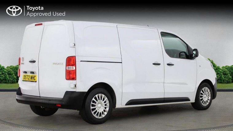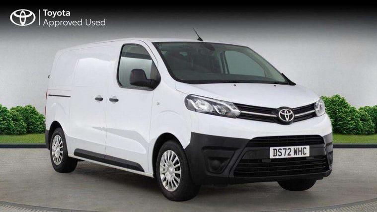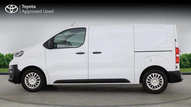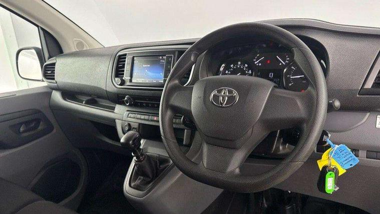Bluetooth handsfree connectivity, Cruise control, PAS, Tyre pressure warning system (TPWS), 4 speakers, Digital radio (DAB), Radio/CD player, USB connector, 180 degree opening rear doors, Acoustic windscreen, Auto Headlights, Auto wipers, Black bumpers, Black door handles, Black protection moulding on side door, Body Coloured roof, Daytime running lights, Front power windows, Headlight cut-off reminder, Heated door mirrors, LED High mounted stop light, Manually adjustable day/night rear view mirror, Multi reflector halogen headlights, Panel rear wing doors, Power adjustable door mirrors, Rear combination lights, Short Antenna, Smoke tinted (30%) privacy glass on rear passenger window, Two manual sliding side doors, 2 seat front passenger bench, Driver seat armrest, Fabric seats, Front cup holders, Front room lights, Glovebox light, LED Driver and front passenger personal lights, Lighted and chilled upper glove box, Manually reclining and sliding driver and front passenger seats, Open upper dashboard storage compartment, Panel bulkhead with window and protective grille, Storage under passenger bench, Air conditioning and Smart cargo pack - Proace, Parking pack - Proace, Double front passenger airbag, Front passenger airbag on/off switch, Supplement restraint system (SRS) 2 airbags, Alarm, Deadlocks + 2 remote keys, Power door locks, 12V power front outlet, 12v socket in dashboard and rear, Adjustable speed limiter (ASL), Anti lock braking system (ABS), Brake Assist (BA), Stop/start function, Toyota traction select, Vehicle stability control (VSC) and hill start assist control (HAC), Full size spare wheel, Full wheel covers,