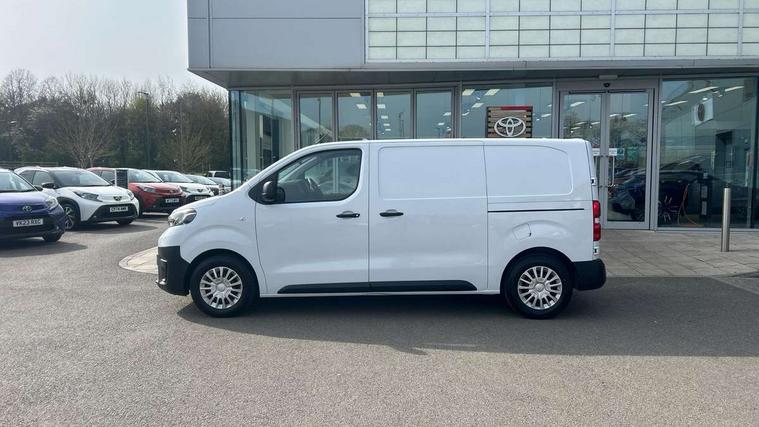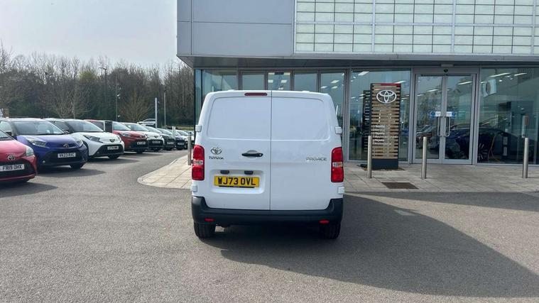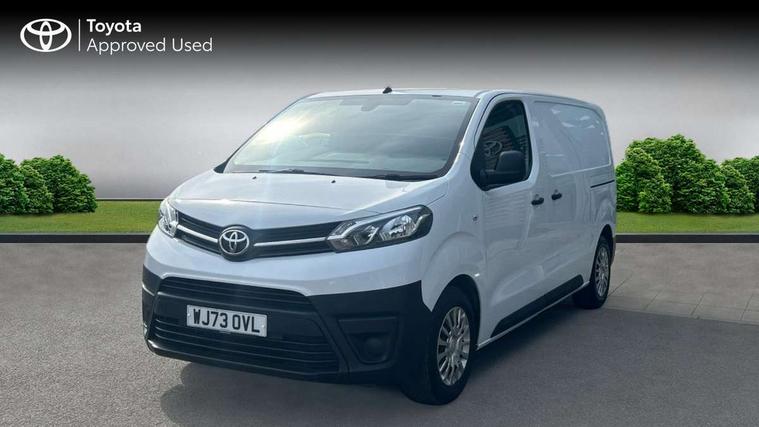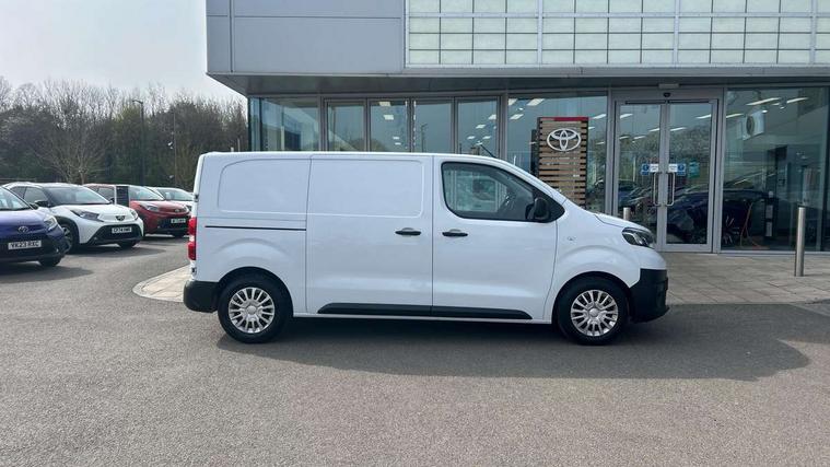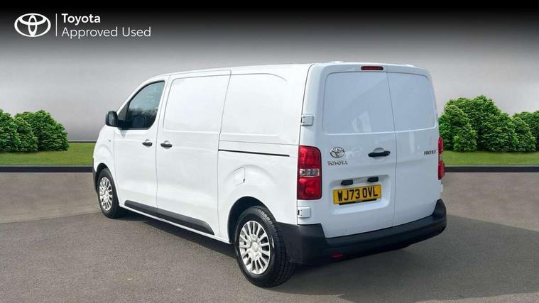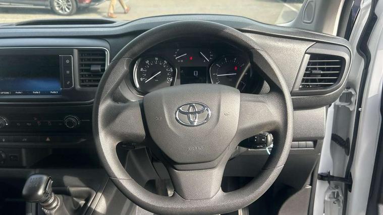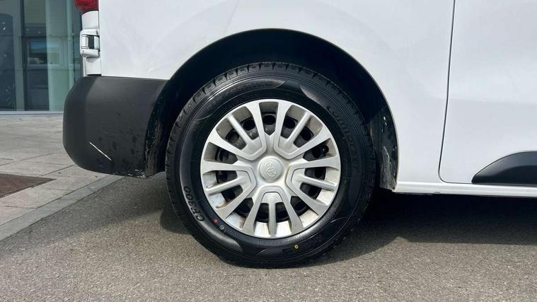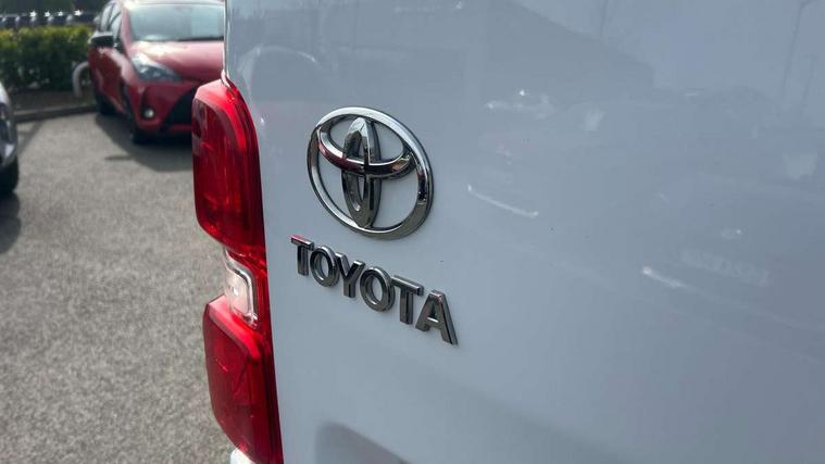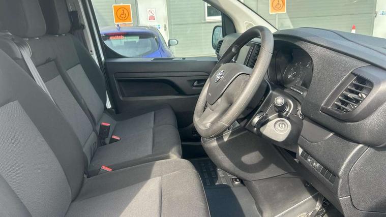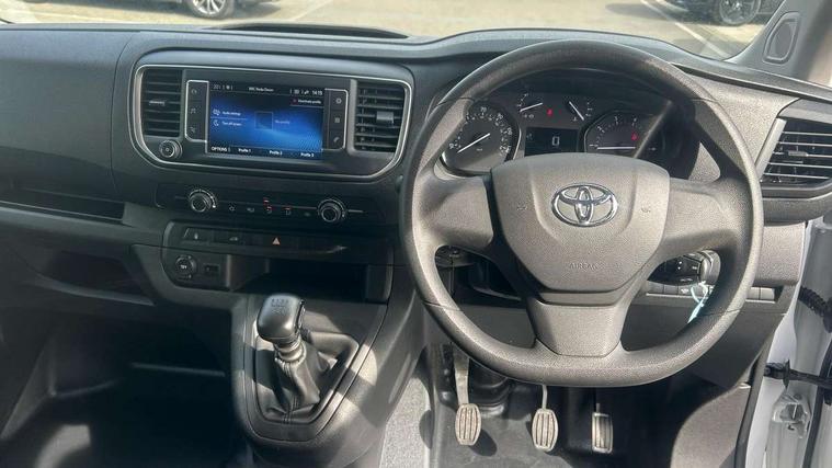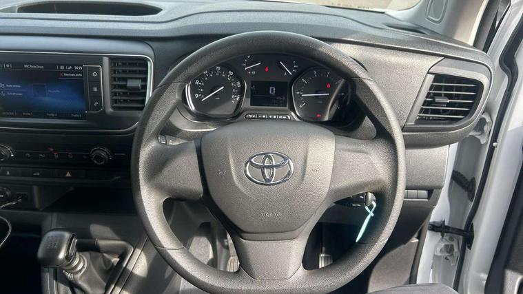 Bluetooth handsfree connectivity, Cruise control, PAS, Tyre pressure warning system (TPWS), 4 speakers, Digital radio (DAB), Radio/CD player, USB connector, 180 degree opening rear doors, Acoustic windscreen, Auto Headlights, Auto wipers, Black bumpers, Black door handles, Black protection moulding on side door, Body Coloured roof, Daytime running lights, Front power windows, Headlight cut-off reminder, Heated door mirrors, LED High mounted stop light, Manually adjustable day/night rear view mirror, Multi reflector halogen headlights, Panel rear wing doors, Power adjustable door mirrors, Rear combination lights, Short Antenna, Smoke tinted (30%) privacy glass on rear passenger window, Two manual sliding side doors, 2 seat front passenger bench, Driver seat armrest, Fabric seats, Front cup holders, Front room lights, Glovebox light, LED Driver and front passenger personal lights, Lighted and chilled upper glove box, Manually reclining and sliding driver and front passenger seats, Open upper dashboard storage compartment, Panel bulkhead with window and protective grille, Storage under passenger bench, Air conditioning and Smart cargo pack - Proace, Parking pack - Proace, Double front passenger airbag, Front passenger airbag on/off switch, Supplement restraint system (SRS) 2 airbags, Alarm, Deadlocks + 2 remote keys, Power door locks, 12V power front outlet, 12v socket in dashboard and rear, Adjustable speed limiter (ASL), Anti lock braking system (ABS), Brake Assist (BA), Stop/start function, Toyota traction select, Vehicle stability control (VSC) and hill start assist control (HAC), Full size spare wheel, Full wheel covers,