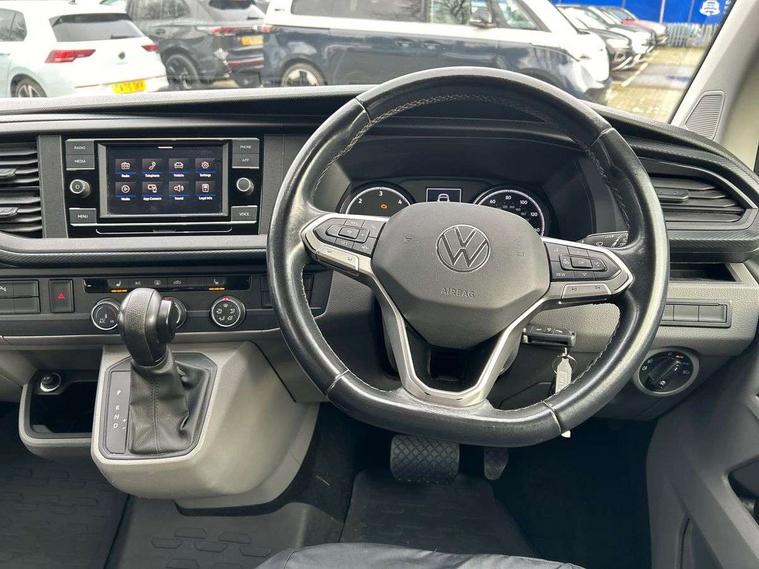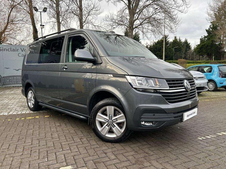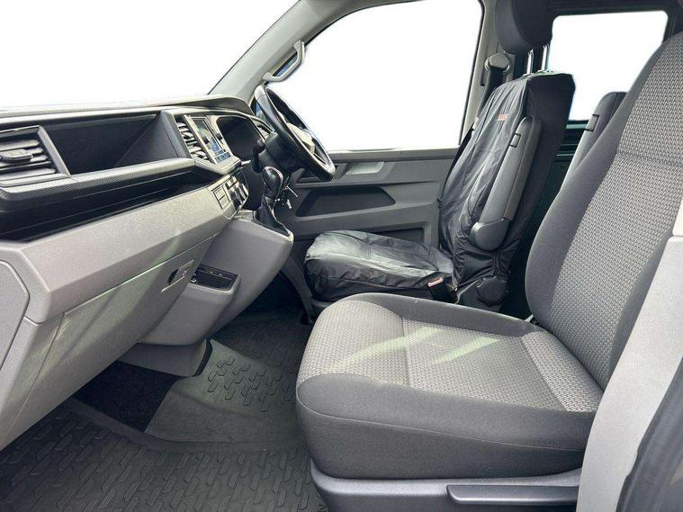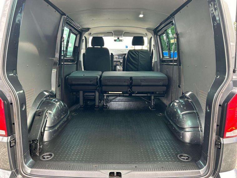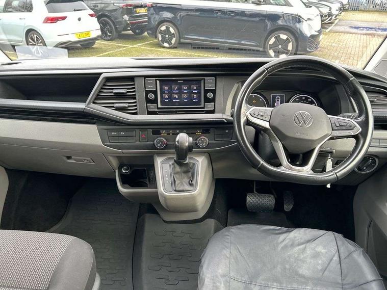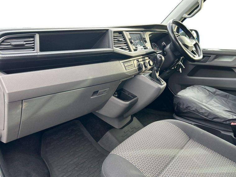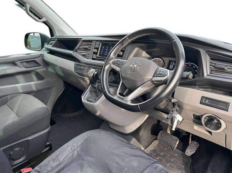 Adaptive cruise control, Child seat anchors ISOFIX and top tether in 2nd row of seats, Cross wind assist, Dimmable illuminated instruments, Driver alert with black and white multi function display plus, eCall emergency system, Electromechanical speed sensitive power steering, height and longitudinally adjustable steering column, Forward collision warning front assist with autonomous emergency braking, Headlight range control, Mobile phone interface, Without voice control, 2 USB interfaces type C in dashboard, 4 speakers with 2 tweeters and 2 woofers, Composition colour radio with 6.5" touchscreen, Digital radio reception (DAB+), Volkswagen app connect, Automatic headlight control, leaving home and manual coming home feature, Front fog lamps with cornering light, Green heat insulating glass, Heated front windscreen, Illuminated steps in passenger/load compartment, Left convex exterior mirror, Power adjustable and heated exterior mirrors, Power folding door mirrors, Privacy glass in passenger compartment, Radiator grille with 2 chrome trims, Rear window with heated insulating glass, heated rear window wiper and washer system, Right convex exterior mirror, Tailgate closing with unlatching from the inside, Tailgate with window aperture, Transporter nameplate on the rear fender, Windshield wiper intermittent control with rain sensor for windshield wipers, Without adhesive film, 3 spoke leather wrapped multi function steering wheel, Additional sound deadening measures in cab and passenger compartment, Auto dimming breakaway interior rear view mirror, Comfort headliner in cab, hardboard roof trim in passenger and load compartment, Dust/pollen filter, Folding grab handles and storage compartments on cab seats, reading light, Front seats on the right in 1st row of seat, Glove compartment with illumination, Heavy duty tool kit and jack, Interior plastic loading edge protection, Lashing rings for load restraint system, LED Interior lighting in load and passenger compartment, Medium height for vehicles with window aperture hardboard side trim panels in passenger/load compartment, Refrigerant R134a, Rubber floor covering in cab, Rubber floor covering in passenger/load compartment with loading edge protection in rear, Standard lower part dashboard in palladium, Without partition, Without seats in 3rd row of seats, Exterior pack without fog light- Transporter, Non smoker pack - Transporter, 3 point height adjustable seat belts on outer seats cab with electric pretensioners, Driver and front passenger airbag with front passenger airbag deactivation, Power operated child safety lock, Single tone horn, Warning buzzer and light for driver seat belt not fastened, Anti theft alarm system with interior monitoring in cab, backup horn and towing protection, Lockable wheel bolts, 16" chassis with 16" brake system, 70 L volume fuel tank, Additional 12V socket, Diesel particulate filter, Electronic stability control, ABS, ASR with deactivation button, hill start assist and brake assist system, Speed limiter, Start/stop system with regenerative breaking, 17" Devonport silver alloy wheels, Wheel trims,