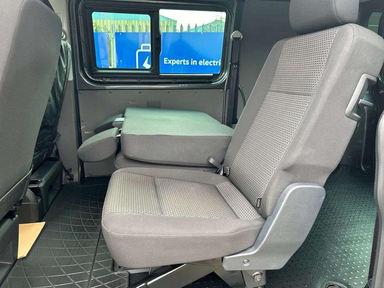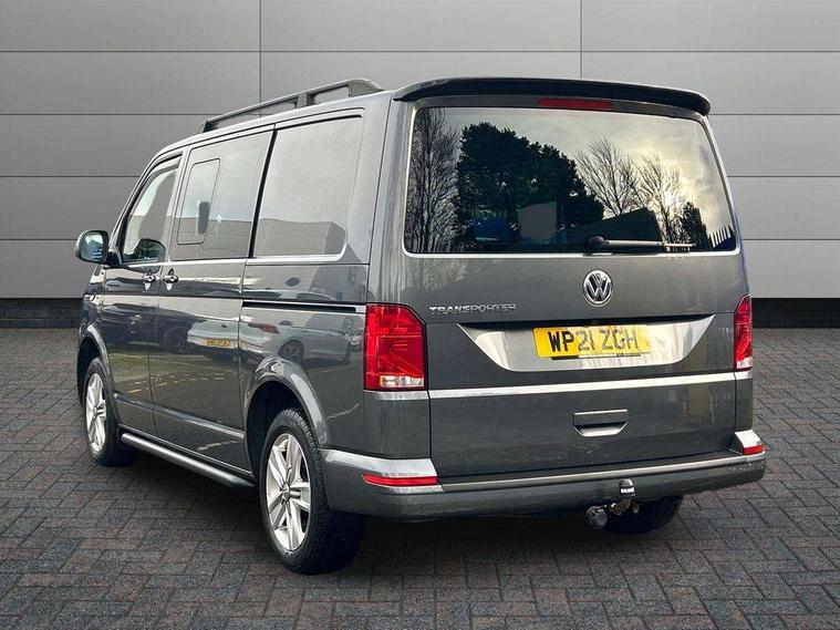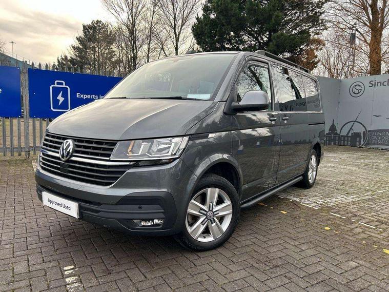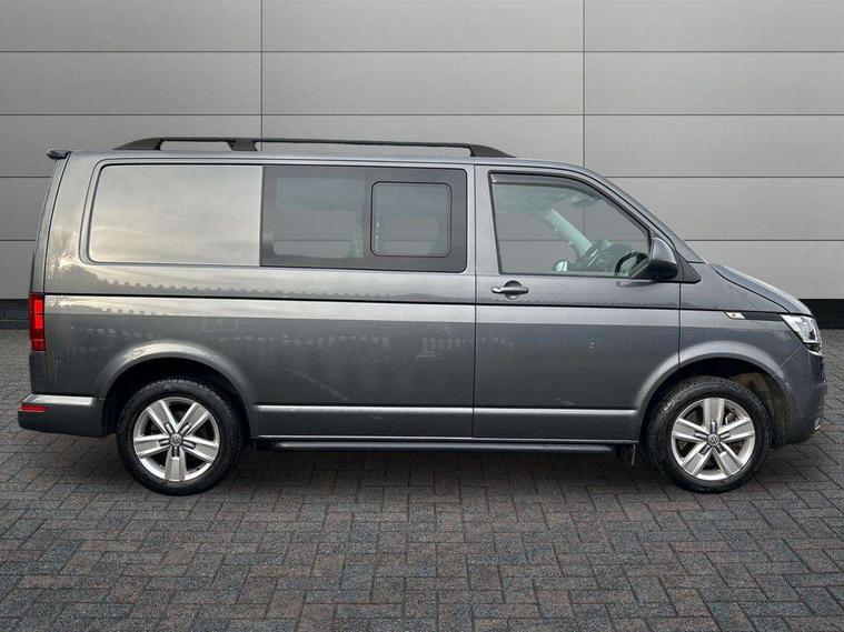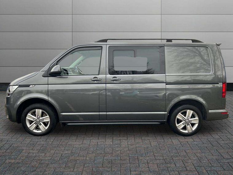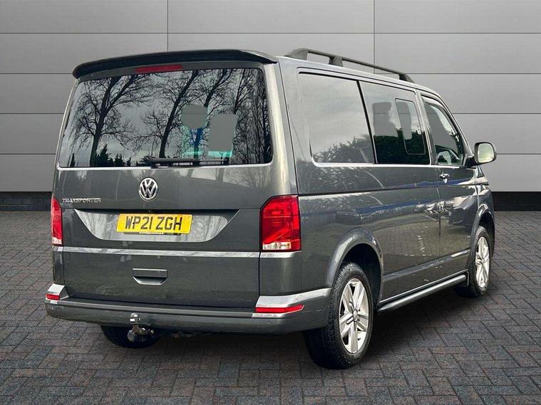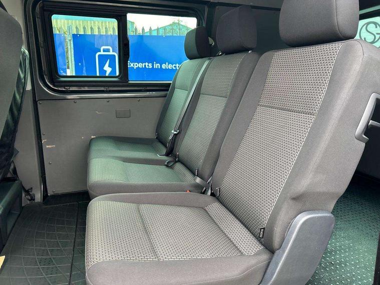 Adaptive cruise control, Child seat anchors ISOFIX and top tether in 2nd row of seats, Cross wind assist, Dimmable illuminated instruments, Driver alert with black and white multi function display plus, eCall emergency system, Electromechanical speed sensitive power steering, height and longitudinally adjustable steering column, Forward collision warning front assist with autonomous emergency braking, Headlight range control, Mobile phone interface, Without voice control, 2 USB interfaces type C in dashboard, 4 speakers with 2 tweeters and 2 woofers, Composition colour radio with 6.5" touchscreen, Digital radio reception (DAB+), Volkswagen app connect, Automatic headlight control, leaving home and manual coming home feature, Front fog lamps with cornering light, Green heat insulating glass, Heated front windscreen, Illuminated steps in passenger/load compartment, Left convex exterior mirror, Power adjustable and heated exterior mirrors, Power folding door mirrors, Privacy glass in passenger compartment, Radiator grille with 2 chrome trims, Rear window with heated insulating glass, heated rear window wiper and washer system, Right convex exterior mirror, Tailgate closing with unlatching from the inside, Tailgate with window aperture, Transporter nameplate on the rear fender, Windshield wiper intermittent control with rain sensor for windshield wipers, Without adhesive film, 3 spoke leather wrapped multi function steering wheel, Additional sound deadening measures in cab and passenger compartment, Auto dimming breakaway interior rear view mirror, Comfort headliner in cab, hardboard roof trim in passenger and load compartment, Dust/pollen filter, Folding grab handles and storage compartments on cab seats, reading light, Front seats on the right in 1st row of seat, Glove compartment with illumination, Heavy duty tool kit and jack, Interior plastic loading edge protection, Lashing rings for load restraint system, LED Interior lighting in load and passenger compartment, Medium height for vehicles with window aperture hardboard side trim panels in passenger/load compartment, Refrigerant R134a, Rubber floor covering in cab, Rubber floor covering in passenger/load compartment with loading edge protection in rear, Standard lower part dashboard in palladium, Without partition, Without seats in 3rd row of seats, Exterior pack without fog light- Transporter, Non smoker pack - Transporter, 3 point height adjustable seat belts on outer seats cab with electric pretensioners, Driver and front passenger airbag with front passenger airbag deactivation, Power operated child safety lock, Single tone horn, Warning buzzer and light for driver seat belt not fastened, Anti theft alarm system with interior monitoring in cab, backup horn and towing protection, Lockable wheel bolts, 16" chassis with 16" brake system, 70 L volume fuel tank, Additional 12V socket, Diesel particulate filter, Electronic stability control, ABS, ASR with deactivation button, hill start assist and brake assist system, Speed limiter, Start/stop system with regenerative breaking, 17" Devonport silver alloy wheels, Wheel trims,