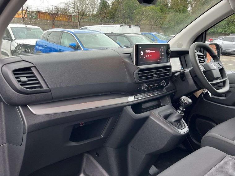 10" digital instrumental cluster, Central fascia display with digital clock, outside air temperature and audio information, Connectivity via BTA with RCE, Cruise control and speed limiter, Driver Attention Alert, level - 4 (Incl driver weariness camera), e-Call and b-Call, Electronic power steering (EPS), Energy absorbing steering column, Forward collision alert, Intelligent Speed Assist, Lane keeping assist, Mobile phone portal - Bluetooth, Vehicle microphone, Phone book access, Smartphone interface with Apple carplay/Android Auto, Multi-function trip computer, Rear parking distance sensor, TPMS (Tyre pressure monitoring system), Vauxhall connect, Audio controls mounted on steering wheel, Flexible short antenna (200mm), Two speakers and two tweeters, Automatic headlamps on/off, Automatic two speed and intermittent front wipers, Black door handles, Black front and rear bumpers, Black side protection mouldings, Black sliding door rail cover, Electrically adjustable + heated door mirrors, Familial vizor, Flexible roof mounted aerial, Front electric windows with one touch facility, Front windows tinted to 30 percentage opacity, Halogen headlamp with integrated daytime running lights, High beam assist, High level third brake light, Laminated acoustic windscreen, Lockable fuel filler cap, Offside and nearside sliding side access doors, Rain sensitive windscreen wipers, Rear fog lights, Twin solid rear doors, Twin unglazed rear doors opening to 180 degree, Visible VIN at windscreen base, 12V socket in lower glove box (1 only in cabin), Air recirculation facility, Closed upper and open lower glove boxes, Cup holders for driver and passenger at top of dashboard, Curitiba cloth upholstery, Dashboard storage areas, Driver's seat armrest, Ergonomic 6-way adjustable driver's seat with reach, rake, height and lumbar adjustment, Fixed floor mounted load restraint lashing eyes x8, Front door pockets with 1.5L bottle holder, Hard plastic floor protection in cabin, Height adjustable front headrests, Manual air conditioning, Overhead console with 1 ceiling lamp (dome type and 3 lamps), Reach and rake adjustable steering wheel, Roof trim in cabin (1st Row), USB socket in cabin (dashboard), Automatic unlocking system in case of crash, Door opening warning and audible lights on warning, Driver and front passenger airbags, Height adjustable 3-point pre-tensioner seatbelts with force limiter, Passenger airbag deactivation manually, Unfastened seat belt warning for driver and passengers, Dashboard mounted central locking push button and auto locking above 7mph, Engine deadlock immobiliser, Remote control central deadlocking, Selective cabin and cargo area locking via 3-button plip remote control key (x2), Selective door locking, Two keys with integral remote, 19 litres AdBlue tank, 70L fuel tank, ABS, Advanced emergency braking system (AEBS), EBA, Electric parking brake, Electronic brake force distribution (EBFD), ESC, ESP, Floor mounted handbrake lever, Hill start assist, Traction control, Mistral black dashboard trim with liquid paladium decor strip in mid-section, Michelin Agilis 2 tyres - 215/65 R16C,