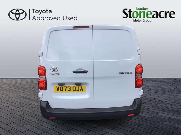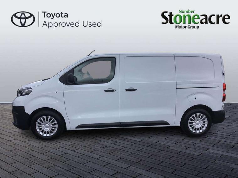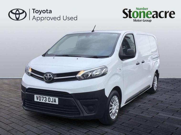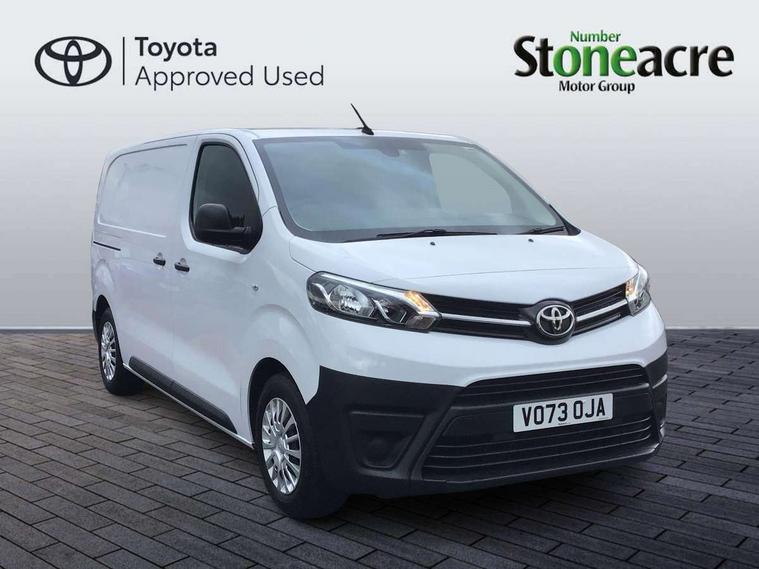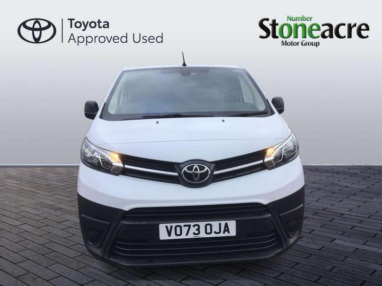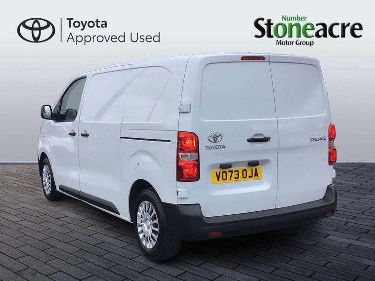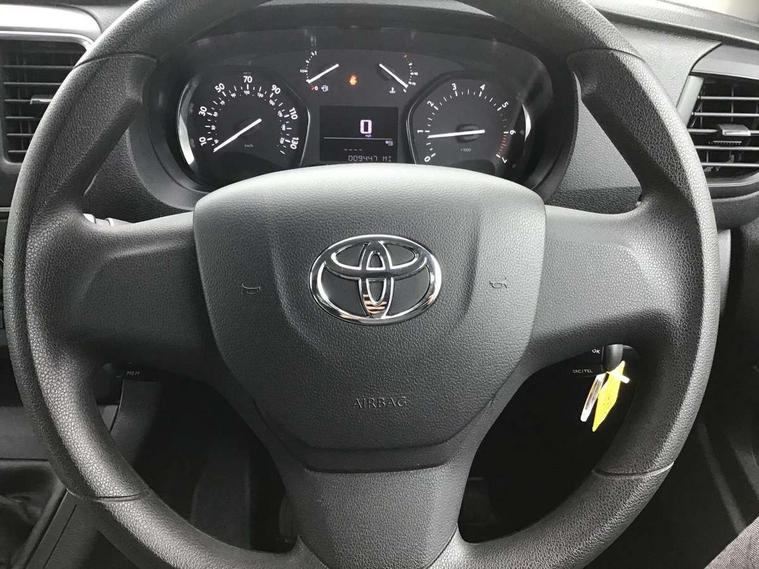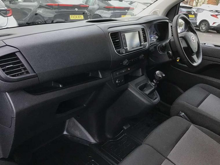 Bluetooth handsfree connectivity, Cruise control, PAS, Tyre pressure warning system (TPWS), 4 speakers, Digital radio (DAB), Radio/CD player, USB connector, 180 degree opening rear doors, Acoustic windscreen, Auto Headlights, Auto wipers, Black bumpers, Black door handles, Black protection moulding on side door, Body Coloured roof, Daytime running lights, Front power windows, Headlight cut-off reminder, Heated door mirrors, LED High mounted stop light, Manually adjustable day/night rear view mirror, Multi reflector halogen headlights, Panel rear wing doors, Power adjustable door mirrors, Rear combination lights, Short Antenna, Smoke tinted (30%) privacy glass on rear passenger window, Two manual sliding side doors, 2 seat front passenger bench, Driver seat armrest, Fabric seats, Front cup holders, Front room lights, Glovebox light, LED Driver and front passenger personal lights, Lighted and chilled upper glove box, Manually reclining and sliding driver and front passenger seats, Open upper dashboard storage compartment, Panel bulkhead with window and protective grille, Storage under passenger bench, Air conditioning and Smart cargo pack - Proace, Parking pack - Proace, Double front passenger airbag, Front passenger airbag on/off switch, Supplement restraint system (SRS) 2 airbags, Alarm, Deadlocks + 2 remote keys, Power door locks, 12V power front outlet, 12v socket in dashboard and rear, Adjustable speed limiter (ASL), Anti lock braking system (ABS), Brake Assist (BA), Stop/start function, Toyota traction select, Vehicle stability control (VSC) and hill start assist control (HAC), Full size spare wheel, Full wheel covers,