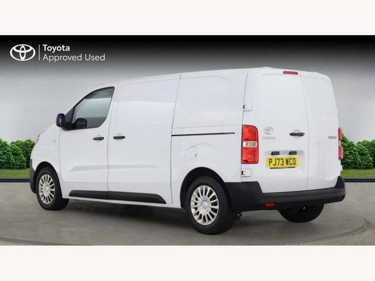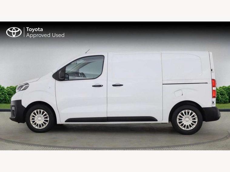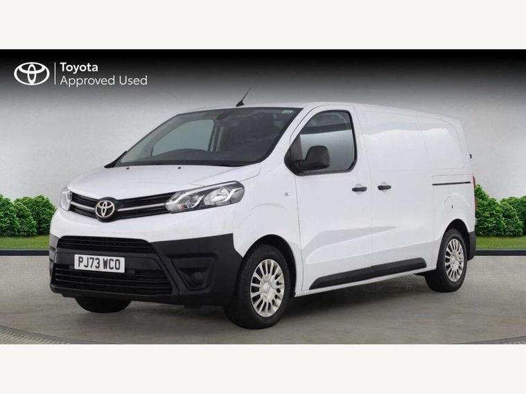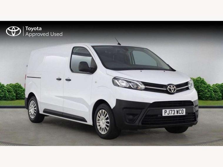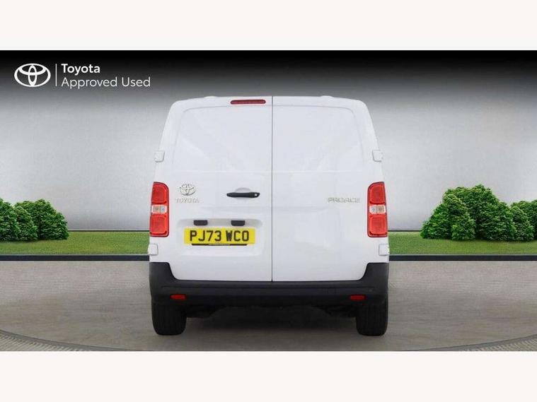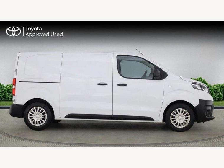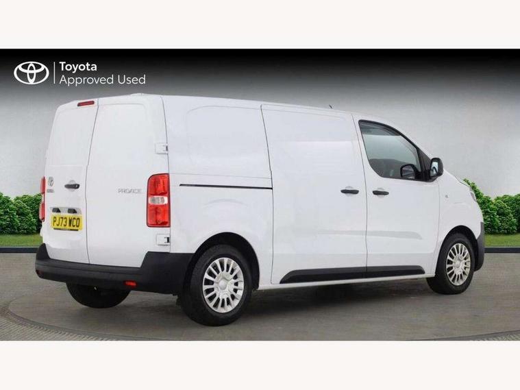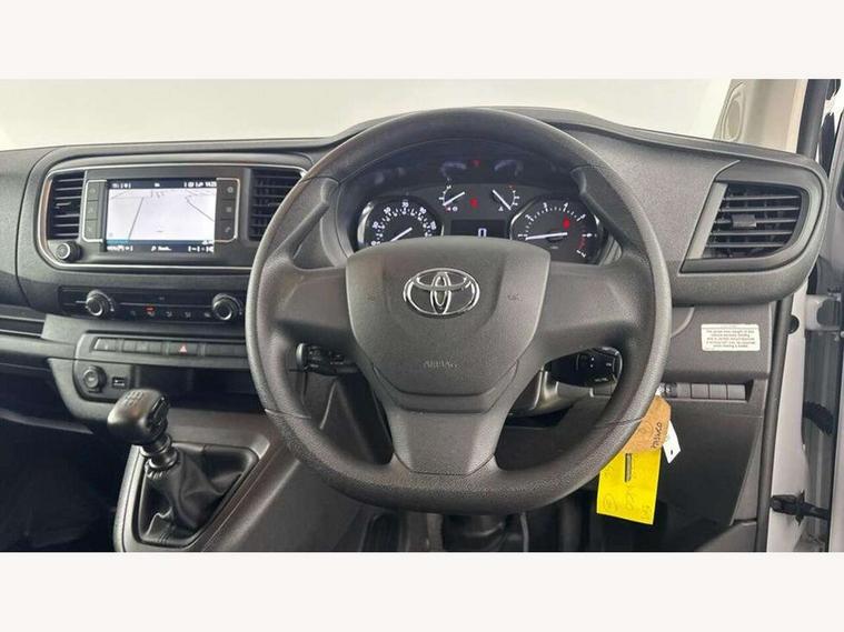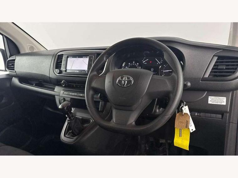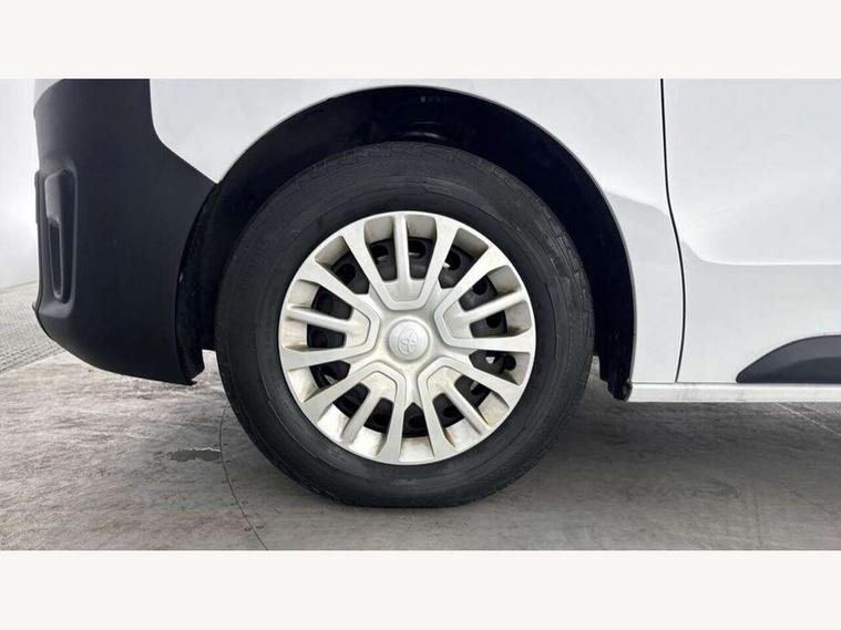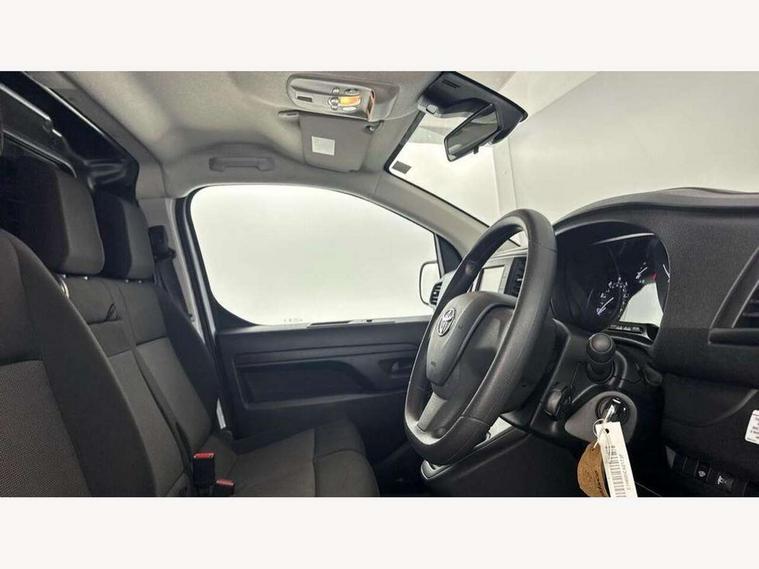 Bluetooth handsfree connectivity, Cruise control, PAS, Tyre pressure warning system (TPWS), 4 speakers, Digital radio (DAB), Radio/CD player, USB connector, 180 degree opening rear doors, Acoustic windscreen, Auto Headlights, Auto wipers, Black bumpers, Black door handles, Black protection moulding on side door, Body Coloured roof, Daytime running lights, Front power windows, Headlight cut-off reminder, Heated door mirrors, LED High mounted stop light, Manually adjustable day/night rear view mirror, Multi reflector halogen headlights, Panel rear wing doors, Power adjustable door mirrors, Rear combination lights, Short Antenna, Smoke tinted (30%) privacy glass on rear passenger window, Two manual sliding side doors, 2 seat front passenger bench, Driver seat armrest, Fabric seats, Front cup holders, Front room lights, Glovebox light, LED Driver and front passenger personal lights, Lighted and chilled upper glove box, Manually reclining and sliding driver and front passenger seats, Open upper dashboard storage compartment, Panel bulkhead with window and protective grille, Storage under passenger bench, Air conditioning and Smart cargo pack - Proace, Parking pack - Proace, Double front passenger airbag, Front passenger airbag on/off switch, Supplement restraint system (SRS) 2 airbags, Alarm, Deadlocks + 2 remote keys, Power door locks, 12V power front outlet, 12v socket in dashboard and rear, Adjustable speed limiter (ASL), Anti lock braking system (ABS), Brake Assist (BA), Stop/start function, Toyota traction select, Vehicle stability control (VSC) and hill start assist control (HAC), Full size spare wheel, Full wheel covers,