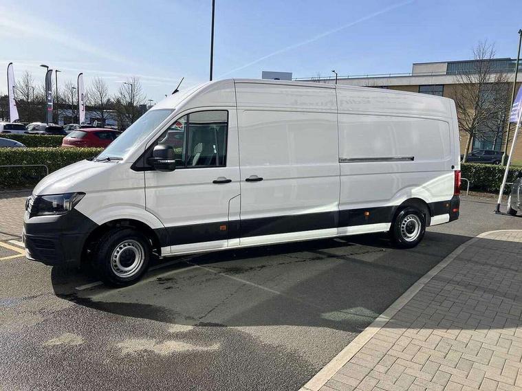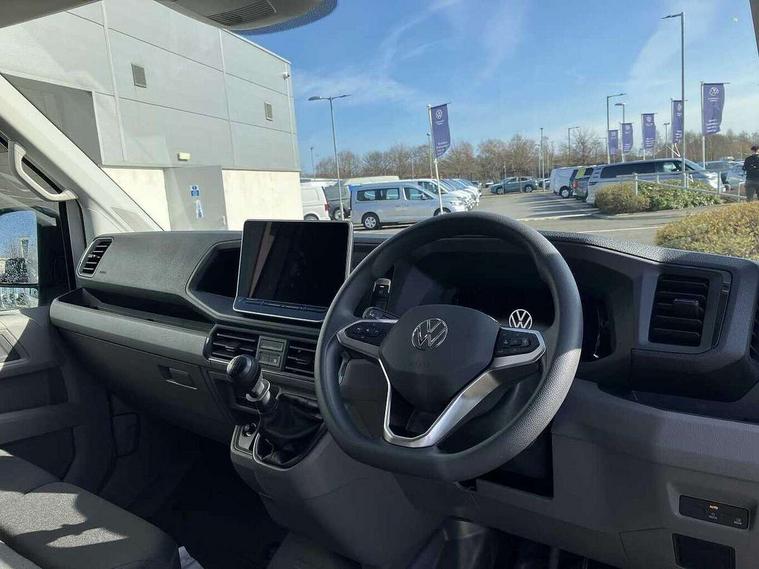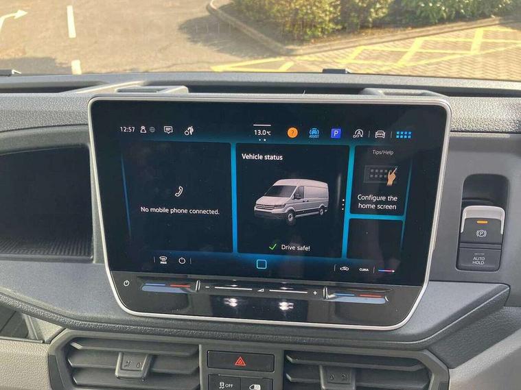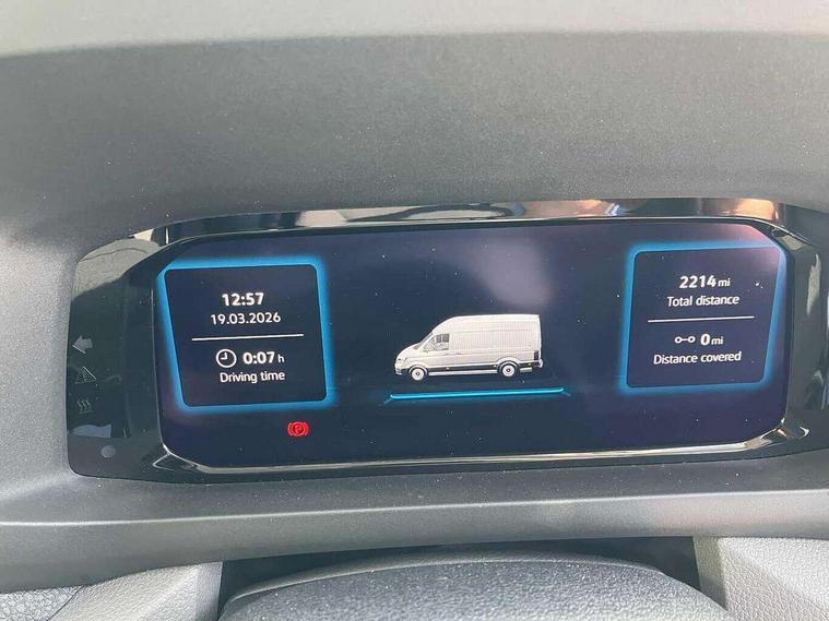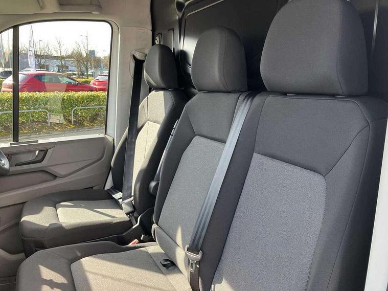 Advanced driver attention and drowsiness monitor, Blind spot monitor, Bluetooth, Digital clock, Digital cockpit with active Info display, Dynamic road sign display, E-call + We connect basic preparation, Forward collision warning with warning and braking reaction to vehicles, pedestrians and cyclists, Front assist including city emergency braking, Instrument cluster, Lane keeping assist, Lights on warning buzzer, Locking fuel cap, Rev counter, Roof console for interior lighting control, Service indicator, Speedometer, USB socket at top of windscreen, Wireless charging, 2 USB C ports in dashboard, DAB Radio, Auto low beam mode, Leaving home function and manual coming home function, Black unpainted plastic front bumper, Cab doors, Convex and wide angle mirror, Driver seatbelt warning light, Electric windows, Heat insulating glass, Indicators in front door mirrors, One towing eye in front, Rear badges, Special identification plate, Touch panel control for exterior lights, Unpainted radiator grille, Windscreen wiper auto control with light and rain sensor, Air recirculation system, Ashtray, Centre console storage tray, CFCU preparation, Charcoal filter, Document holder on centre console, Drinks holders, Electromechanical Servotronic steering, Electronically controlled heating system, Fully adjustable suspension type driver seat, Height adjustable head restraints, Height and reach adjustable steering wheel, Illuminated glove compartment with lockable lid, Interior light, including 2 reading lights, Interior light, switchable by door, Jack and tool kit, Preparation for interface for external use with terminal block, Storage compartments in doors and in step, right, Storage tray on dashboard, Two 12V outlets in the cab (in the dashboard), Without rear side trim panel passenger load compartment, Non-smokers pack - Crafter, 3 point inertia reel belt on all seats, Automatic hazard light with emergency braking, Crosswind assist, Driver and front passenger airbag with front passenger airbag deactivation, Height adjustable seatbelts for outer cab seats, 1 rigid key, Central locking system with Keyless Go without SAFELOCK entry - Keyless entry and start, Engine immobiliser, ABS, Automatic post collision braking system, EBA, EBD, EDL, Electronic parking brake - hill hold control, ESP, Front disc brakes, HBA, Hill start assist, Start and stop system with regenerative braking, TCS, Hub cap covers,