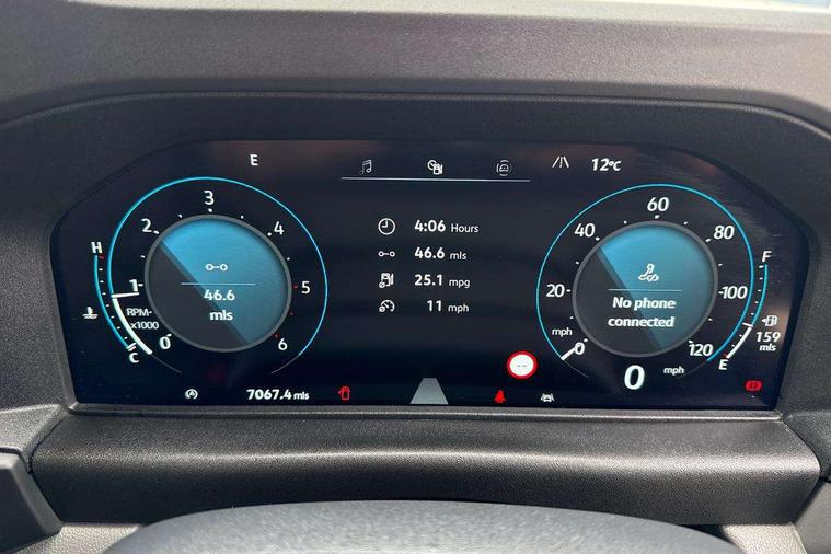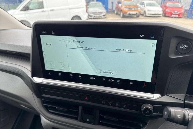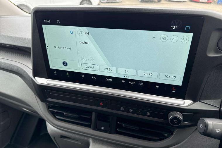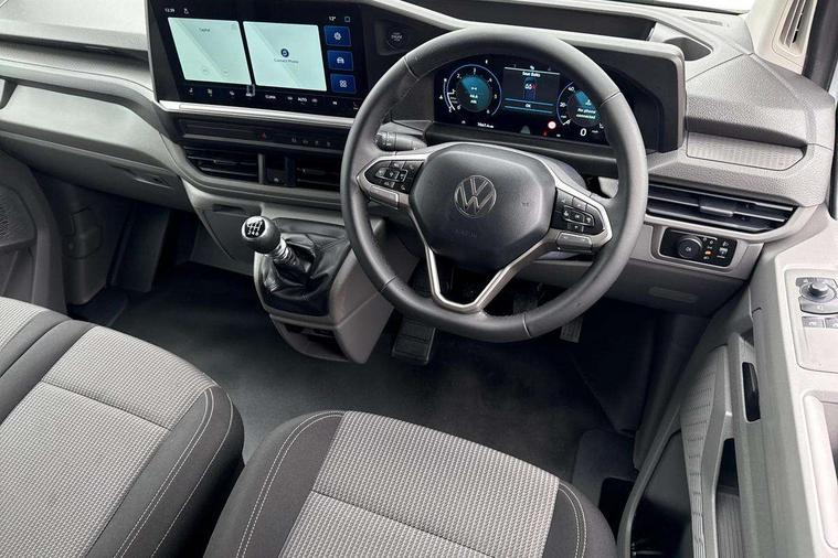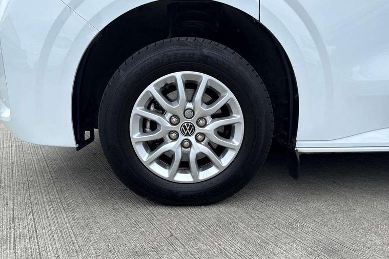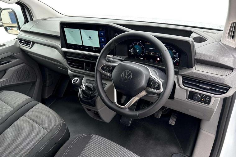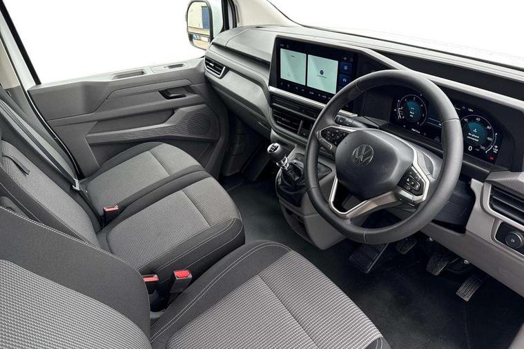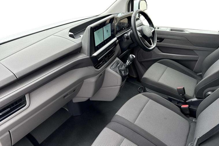 12" digital drivers display, 13" touchscreen infotainment display with wireless app connect and DAB radio, 5G Modem, Adaptive cruise control, Apple CarPlay and Android Auto, Dynamic road sign display, eCall emergency system, Electromechanical speed sensitive power steering, height and longitudinally adjustable steering column, Lane and blind spot assist with exit warning system, Preparation of VW connect and connect plus, Wireless mobile phone charging, Wrong way driver warning, Body colour bumpers, Body coloured door handles, Body coloured door mirrors, Body coloured radiator grille, Electrically heated, adjustable and folding door mirrors, Heat reflecting side window glass, Mud flaps front and rear, Rear Transporter nameplate in black grained decorative trim, Vehicle opening configuration 1x 1st row of seats, 2x all doors, 12V outlet in centre console and 12V outlet on rear right D-pillar, 2x 15-W USB data/charging ports in dashboard and 1x USB-C, 1x USB-A center bottom, 2x LED lights in load compartment, 3x additional super bright LED lights in load compartment, 4 way height and tilt adjustable head restraints, 5 additional USB-C charging ports, Black plastic scuff plate for sliding door in cargo without illumination, Cabin interior lighting, Glasses compartment in driver side roof, Grab handle on A-pillar passenger side, Illuminated lockable glovebox, Lashing rings for reinforced floor covering, Leatherette gear lever, Narrow centre console with cup holder and compartment for mobile phone, Overhead storage compartment, Rubber floor covering in cab, Striped fabric upholstery, Without passenger seats in load compartment, Driver and front passenger airbag with front passenger airbag deactivation, Dual tone horn, Front and curtain airbags for driver and front passenger, Seat belt pretensioner for driver seat, Anti theft alarm system with interior monitoring in cab, backup horn and towing protection, Electronic immobiliser, Lockable wheel bolts, Preparation for alcohol ignition interlock, 5+ Promise, Alternator - 230A, Electromechanical brake booster, Electronic stability control, ABS, ASR with deactivation button, hill start assist and brake assist system,