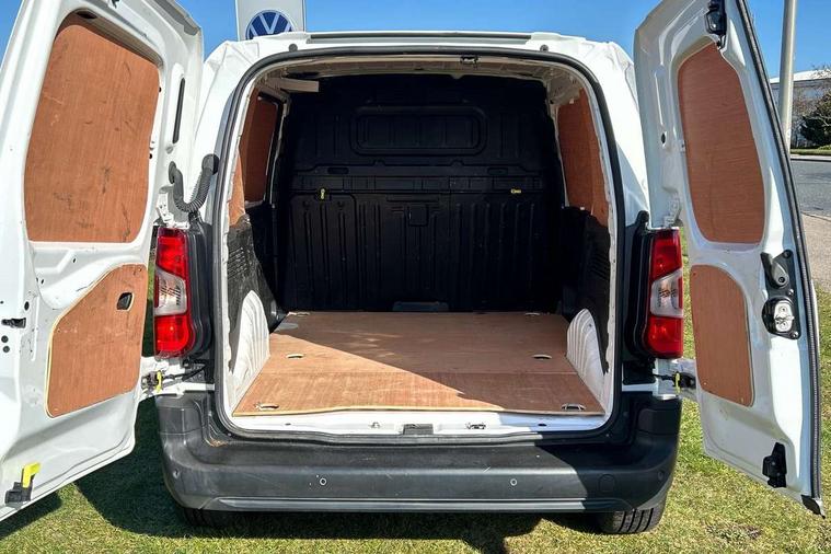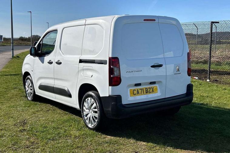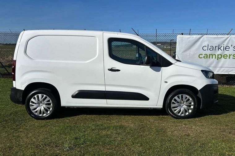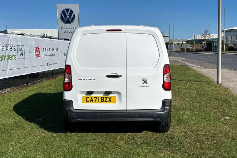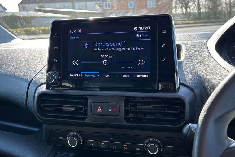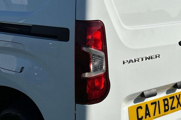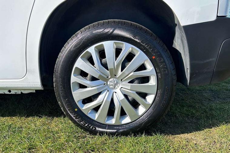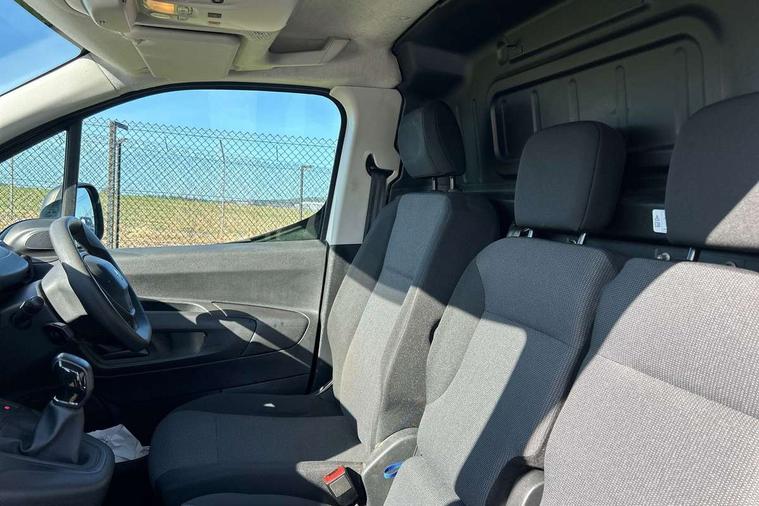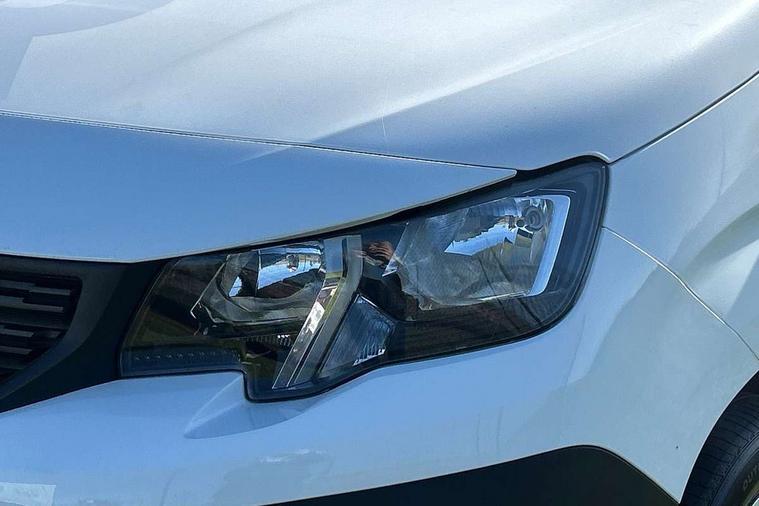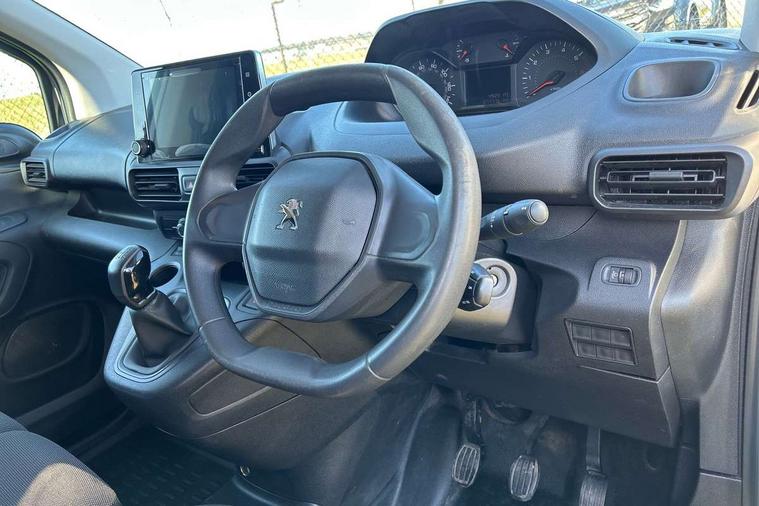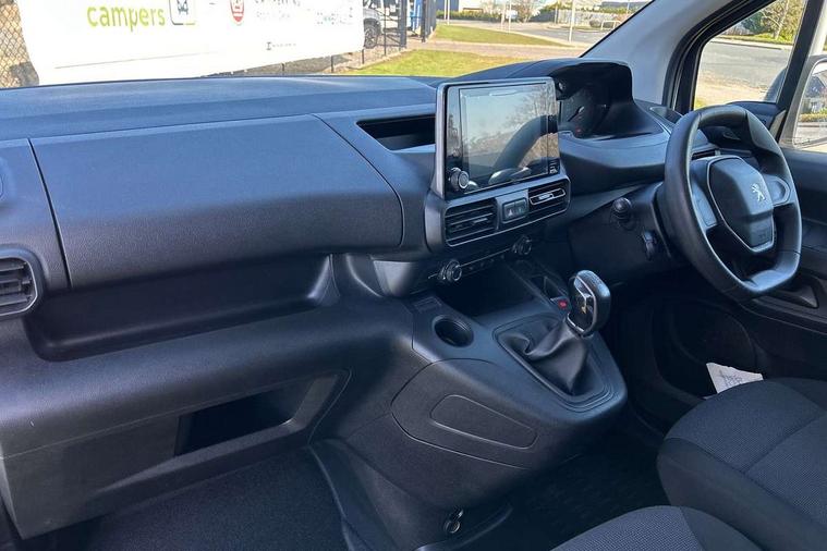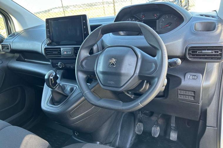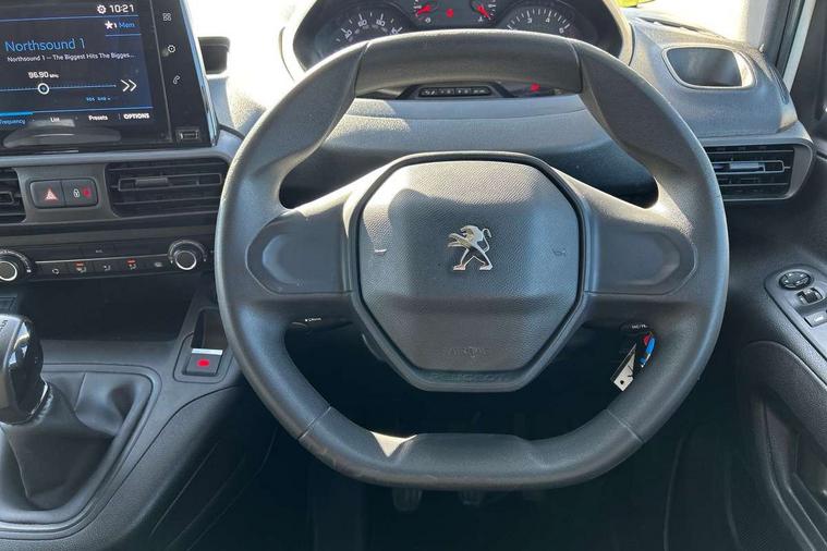 Electric power assisted steering with height and reach adjustable steering wheel, Lockable fuel cap, Multi-function on-board trip computer, Peugeot connect with SOS assistance, Rev counter with maintenance and gear efficiency indicators (GEI), Tyre pressure monitor, Apple Carplay/Android Auto, Electric front windows with one touch operation, Electrically adjustable door mirrors, Electrically folding door mirrors with temperature sensor, Front fog lights, Heated door mirrors, Height adjustable halogen headlights with automatic illumination and integrated daytime running lights (DRLs), High level third brake light, Nearside side sliding door, Two speed intermittent front wipers, Visible VIN at windscreen base, 12 volt socket in dashboard, 6 floor mounted load securing rings, 6 way adjustable driver seat with lumbar support and under seat storage, Cup holders for driver and passenger on either side of the dashboard, Curitiba cloth upholstery, Front door pockets with 1.5L bottle holder, Hard plastic floor protection in cabin, Multiflex modular folding passenger bench seat with pivoting writing table, storage under central seat, load through hatch and load protection cover, Overhead storage shelf in cabin, Upper glove box storage compartment, Automatic activation of hazard warning lights on major deceleration, Door opening warning and audible lights on warning, Driver and passenger seatbelt unfastened warning, Driver's airbag, Dashboard mounted central locking push button and auto locking above 7mph, Manual door lock for front passenger door, Perimetric and volumetric thatcham category 1 approved alarm with tilt sensor, Remote central locking with deadlocking, selective cab and load area locking via 3 button plip remote control key, Thatcham approved rolling code transponder immobiliser, Automatic electronic parking brake, Electronic Stability Control and ABS with hill start assist, EBA and EBFD, Full size steel spare wheel,
