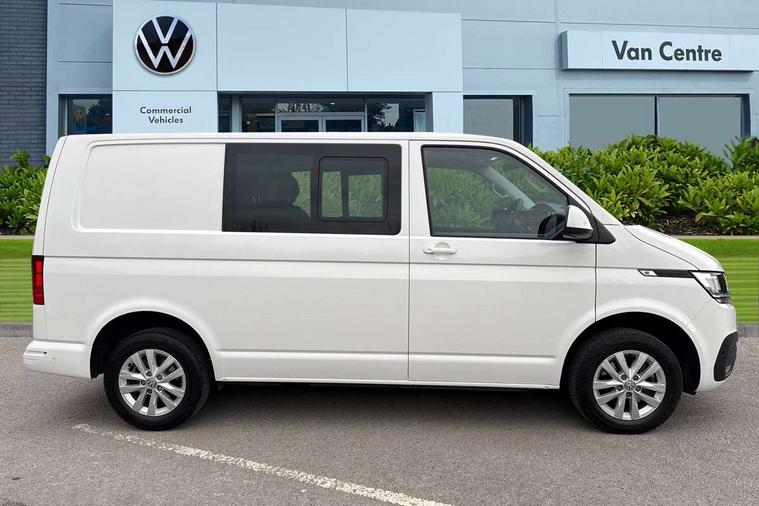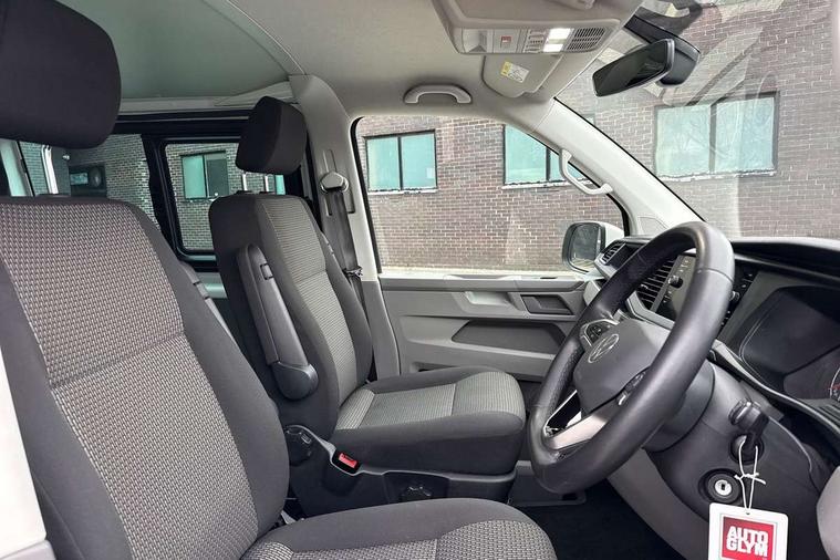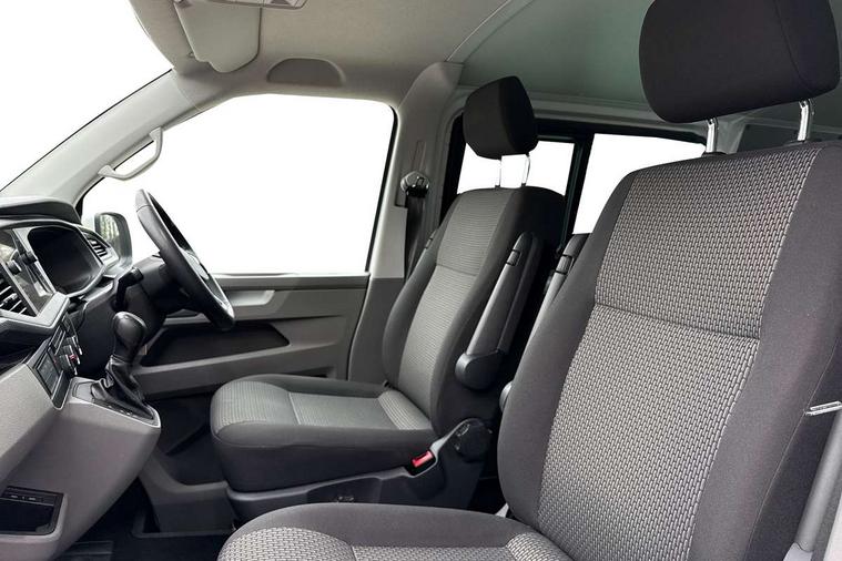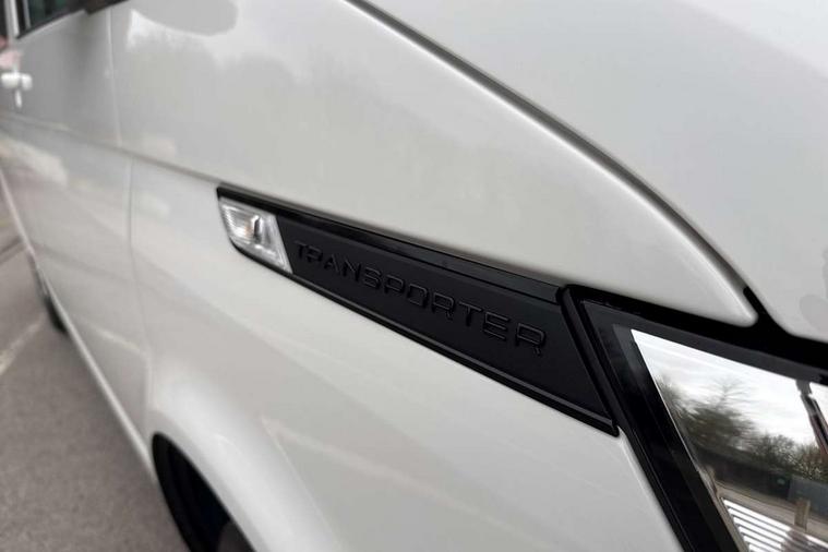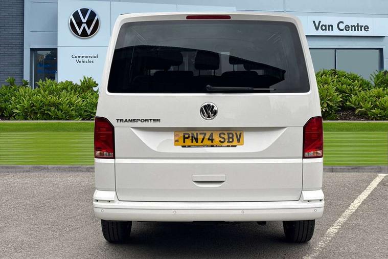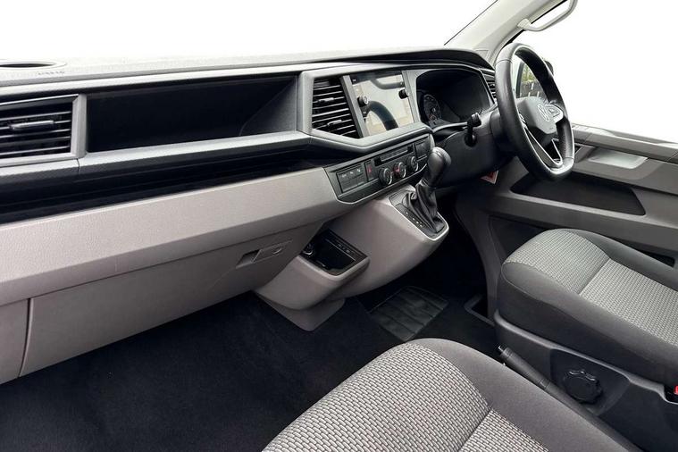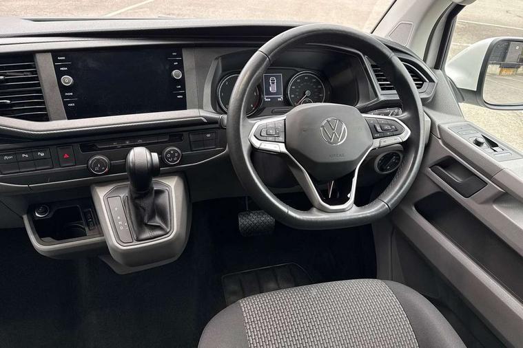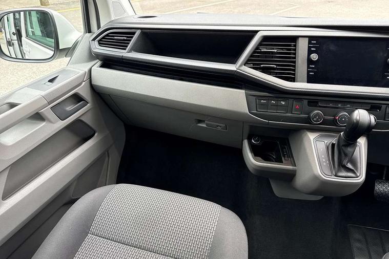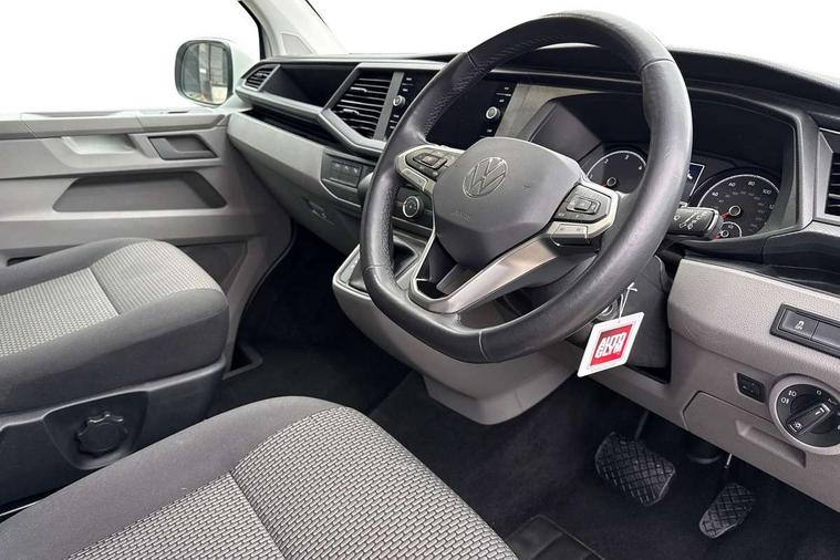 Adaptive cruise control, Child seat anchors ISOFIX and top tether in 2nd row of seats, Cross wind assist, Dimmable illuminated instruments, Driver alert with black and white multi function display plus, eCall emergency system, Forward collision warning front assist with autonomous emergency braking, Headlight range control, Mobile phone interface, Without voice control, 2 USB interfaces type C in dashboard, 4 speakers with 2 tweeters and 2 woofers, Composition colour radio with 6.5" touchscreen, Digital radio reception (DAB+), Volkswagen app connect, Automatic headlight control, leaving home and manual coming home feature, Front fog lamps with cornering light, Green heat insulating glass, Heated front windscreen, Illuminated steps in passenger/load compartment, Left convex exterior mirror, Power folding adjustable door mirrors with separately heated, Privacy glass from the B-pillar and heat-insulating glass in front, Radiator grille with 2 chrome trims, Rear window with heated insulating glass, heated rear window wiper and washer system, Right convex exterior mirror, Tailgate closing with unlatching from the inside, Transporter nameplate on the rear fender, Windshield wiper intermittent control with rain sensor for windshield wipers, Without adhesive film, 3 spoke leather wrapped multi function steering wheel, Additional sound deadening measures in cab and passenger compartment, Auto dimming breakaway interior rear view mirror, Comfort headliner in cab, hardboard roof trim in passenger and load compartment, Dust/pollen filter, Folding grab handles and storage compartments on cab seats, reading light, Front seats on the right in 1st row of seat, Glove compartment with illumination, Heavy duty tool kit and jack, Interior plastic loading edge protection, Lashing rings for load restraint system, LED Interior lighting in load and passenger compartment, Manual height adjustable and lumbar support for driver and single passenger seats, Medium height for vehicles with window aperture hardboard side trim panels in passenger/load compartment, Refrigerant R134a, Standard lower part dashboard in palladium, Without partition, Without seats in 3rd row of seats, Comfort pack - Transporter, Exterior pack without fog light- Transporter, Light and vision pack - Transporter, Non smoker pack - Transporter, 3 point height adjustable seat belts on outer seats cab with electric pretensioners, Driver and front passenger airbag with front passenger airbag deactivation, Power operated child safety lock, Warning buzzer and light for driver seat belt not fastened, Anti theft alarm system with interior monitoring in cab, backup horn and towing protection, Lockable wheel bolts, 16" chassis with 16" brake system, Additional 12V socket, Diesel particulate filter, Electronic stability control, ABS, ASR with deactivation button, hill start assist and brake assist system, Speed limiter, Start/stop system with regenerative breaking, 16" Clayton alloy wheels, Wheel trims,