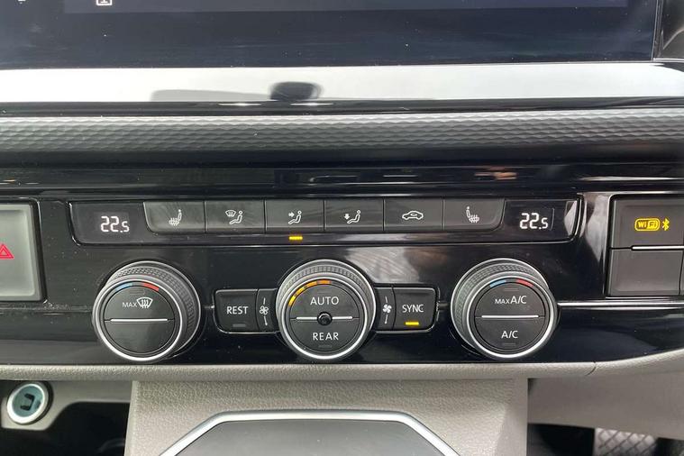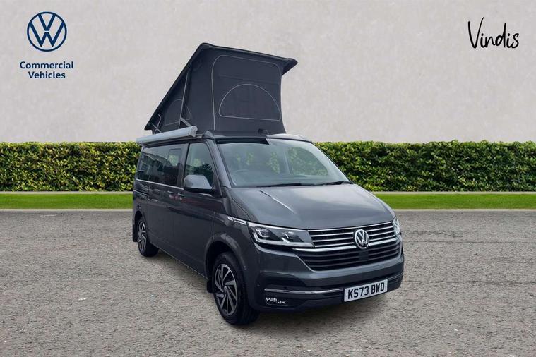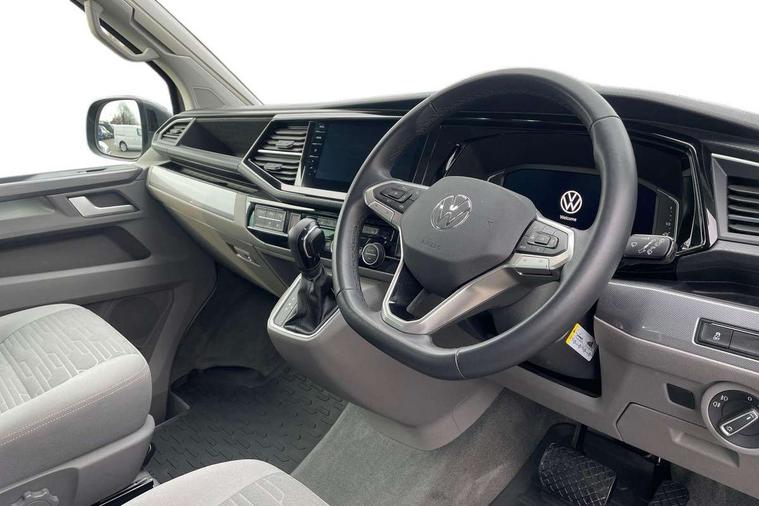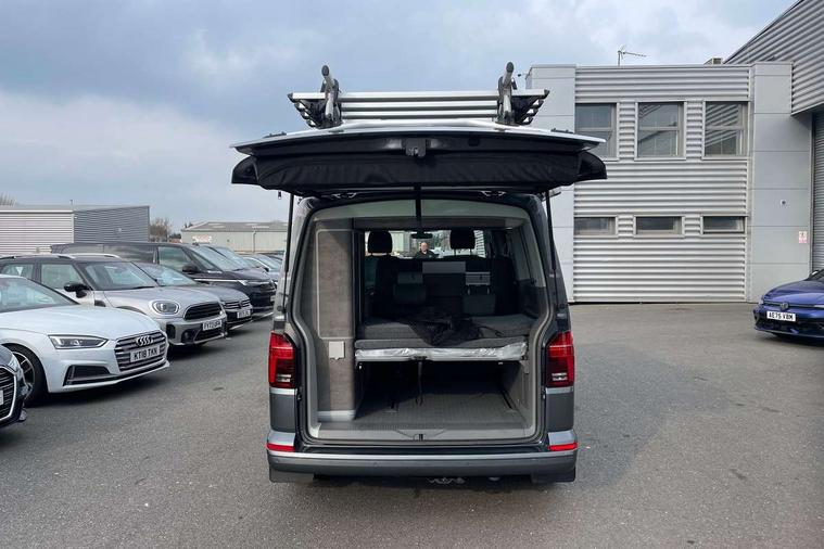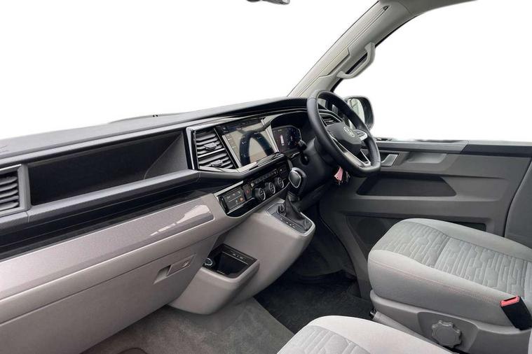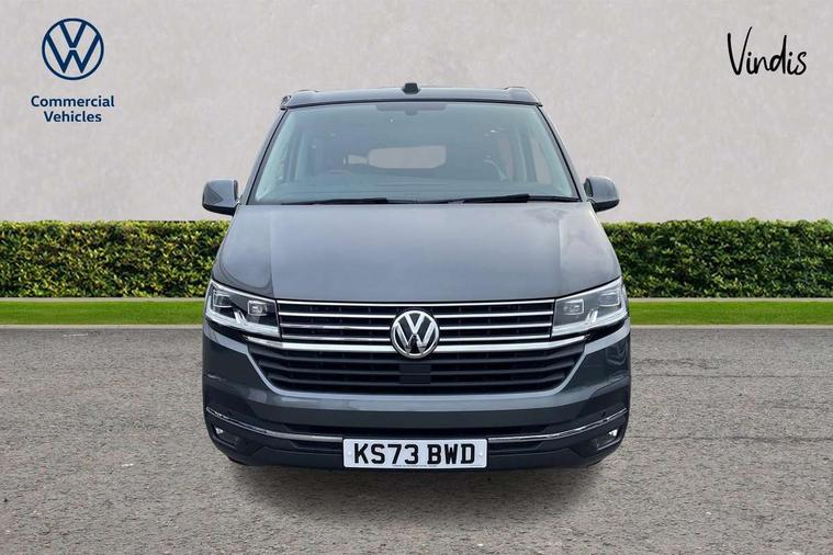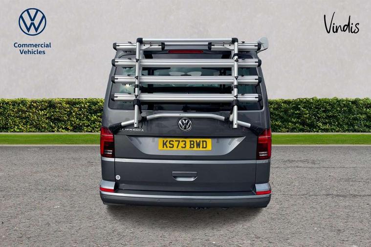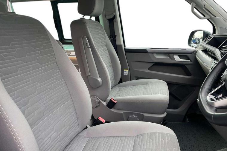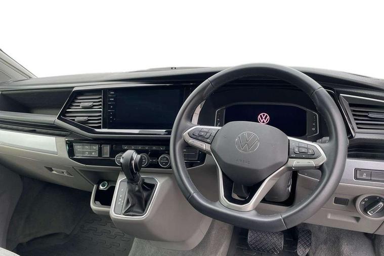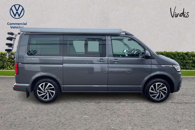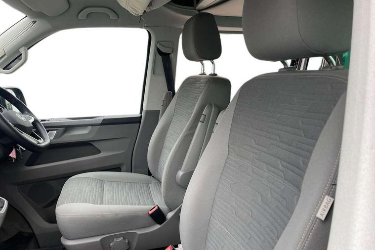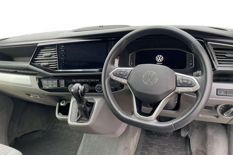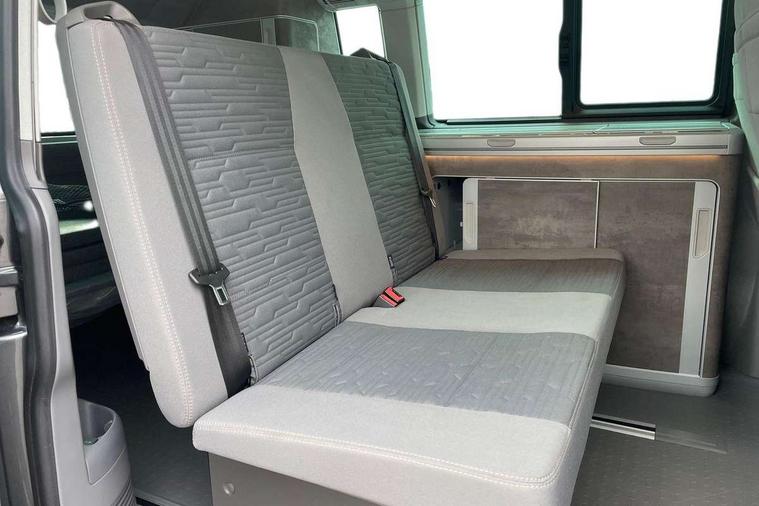 8" touch screen, Adaptive cruise control with speed limiter and city emergency braking, Cross wind assist, Digital cockpit and driver alert system, eCall emergency system, Lane assist with side assist, Mobile phone interface, Navigation system preparation, Service interval indicator, Speed limiter, Start/stop system with regenerative braking, Tailgate latch without unlocking function from inside, Tailgate with window aperture and with power latching, Voice control system, Wired and wireless app connect, 17 inch chassis with 17 inch disc brakes in front and 16 inch disc brake in rear, 2 additional batteries with free maintanace including 1 additional battery with cut-off relay, 2 (type C) USB interfaces in dashboard, 8 speakers (4 tweeters + 4 woofers), Digital radio reception (DAB+), Regional code ECE for radio, Additional dust seals on the outside, Automatic headlight range control, Body colour bumpers, Body coloured door handles, Body coloured door mirrors, California badge on the front wing and on the rear, California nameplate on the fender and on the rear, Electrically adjustable, heated, folding exterior mirrors, Electrohydrolic operated pop up roof with 3 windows and 1 front aperture, Front fog lights with cornering function, Heat insulating cab side windows, passenger compartment side windows tinted and with double glazing, Heated washer nozzles in front and washer fluid level indicator, High level 3rd brake light, LED headlamps with LED separate daytime running light, Left convex exterior mirror, Mounting rails on the roof (preparation for movable roof rack), Power adjustable, heated exterior mirrors, Privacy glass with heat insulation, Radiator grille painted in black with 5 chrome trims, additional chrome trim at lower radiator grille, Rear boot, Rear wardrobe with hanging rail and mirror, Rear window with insulating glass, rear window wiper and washer system, Right convex exterior mirror, Sliding window in front with fly screen and fixed window in rear in load passenger compartment left, Sliding window in front with fly screen and fixed window in rear in load passenger compartment right, Without left sliding door in load/passenger compartment, 1 waste bin in door storage compartment of the cab, 12V outlets in dashboard X 2, 2 velour floor mats, 2-seater bench/bed, movable along rail system and folds down into a two person bed, 230V inlet with charging feature for vehicle batteries and 230V outlet in the interior, 3 spoke leather wrapped multifunction steering wheel, Additional LED light in the pop up roof, tailgate and kitchen cupboards, Allergen filter, Armrest for both cab seats, Camping table for inside/outside in sliding door and 2 folding chairs in tailgate, Child seat anchors ISOFIX and top tether for Multivan/California in 2nd to 4th row of seats, Climatronic 3 zone air conditioning with 2nd evaporator, auxiliary heater, air conditioned headliner and additional passenger control, Dimmable illuminated instruments, Electromechanical speed sensitive power steering, height and longitudinally adjustable steering column, Front head restraints, Fully functional kitchen with gas hob, sink and 42 litre compressor cool box, Glove compartment with illumination, Grab handles on A pillar for access, on driver and front passenger side, Heated driver and front passenger seats, Illuminated steps in passenger/load compartment, Illuminated sun visors with mirror and airbag label on front passenger sun visor, Interior light concept for camper with comfort in passenger compartment incl additional LED light in the pop up roof for the loft bed, in the tailgate, Interior loading edge protection in plastic, Jack and tool kit, Manually adjustable lumbar supports for left and right single seat in the 1st row of seats, Operating voltage 12V including 230V outlet on driver seat, Plastic floor covering in passenger compartment, Programmable parking heater with radio remote control and auxiliary heater, Rear head restraints, Refrigerant R1234yf, Roof bed (2000 x 1200 mm) with spring plates and mattress, Soft folding grab handles on roof frame, Special interior noise suppression measures, Special sound deadening measures in cab and passenger compartment, Step illumination with California lettering, Swivel seat on the left, with lumbar support in 1st row of seats, Swivel seat on the right, with lumbar support in 1st row of seats, Waeco compressor fridge, Waste water storage tank with lockable external filler cap and electric pump, Without height adjustment for driver and single passenger seats, Lights and vision pack - California Ocean, Smokers pack - California, Airbags - Drivers and front passengers side and curtain airbags, Driver/Front Passenger airbags, Electronic stability control, ABS, ASR, EDL, brake assist system, Height adjustable 3 point seat belts on outer seats in cab with electric pretensioners, Hill start assist, Passenger airbag deactivation system, Power operated child safety locks, Single tone horn, Warning buzzer and light for driver seat belt not fastened, Anti theft alarm system with interior monitoring in cab, backup horn and towing protection, Central locking system with radio remote control, system controls inside and safelock, Lockable wheel bolts, Comfort dashboard lower part in palladium with chrome elements and bezels painted in black,