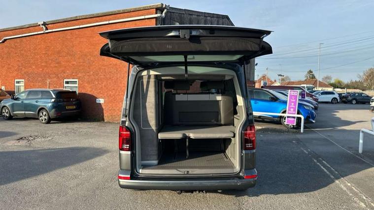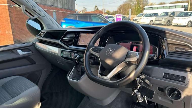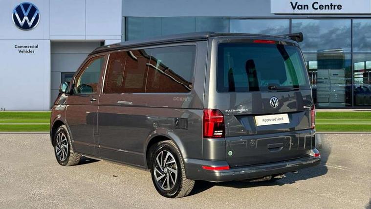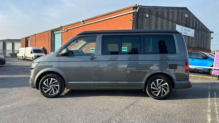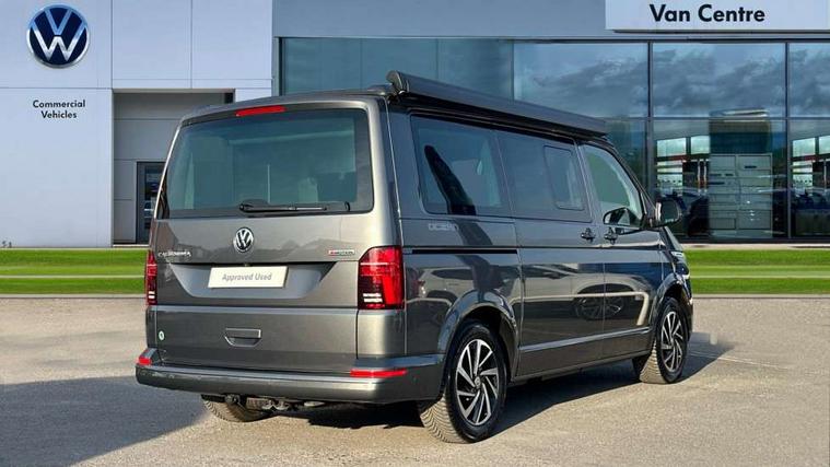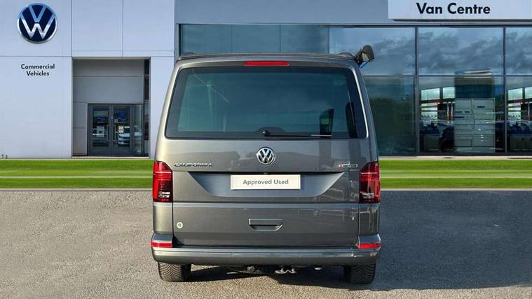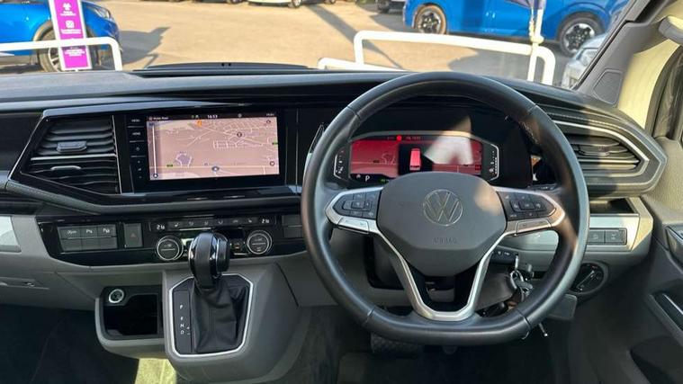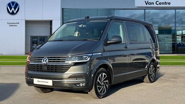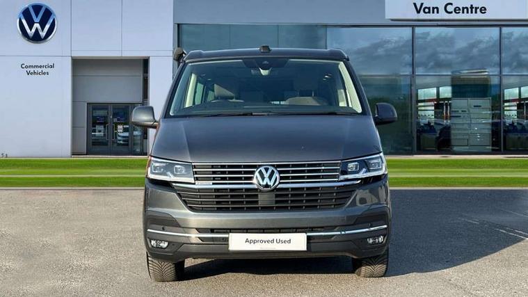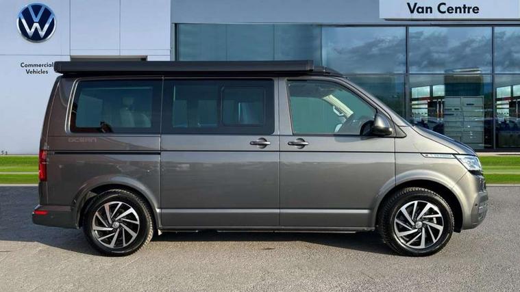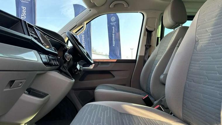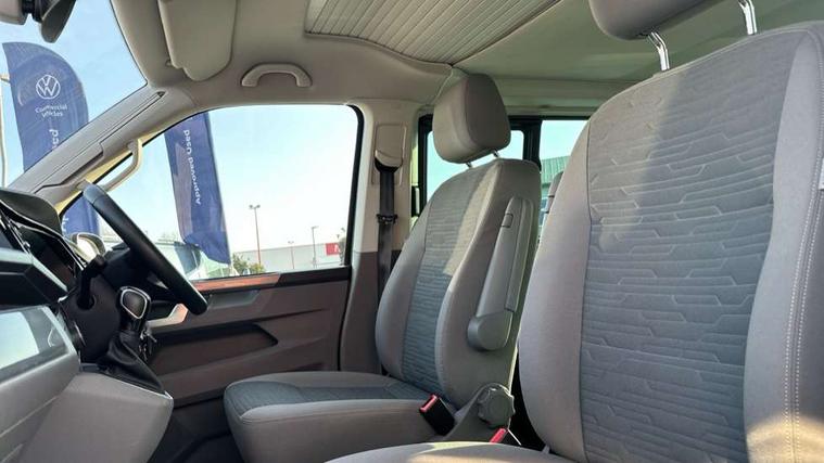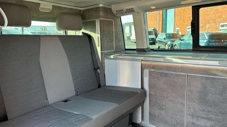 8" touch screen, Cross wind assist, Digital cockpit and driver alert system, eCall emergency system, Lane assist with side assist, Mobile phone interface, Navigation system preparation, Service interval indicator, Speed limiter, Start/stop system with regenerative braking, Tailgate latch without unlocking function from inside, Tailgate with window aperture and with power latching, Voice control system, Wired and wireless app connect, 17 inch chassis with 17 inch disc brakes in front and 16 inch disc brake in rear, 2 additional batteries with free maintanace including 1 additional battery with cut-off relay, 2 (type C) USB interfaces in dashboard, 8 speakers (4 tweeters + 4 woofers), Digital radio reception (DAB+), Regional code ECE for radio, Additional dust seals on the outside, Automatic headlight range control, Body colour bumpers, Body coloured door handles, California nameplate on the fender and on the rear, Electrically adjustable, heated, folding exterior mirrors, Electrohydrolic operated pop up roof with 3 windows and 1 front aperture, canvas in basalt grey, Front fog lights with cornering function, Heat insulating cab side windows, passenger compartment side windows tinted and with double glazing, Heated washer nozzles in front and washer fluid level indicator, High level 3rd brake light, LED headlamps with LED separate daytime running light, Left convex exterior mirror, Mounting rails on the roof (preparation for movable roof rack), Privacy glass with heat insulation, Radiator grille painted in black with 5 chrome trims, additional chrome trim at lower radiator grille, Rear boot, Rear window with insulating glass, rear window wiper and washer system, Right convex exterior mirror, Sliding window in front with fly screen and fixed window in rear in load passenger compartment left, Without left sliding door in load/passenger compartment, 1 waste bin in door storage compartment of the cab, 12V outlets in dashboard X 2, 2 seater bench/bed (camper), movable and folding to build 2 beds, in 3rd row of seats, 2 velour floor mats, 230V inlet with charging feature for vehicle batteries and 230V outlet in the interior, 3 spoke leather wrapped multifunction steering wheel, Allergen filter, Armrest for both cab seats, Camping table for inside/outside in sliding door and 2 folding chairs in tailgate, Child seat anchors ISOFIX and top tether for Multivan/California in 2nd to 4th row of seats, Climatronic 3 zone air conditioning with 2nd evaporator, auxiliary heater, air conditioned headliner and additional passenger control, Dimmable illuminated instruments, Electromechanical speed sensitive power steering, height and longitudinally adjustable steering column, Front head restraints, Fully functional kitchen with gas hob, sink and 42 litre compressor cool box, Glove compartment with illumination, Grab handles on A pillar for access, on driver and front passenger side, Heated driver and front passenger seats, Illuminated steps in passenger/load compartment, Illuminated sun visors with mirror and airbag label on front passenger sun visor, Interior light concept for camper with comfort in passenger compartment incl additional LED light in the pop up roof for the loft bed, in the tailgate, Interior loading edge protection in plastic, Jack and tool kit, Manually adjustable lumbar supports for left and right single seat in the 1st row of seats, Operating voltage 12V including 230V outlet on driver seat, Plastic floor covering in passenger compartment, Programmable parking heater with radio remote control and auxiliary heater, Rear head restraints, Refrigerant R1234yf, Roof bed (2000 x 1200 mm) with spring plates and mattress, Soft folding grab handles on roof frame, Special interior noise suppression measures, Special sound deadening measures in cab and passenger compartment, Step illumination with California lettering, Swivel seat on the left, with lumbar support in 1st row of seats, Swivel seat on the right, with lumbar support in 1st row of seats, Waeco compressor fridge, Without height adjustment for driver and single passenger seats, Lights and vision pack - California Ocean, Smokers pack - California, Airbags - Drivers and front passengers side and curtain airbags, Driver/Front Passenger airbags, Electronic stability control, ABS, ASR, EDL, brake assist system, Front assist with Autonomous emergency braking for Adaptive cruise control (ACC), Height adjustable 3 point seat belts on outer seats in cab with electric pretensioners, Hill start assist, Passenger airbag deactivation system, Power operated child safety locks, Single tone horn, Warning buzzer and light for driver seat belt not fastened, Anti theft alarm system with interior monitoring in cab, backup horn and towing protection, Central locking system with radio remote control, system controls inside and safelock, Lockable wheel bolts, Comfort dashboard lower part in palladium with chrome elements and bezels painted in black,