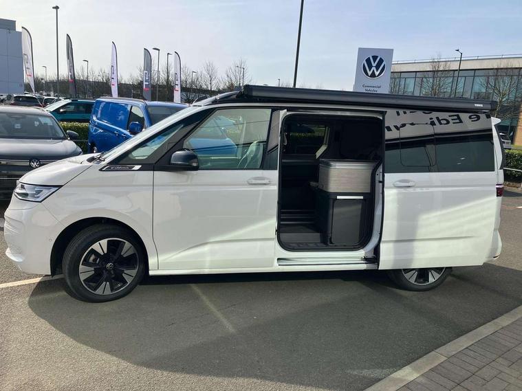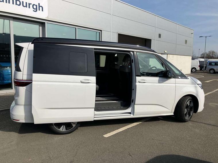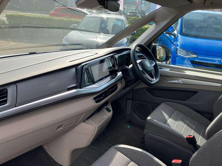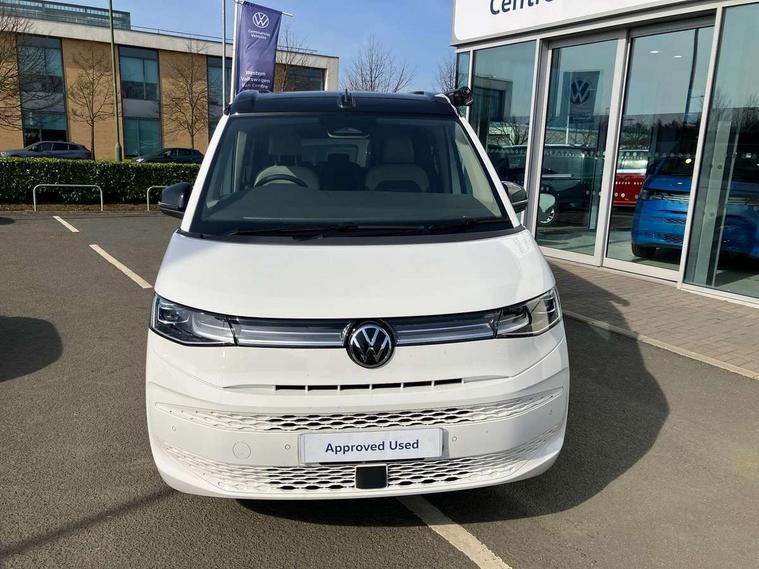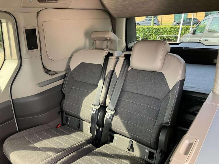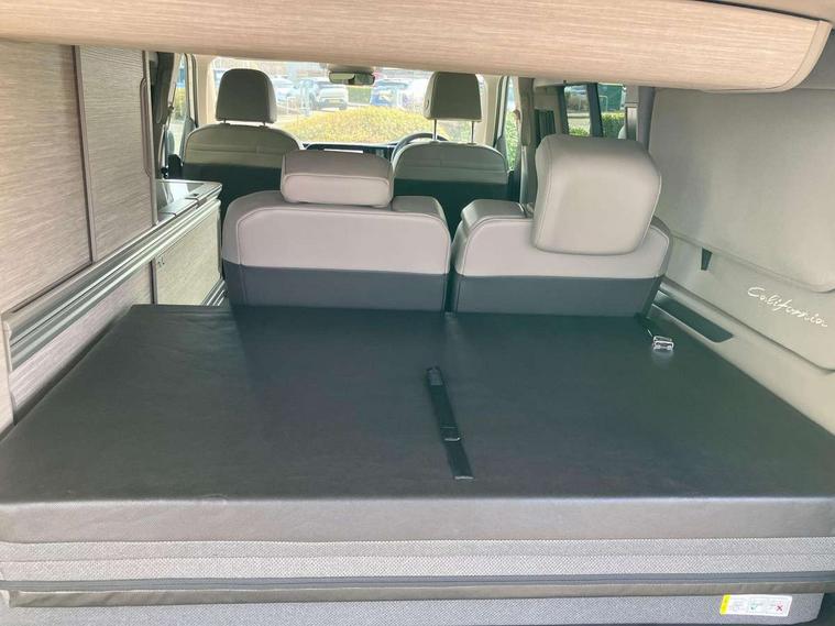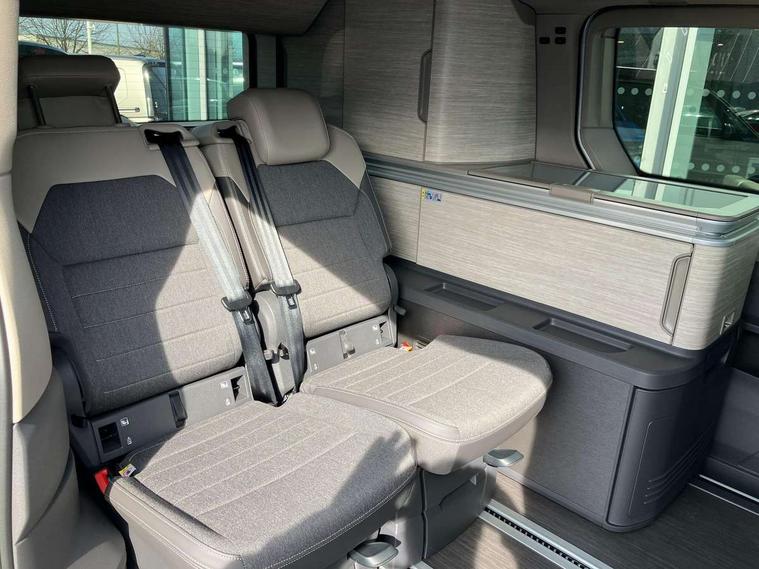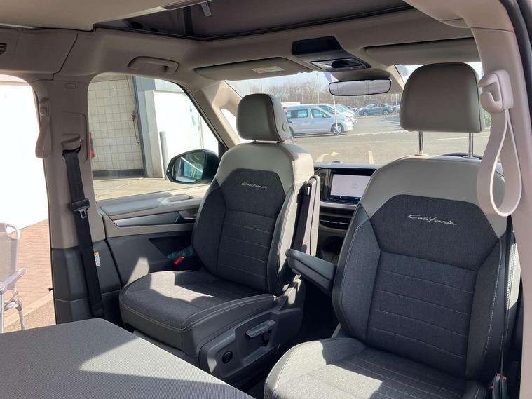 Advanced driver attention and drowsiness monitor, California on tour app, Digital cockpit pro, Discover Pro Navigation system, Driving profile selection, Dynamic road sign display, eCall emergency system, Emergency assist, Front cross traffic assist, Function control unit, IDA voice assistant and voice enhancer, Lane keeping system Lane Assist, Mobile phone interface, Motorhome Registration, Multifunction camera, PAS, Preparation for online services, Preparation for We connect and We connect plus, Servotronic speed sensitive power steering, Speed limiter and predicative speed limiter, Tailgate latching without unlatching function from inside, Tailgate with window aperture and with power latching, Travel assist, Turn assist with evasive assistance, Volkswagen wired and wireless app connect, Alternator 180A, 2nd and 3rd auxiliary batteries with low -voltage converter, Battery 380 A (68 Ah), Battery without capacity specification, Standard battery/generator, Standard suspension and shock absorption, 10.4 inch infotainment system with scalable module options, 2 USB-C ports at the front, 4 USB-C charging sockets in the passenger compartment, 8 Speakers, Digital radio reception (DAB), Dynamic headlight range control, Electro hydraulic elevating roof, with three windows including one front passengers panorama opening, canvas in Basalt Grey, Four speed control for windscreen wipers, Gloss black grille with 2 illuminated chrome trim, Heat and sound insulating laminated safety glass windshield, Heated windscreen, High gloss black door mirrors, Illuminated molding between headlamps, LED 3rd brake light, Nameplate set California, Poor weather light including cornering light, Rear boot, Red LED tail lights, Sliding window in front with fly screen in passenger compartment left/right & including privacy glass in rear, Windscreen wiper intermittent control, 2 single seats with integrated seatbelt and sleeping mat, 230V external inlet with charging feature for vehicle batteries, 230V inverter with socket on driver seat, Additional interior noise attenuation, Ambient interior lighting, Armrest on front swivel seats in both sides with electric lumbar support, Camper parking heater for continuous operation & parking heater for windshield defrosting with radio remote control, Darkening roller blinds and thermo mats, Drawers under the outer seats in the cab and passenger compartment & 2 waste bins, Front and rear headrests, Heated front seats, Heated steering wheel, Kitchen with outdoor folding table for cooking and roof storage box in décor 2, Lockable glove compartment with lighting, Luggage compartment with power latching, Multifunction leather steering wheel with paddle shifters, Reinforced plastic floor covering in wood look, Single front passenger seat, Storage compartment left and right 1st row of seats, Summer kitchen with outside folding table and 230-V outlet for cooking and roof storage box, Surround lighting in door area, Swivel seat on left with height adjustable including drawer, Swivel seat on right with height adjustable including drawer, Velour floor mats in cab, Without loading edge protection, Without luggage compartment cover, Advanced assistance pack - California, Top package - California, 2x3 point automatic seatbelts at the rear outside with ECE label, with/without belt tensioner, Autonomous emergency braking, Child locks, Driver and front passenger airbags with front passenger airbag deactivation button, First aid kit with warning triangle and safety vest, Front Assist with pedestrian and cyclist detection, Front disc brakes, Height adjustable three point automatic seatbelts at front with belt and end fitting tensioners, Occupants detection only display, Side and curtain airbags for driver and front passenger, curtain airbags for outer seats in rear, centre airbag in front, Swerve support and oncoming vehicle braking when turning, Tyre pressure loss indicator, Warning signal and warning lamp for front and rear seat belts not fastened, Anti theft alarm system with interior monitoring in cab, backup horn and towing protection, Central locking + keyless locking and starting system Keyless Advanced with safe lock, Lockable wheel bolts, Preparation for alcohol interlock, 5+ Promise service plan, Dark silver brushed decorative inlays, 235/50 R18 tyres with low rolling resistance, Tool kit, Trims for alloy wheels, Tyre mobility kit, Without spare wheel,