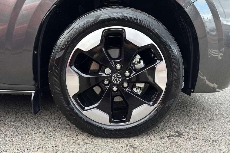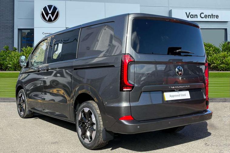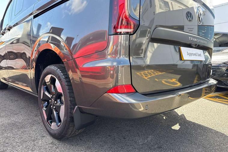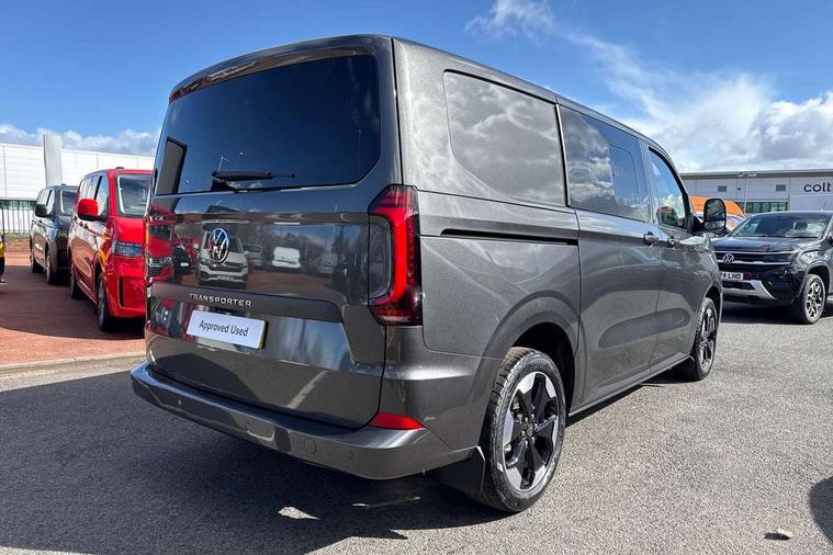 12" digital drivers display, 13" touchscreen infotainment display with wireless app connect and DAB radio, 5G Modem, Cruise control with predictive speed limiter, Dynamic road sign display, eCall emergency system, Front collision warning with braking, Identification label for N1 commercial vehicle registration, Lane assist, PAS, Preparation of VW connect and connect plus, Wrong way driver warning, 6 speakers, Body coloured add on parts, Body coloured door handles, Dual sliding doors with pop-out window vents (left and right) for 2nd row, Mud flaps front and rear, Rear tailgate, Rear Transporter nameplate in black grained decorative trim, Rear window wiper with washer system, Sliding doors on driver and front passenger side, Vehicle opening configuration 1x 1st row of seats, 2x all doors, 12 pin terminal block, 2 LED lights in roof of load compartment, 3 single seats in 2nd row, folding and tumbling, 2x isofix and top tether, 4 tie downs for securing goods in the passenger/load compartment, 4 way height and tilt adjustable head restraints, Black plastic scuff plate for sliding door in cargo, illuminated, Black plastic scuff plate in front without illumination, Covers in the bottom area of all side panels and doors in the load compartment, Dimming breakaway interior rear view mirror, Gear selector lever on steering wheel, LED light units for cab and passenger compartment, Overhead storage compartment, Single driver and single passenger seat in cab, Striped fabric upholstery, Without bulkhead, Without floor covering in load compartment, Driver and front passenger airbag with front passenger airbag deactivation, Dual tone horn, Seat belt pretensioner for front seats, Side and curtain airbags in cab curtain airbags in passenger compartment, Anti theft alarm system with interior monitoring in cab, backup horn and towing protection, Central locking, Preparation for alcohol ignition interlock, 5+ Promise, Alternator - 230A, Electronic Stability Control (ESC),