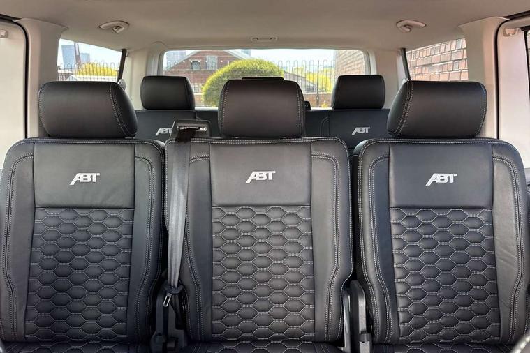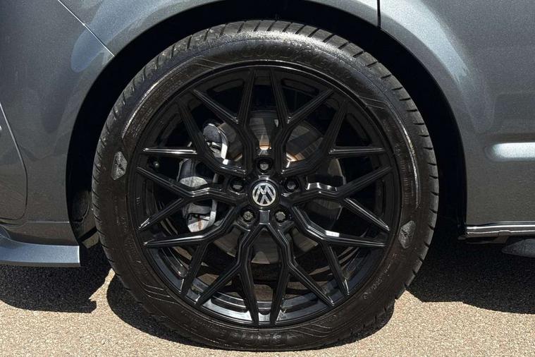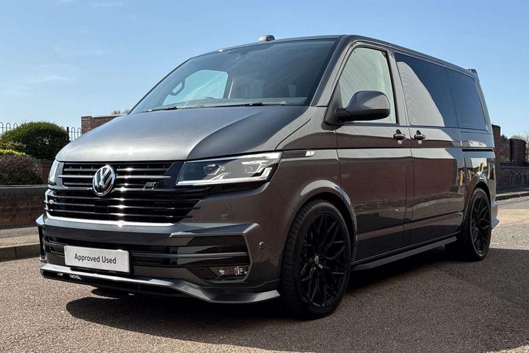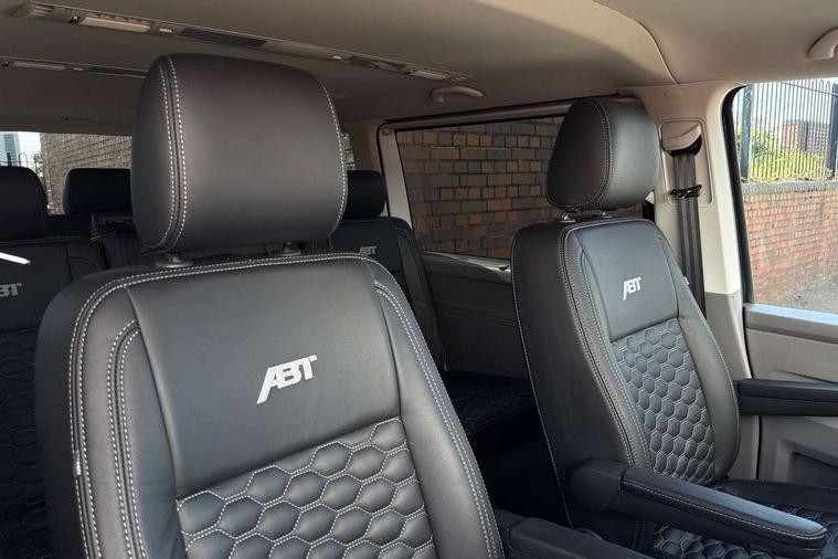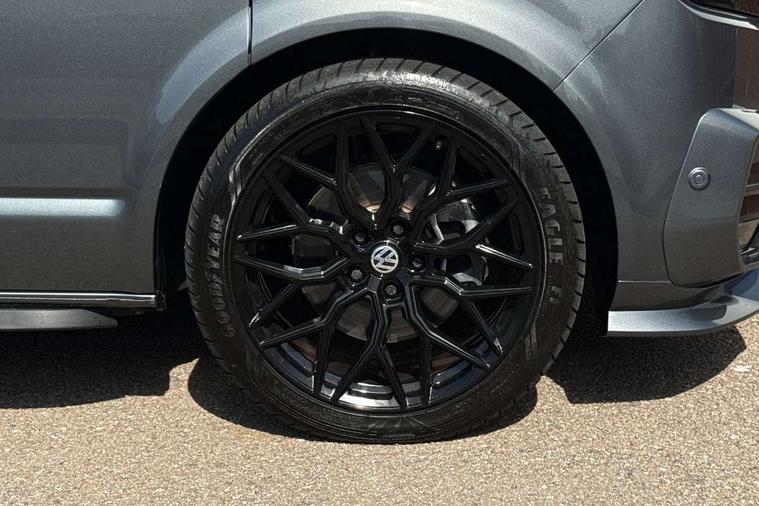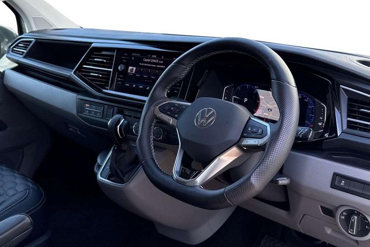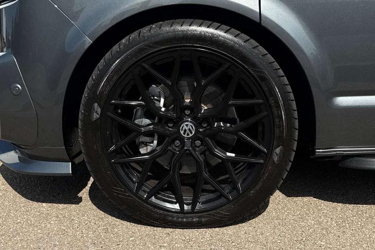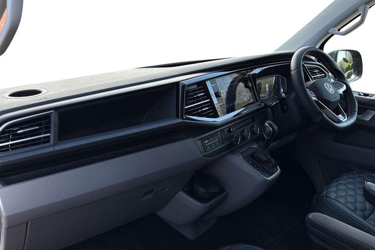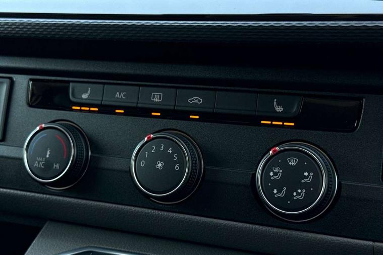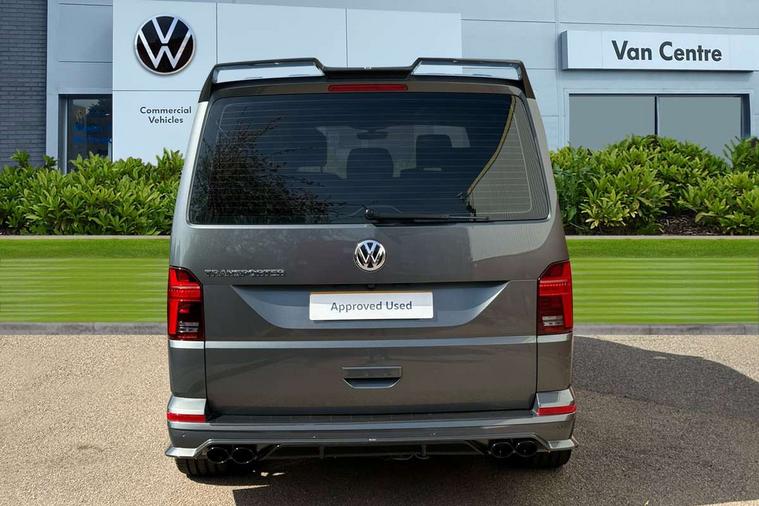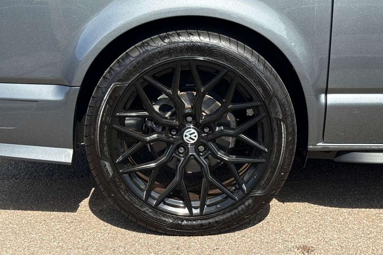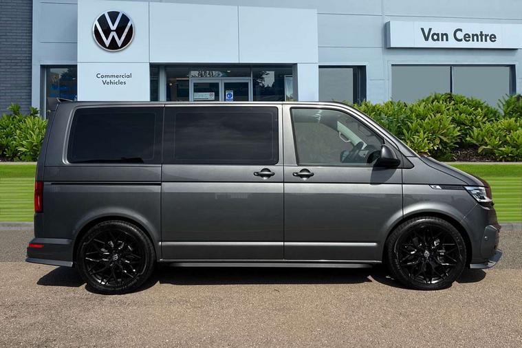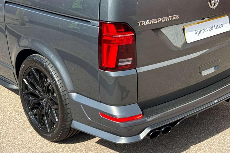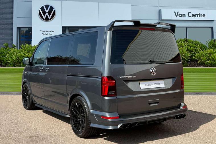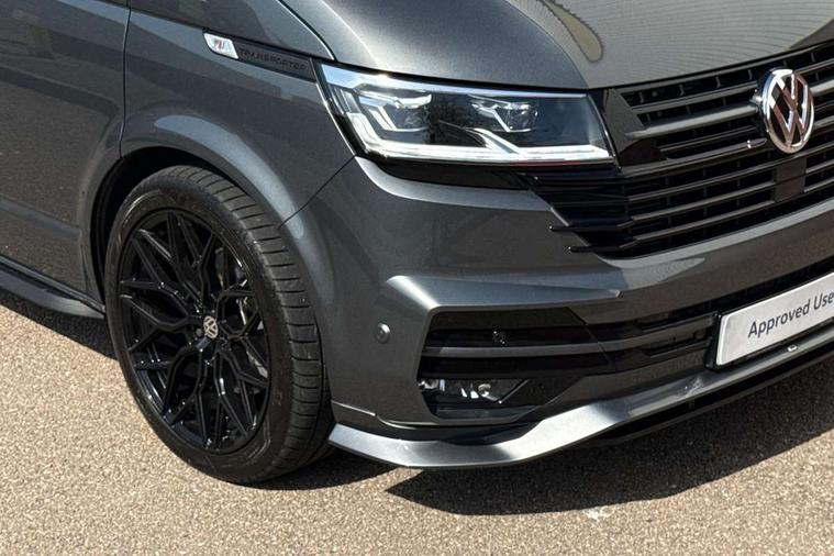 Adaptive cruise control including speed limiter and city emergency braking, Cross wind assist, Dimmable instrument illumination, eCall emergency system, Front assist with autonomous emergency braking, Headlight range control, Mobile phone interface, 2 USB interfaces type C in dashboard, 6 speakers with 2 tweeters, 2 woofers and 2 full range speakers, Composition colour radio with 6.5" touchscreen, Digital radio reception (DAB+), Volkswagen app connect, Additional dust seals on outside, Black painted radiator grille with 5 chrome trims, Body colour bumpers, Body coloured exterior mirror housings and door handles, Electric windows front + rear, Illuminated steps in passenger/load compartment, Left convex exterior mirror, Rear window with heat insulating glass, heated, rear window wiper and washer system, Red LED rear combination lamps, Right convex exterior mirror, Sliding door on the left in load/passenger compartment, Sliding door on the right in load/passenger compartment, Standard roof with 8 feet mounting points for roof rack system, Transporter nameplate on the rear fender, 2 12V outlets in dashboard, 3 spoke leather wrapped multi function steering wheel, Air cleaner, Comfort headliner in cab and headliner for recirculated air with vents in passenger compartment, Driver and passenger grab handles on A pillars, Dust/pollen filter, Glove compartment with illumination, Interior lighting with LED technology in load/passenger compartment, Interior plastic loading edge protection, Lashing rings for load restraint system, Lumbar supports for left and right single seat in the 1st row of seats (both manually adjustable), Refrigerant R1234yf, Soft folding grab handles on roof frame, Special interior noise suppression measures, Special sound deadening measures in cab and passenger compartment, Standard lower part dashboard in palladium, Sun visors with mirror, illuminated and airbag label on front passenger sun visor, Sunshades for side windows in passenger compartment, Tool kit and heavy duty jack, Vents for side windows in headliner, Lights and Vision package, Non smoker pack, Without storage package - Shuttle, 3 point seat belts, height adjustable on outer seats in cab with electric pretensioners, Driver and front passenger airbag with front passenger airbag deactivation, Driver and front passenger curtain airbags, Power operated child safety lock, Single tone horn, Warning buzzer and light for driver seat belt not fastened, Anti-theft alarm system with interior monitoring, backup horn and towing protection, Central locking system with radio remote control, inside system controls and safelock, 16" chassis with 16" brake system, Diesel particulate filter, Electronic Stability Control, ABS, ASR with deactivation button, eletronic differential lock and brake assist system, Hill start assist, Initial standard fuel filling, Start and stop system with regenerative braking, Traction control, 17" Devonport alloy wheels, Wheel center cover,