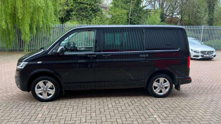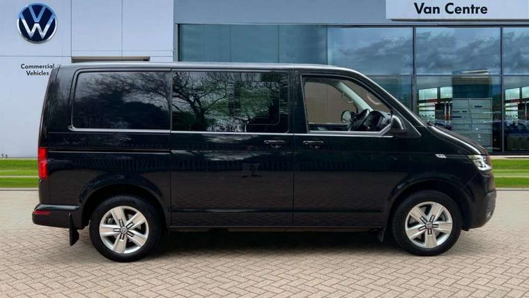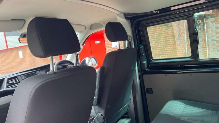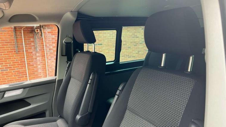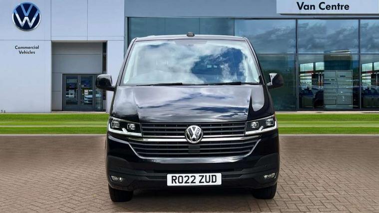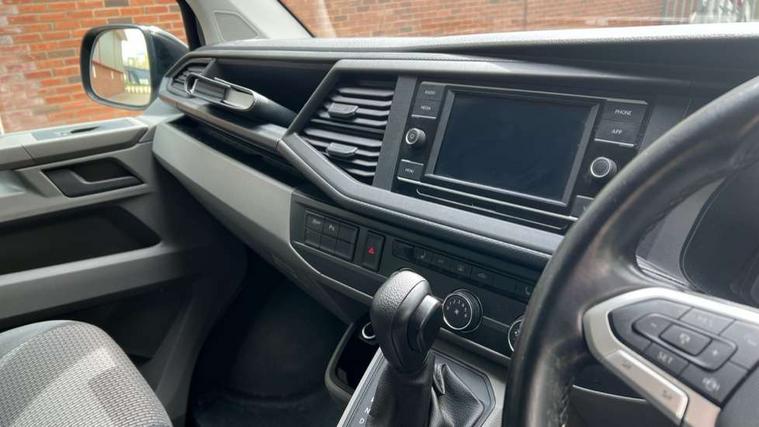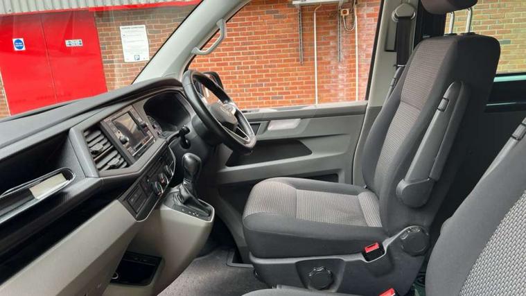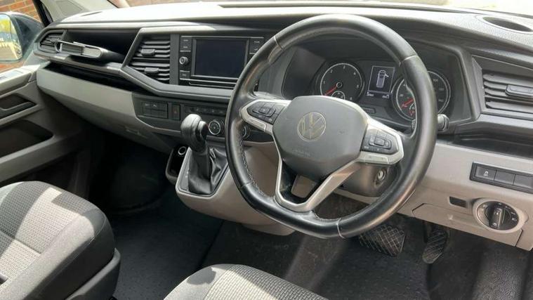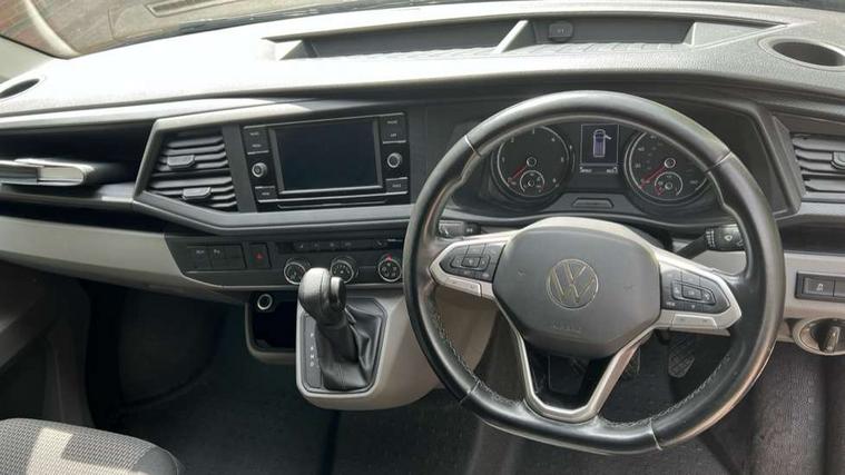 Adaptive cruise control, Child seat anchors ISOFIX and top tether in 2nd row of seats, Cross wind assist, Dimmable illuminated instruments, Driver alert with black and white multi function display plus, eCall emergency system, Electromechanical speed sensitive power steering, height and longitudinally adjustable steering column, Forward collision warning front assist with autonomous emergency braking, Headlight range control, Mobile phone interface, Without voice control, 2 USB interfaces type C in dashboard, 4 speakers with 2 tweeters and 2 woofers, Composition colour radio with 6.5" touchscreen, Digital radio reception (DAB+), Volkswagen app connect, Automatic headlight control, leaving home and manual coming home feature, Front fog lamps with cornering light, Green heat insulating glass, Heated front windscreen, Illuminated steps in passenger/load compartment, Left convex exterior mirror, Power folding adjustable door mirrors with separately heated, Privacy glass from the B-pillar and heat-insulating glass in front, Radiator grille with 2 chrome trims, Rear window with heated insulating glass, heated rear window wiper and washer system, Right convex exterior mirror, Tailgate closing with unlatching from the inside, Transporter nameplate on the rear fender, Windshield wiper intermittent control with rain sensor for windshield wipers, Without adhesive film, 3 spoke leather wrapped multi function steering wheel, Additional sound deadening measures in cab and passenger compartment, Auto dimming breakaway interior rear view mirror, Comfort headliner in cab, hardboard roof trim in passenger and load compartment, Dust/pollen filter, Folding grab handles and storage compartments on cab seats, reading light, Front seats on the right in 1st row of seat, Glove compartment with illumination, Heavy duty tool kit and jack, Interior plastic loading edge protection, Lashing rings for load restraint system, LED Interior lighting in load and passenger compartment, Medium height for vehicles with window aperture hardboard side trim panels in passenger/load compartment, Refrigerant R134a, Standard lower part dashboard in palladium, Without partition, Without seats in 3rd row of seats, Comfort pack - Transporter, Exterior pack without fog light- Transporter, Light and vision pack - Transporter, Non smoker pack - Transporter, 3 point height adjustable seat belts on outer seats cab with electric pretensioners, Driver and front passenger airbag with front passenger airbag deactivation, Power operated child safety lock, Warning buzzer and light for driver seat belt not fastened, Anti theft alarm system with interior monitoring in cab, backup horn and towing protection, Lockable wheel bolts, 16" chassis with 16" brake system, 70 L volume fuel tank, Diesel particulate filter, Electronic stability control, ABS, ASR with deactivation button, hill start assist and brake assist system, Speed limiter, Start/stop system with regenerative breaking, 17" Devonport silver alloy wheels, Wheel trims,