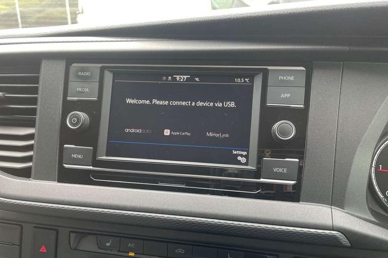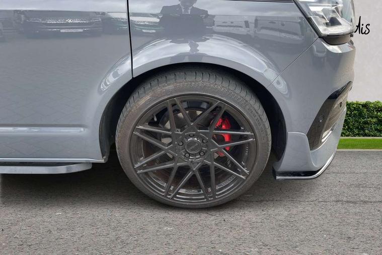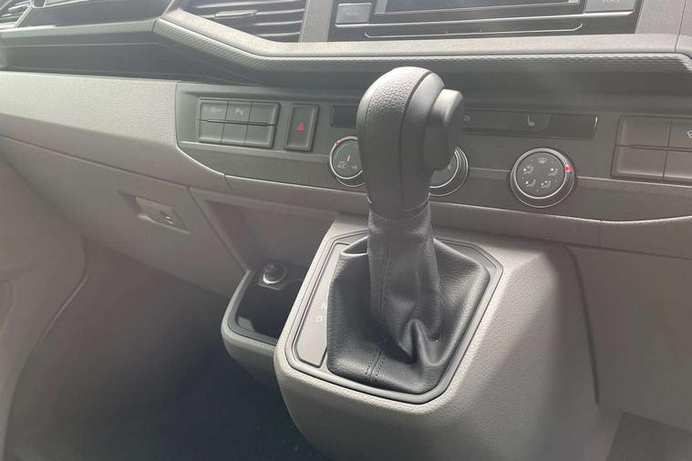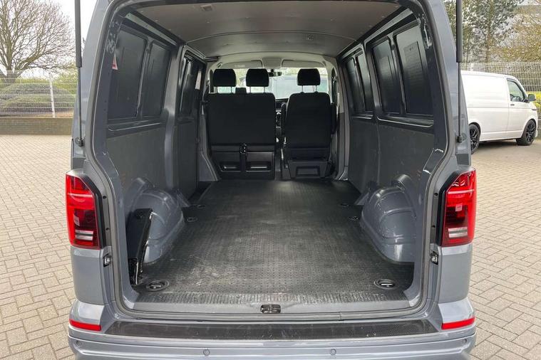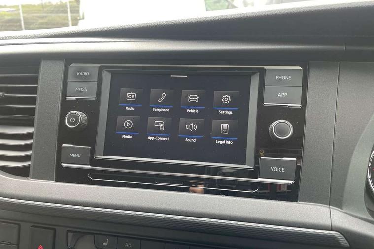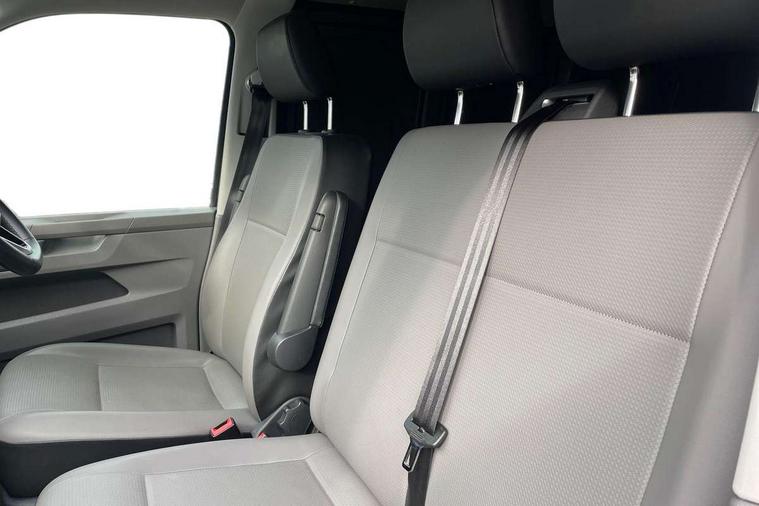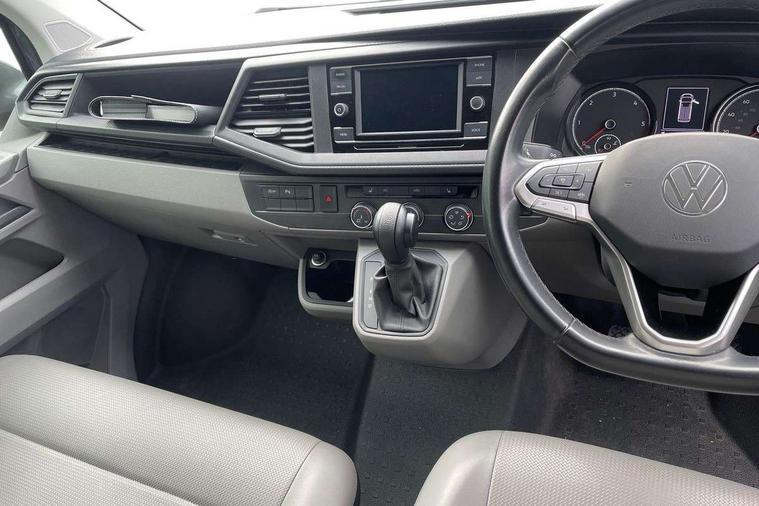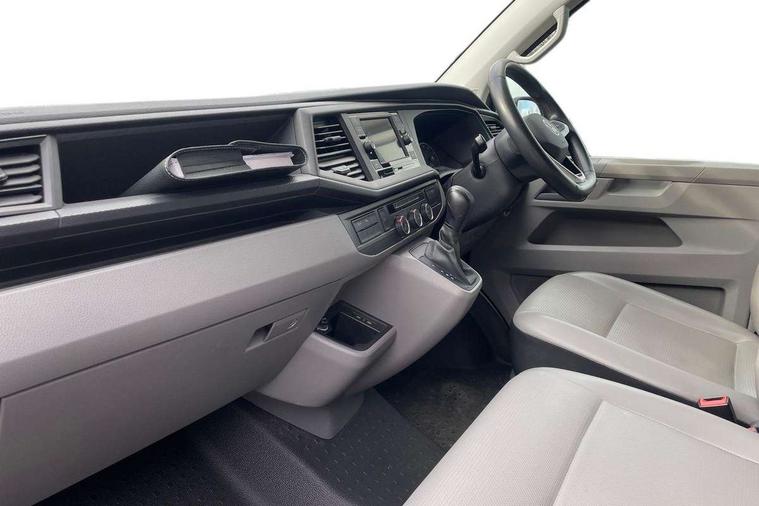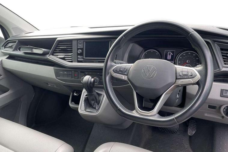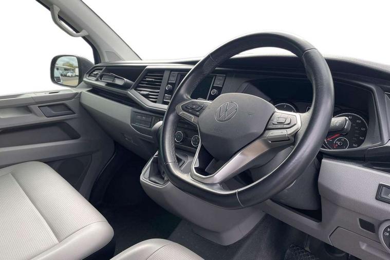 Adaptive cruise control, Cross wind assist, Dimmable illuminated instruments, Driver alert with Multi-function display plus, eCall emergency system, Electromechanical speed sensitive power steering, height and longitudinally adjustable steering column, Forward collision warning front assist with autonomous emergency braking, Mobile phone interface, Multi function display plus with black and white display, 2 USB interfaces type C in dashboard, 4 speakers with 2 tweeters and 2 woofers, Composition colour radio with 6.5" touchscreen, Digital radio reception (DAB+), Volkswagen app connect, Automatic headlight control, leaving home and manual coming home feature, Closing rear wing door with unlatching from the inside, Front fog lamps with cornering light, Heat insulating glass (green) in cab and passenger/load compartment, Heated front windscreen, Left convex exterior mirror, Power folding adjustable door mirrors with separately heated, Radiator grille with 2 chrome trims, Rear wing doors without window apertures, Right convex exterior mirror, Transporter nameplate on the rear fender, Windshield wiper intermittent control with rain sensor for windshield wipers, 3 spoke leather wrapped multi function steering wheel, Auto dimming breakaway interior rear view mirror, Comfort headliner in cab, hardboard roof trim in passenger and load compartment, Dust/pollen filter, Front and rear left without window closed side panel in load compartment, Front seats on the right in 1st row of seat, Glove compartment with illumination, Heavy duty tool kit and jack, High partition, Interior plastic loading edge protection, LED Interior lighting in load and passenger compartment, Manual adjustable lumbar support for right single seat in 1st row seats, Refrigerant R134a, Standard lower part dashboard in palladium, Storage compartments on cab seats and reading light, Without right side window apertures in passenger and load compartment, Comfort pack - Transporter, Exterior pack without fog light- Transporter, Non smoker pack - Transporter, 3 point height adjustable seat belts on outer seats cab with electric pretensioners, Driver and front passenger airbag with front passenger airbag deactivation, Warning buzzer and light for driver and front passenger seat belt not fastened, Without child safety lock in passenger compartment, Anti theft alarm system with interior monitoring in cab, backup horn and towing protection, Lockable wheel bolts, 16" chassis with 16" brake system, Additional 12V socket, Diesel particulate filter, Electronic stability control, ABS, ASR with deactivation button, hill start assist and brake assist system, Start/stop system with regenerative breaking, 16" Clayton alloy wheels,