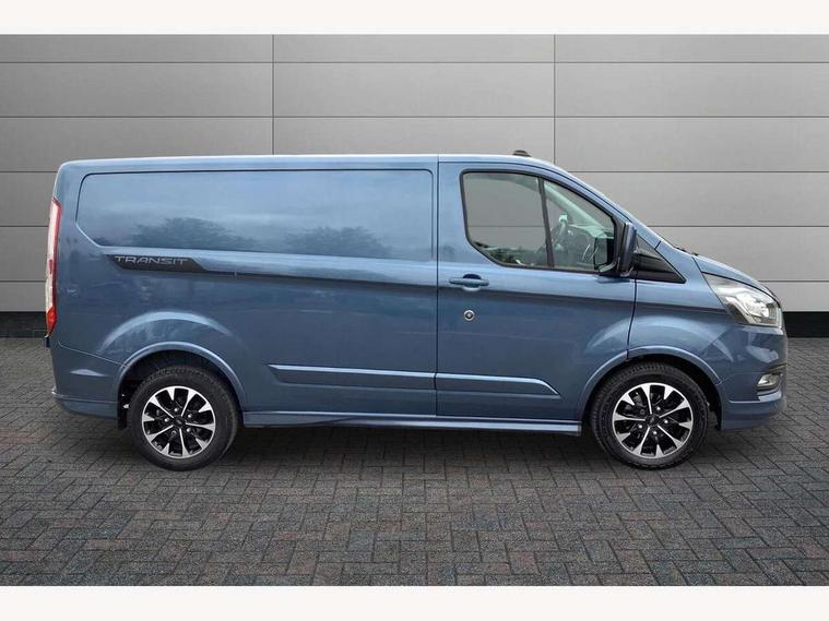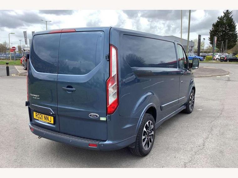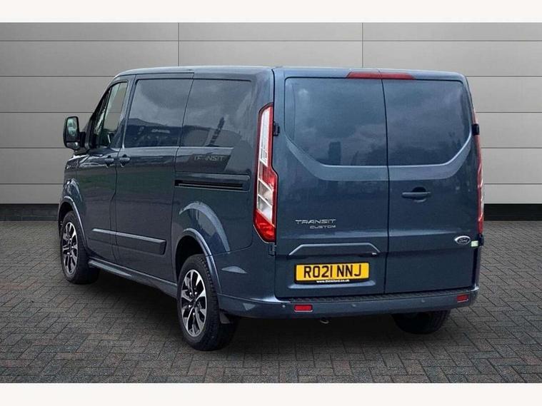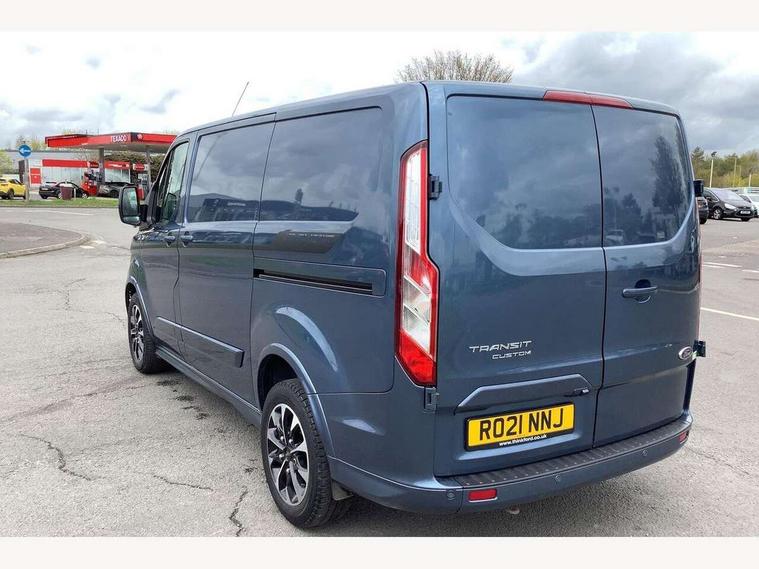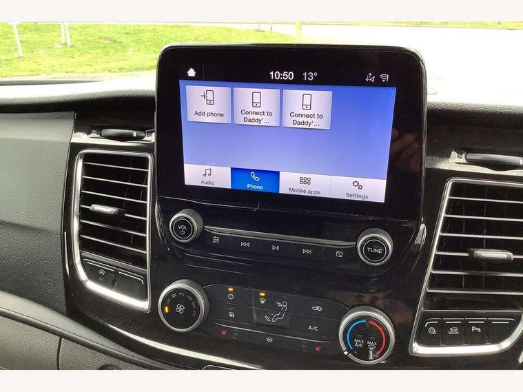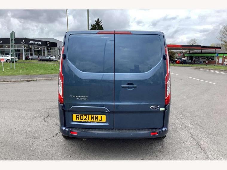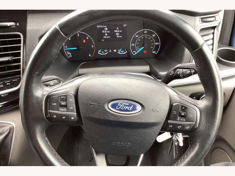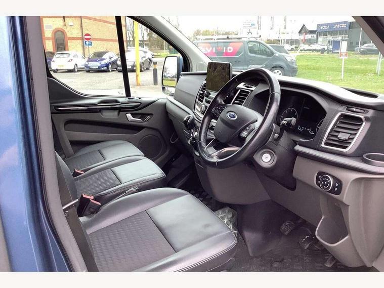 Adjustable steering column, Blind spot monitor, Easy fuel capless refuelling system, Ford Eco mode, Front and rear parking aid + front fog lamps, Lane keeping alert, PAS, Rear view camera with trailer hitch assist include rear LED downlighter, Seatbelt warning indicator, Trip computer, 4 speakers, Audio controls mounted on steering wheel, Aux input socket, 'Guide me home' headlights, Automatic lights and wipers, Body colour door and tailgate handles, Body coloured body side mouldings, Body coloured door mirrors, Body coloured front bumper, Body coloured rear bumpers, Electric front windows with one touch facility for driver and front passenger, Front mud flaps, Headlamp levelling, Intermittent front wash/wipe, Power folding electric heated and adjustable door mirrors, Quickclear heated windscreen, Rear mudflaps, Assist handle, Courtesy light, Driver and passenger sunvisors with illuminated vanity mirrors, Drivers seat with lumbar adjustment, Easy clean load floor, Front manual air conditioning, Front passenger grab handle, Half height load compartment trim boards, Heated front seats, Height adjustable front headrests, Illuminated footwell, Load area protection kit, Load box LED lights, Lockable glove box, Map reading lights, Moulded cab headlining, Part leather upholstery, Reach and rake adjustable steering column, Recirculation heater, Rubber floor covering, Tie-down loops, Underseat storage compartment, Visibility Pack Premium - Transit Custom, 3 point seatbelts for all seats, Driver's airbag, Front outer passenger airbag with deactivation switch, Front passenger airbag, Front seatbelt pretensioners, Height adjustable drivers seatbelt mount, Passenger seatbelt height adj, 2nd remote key, Auto locking on drive-away, Auto relocking, Configurable Unlocking, Power door dead locks, Remote central locking, Thatcham category 1 alarm, 2 12v sockets, 80 litre fuel tank, ABS, Alternator - 150A, Diesel particulate filter, ESP + EBA, Power point plug 400W - Level 2, Roll stability control, Side wind mitigation, 17" 7 Black/machined alloy wheel, Continental Tyres, Mini steel spare wheel,