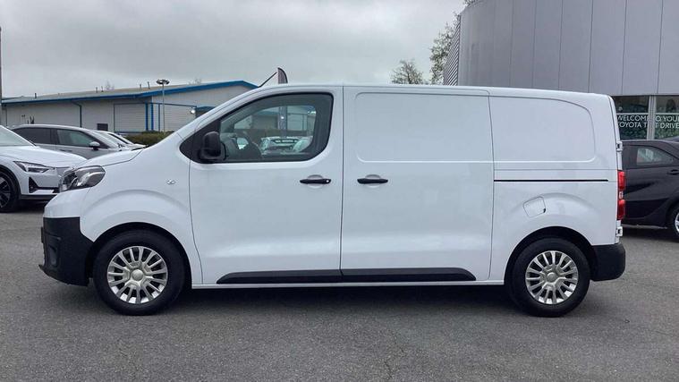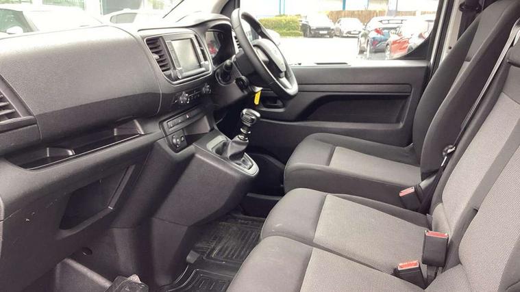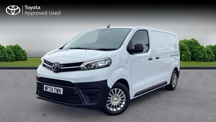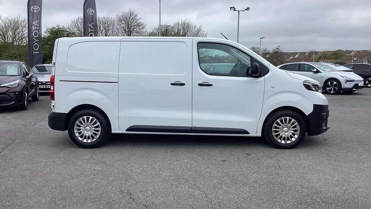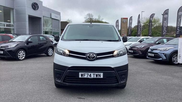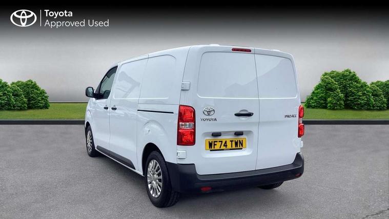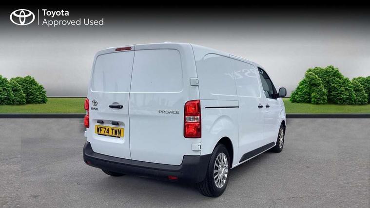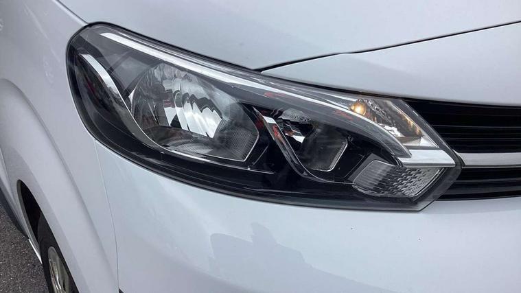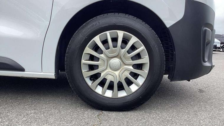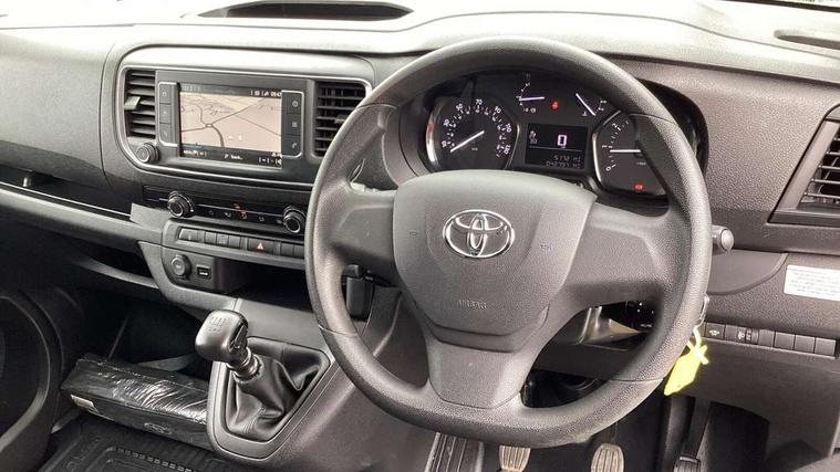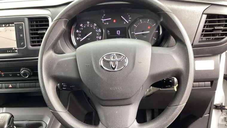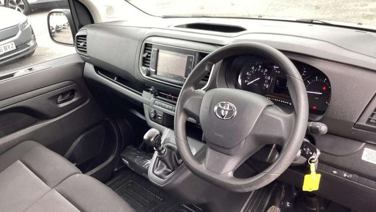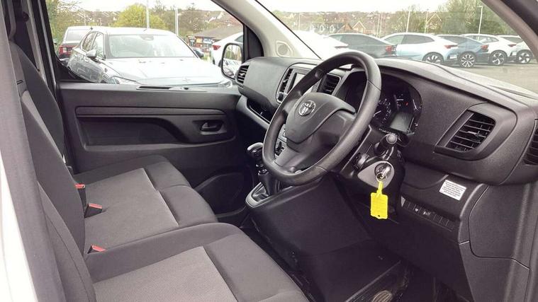 Bluetooth handsfree connectivity, Cruise control, PAS, Tyre pressure warning system (TPWS), 4 speakers, Digital radio (DAB), Radio/CD player, USB connector, 180 degree opening rear doors, Acoustic windscreen, Auto Headlights, Auto wipers, Black bumpers, Black door handles, Black protection moulding on side door, Body Coloured roof, Daytime running lights, Front power windows, Headlight cut-off reminder, Heated door mirrors, LED High mounted stop light, Manually adjustable day/night rear view mirror, Multi reflector halogen headlights, Panel rear wing doors, Power adjustable door mirrors, Rear combination lights, Short Antenna, Smoke tinted (30%) privacy glass on rear passenger window, Two manual sliding side doors, 2 seat front passenger bench, Driver seat armrest, Fabric seats, Front cup holders, Front room lights, Glovebox light, LED Driver and front passenger personal lights, Lighted and chilled upper glove box, Manually reclining and sliding driver and front passenger seats, Open upper dashboard storage compartment, Panel bulkhead with window and protective grille, Storage under passenger bench, Air conditioning and Smart cargo pack - Proace, Parking pack - Proace, Double front passenger airbag, Front passenger airbag on/off switch, Supplement restraint system (SRS) 2 airbags, Alarm, Deadlocks + 2 remote keys, Power door locks, 12V power front outlet, 12v socket in dashboard and rear, Adjustable speed limiter (ASL), Anti lock braking system (ABS), Brake Assist (BA), Stop/start function, Toyota traction select, Vehicle stability control (VSC) and hill start assist control (HAC), Full size spare wheel, Full wheel covers,