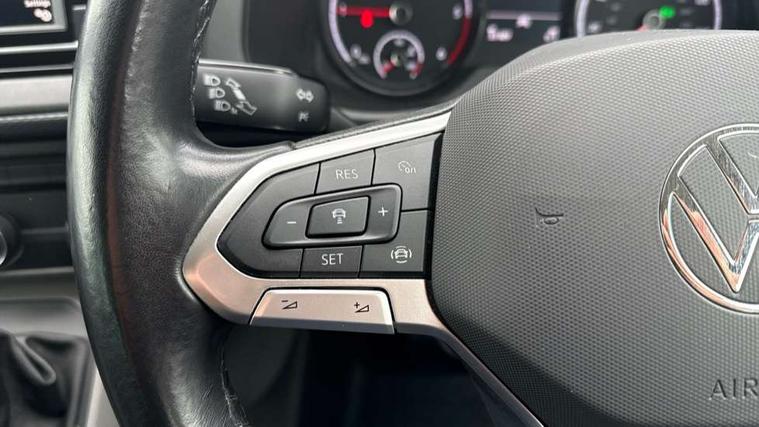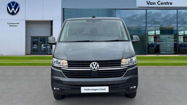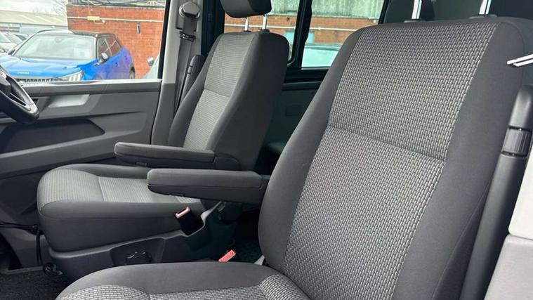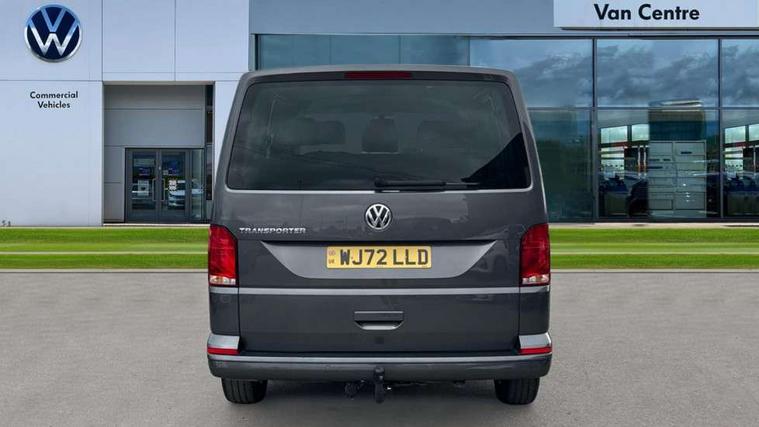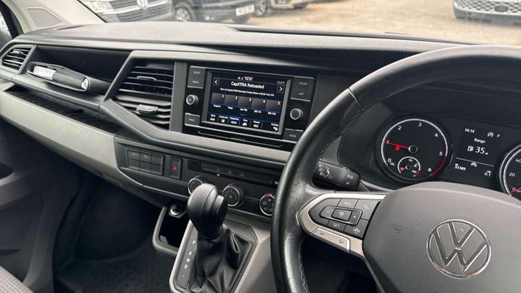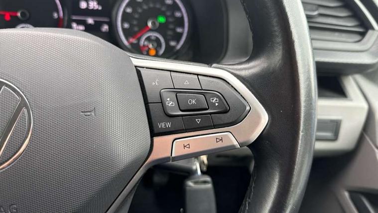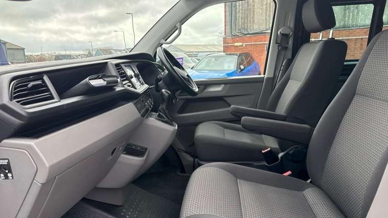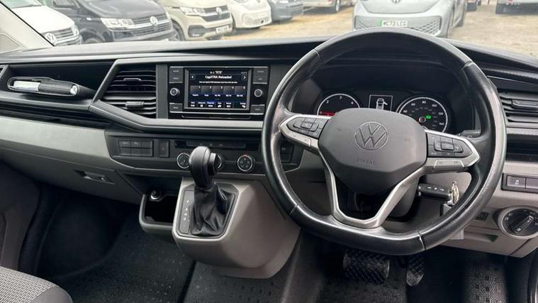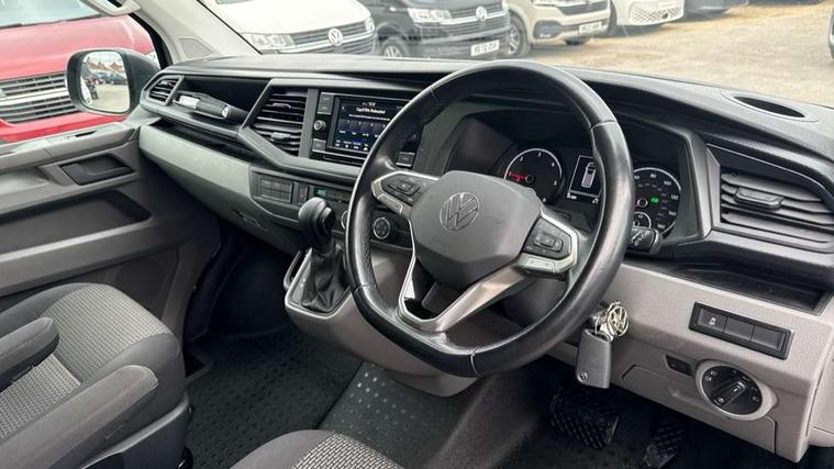 Adaptive cruise control, Child seat anchors ISOFIX and top tether in 2nd row of seats, Cross wind assist, Dimmable illuminated instruments, Driver alert with black and white multi function display plus, eCall emergency system, Electromechanical speed sensitive power steering, height and longitudinally adjustable steering column, Forward collision warning front assist with autonomous emergency braking, Headlight range control, Mobile phone interface, Without voice control, 2 USB interfaces type C in dashboard, 4 speakers with 2 tweeters and 2 woofers, Composition colour radio with 6.5" touchscreen, Digital radio reception (DAB+), Volkswagen app connect, Automatic headlight control, leaving home and manual coming home feature, Front fog lamps with cornering light, Green heat insulating glass, Heated front windscreen, Illuminated steps in passenger/load compartment, Left convex exterior mirror, Power folding adjustable door mirrors with separately heated, Privacy glass from the B-pillar and heat-insulating glass in front, Radiator grille with 2 chrome trims, Rear window with heated insulating glass, heated rear window wiper and washer system, Right convex exterior mirror, Tailgate closing with unlatching from the inside, Transporter nameplate on the rear fender, Windshield wiper intermittent control with rain sensor for windshield wipers, Without adhesive film, 3 spoke leather wrapped multi function steering wheel, Additional sound deadening measures in cab and passenger compartment, Auto dimming breakaway interior rear view mirror, Comfort headliner in cab, hardboard roof trim in passenger and load compartment, Dust/pollen filter, Folding grab handles and storage compartments on cab seats, reading light, Front seats on the right in 1st row of seat, Glove compartment with illumination, Heavy duty tool kit and jack, Interior plastic loading edge protection, Lashing rings for load restraint system, LED Interior lighting in load and passenger compartment, Medium height for vehicles with window aperture hardboard side trim panels in passenger/load compartment, Refrigerant R134a, Standard lower part dashboard in palladium, Without partition, Without seats in 3rd row of seats, Comfort pack - Transporter, Exterior pack without fog light- Transporter, Light and vision pack - Transporter, Non smoker pack - Transporter, 3 point height adjustable seat belts on outer seats cab with electric pretensioners, Driver and front passenger airbag with front passenger airbag deactivation, Power operated child safety lock, Warning buzzer and light for driver seat belt not fastened, Anti theft alarm system with interior monitoring in cab, backup horn and towing protection, Lockable wheel bolts, 16" chassis with 16" brake system, 70 L volume fuel tank, Diesel particulate filter, Electronic stability control, ABS, ASR with deactivation button, hill start assist and brake assist system, Speed limiter, Start/stop system with regenerative breaking, 16" Clayton alloy wheels, Wheel trims,
