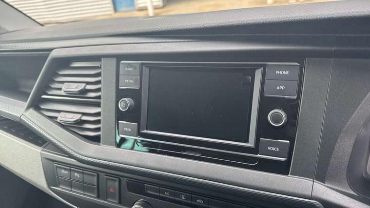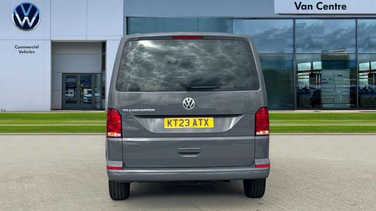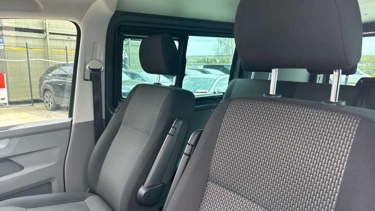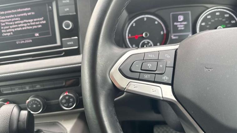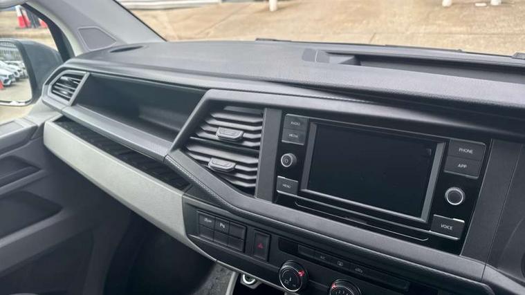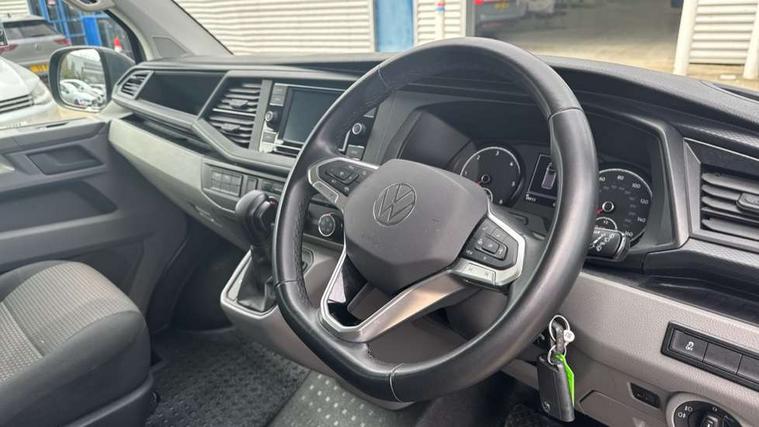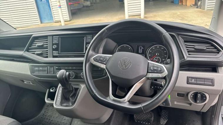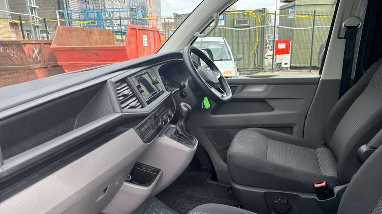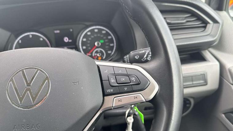 Adaptive cruise control, Child seat anchors ISOFIX and top tether in 2nd row of seats, Cross wind assist, Dimmable illuminated instruments, Driver alert with black and white multi function display plus, eCall emergency system, Forward collision warning front assist with autonomous emergency braking, Headlight range control, Mobile phone interface, Without voice control, 2 USB interfaces type C in dashboard, 4 speakers with 2 tweeters and 2 woofers, Composition colour radio with 6.5" touchscreen, Digital radio reception (DAB+), Volkswagen app connect, Automatic headlight control, leaving home and manual coming home feature, Front fog lamps with cornering light, Green heat insulating glass, Heated front windscreen, Illuminated steps in passenger/load compartment, Left convex exterior mirror, Power folding adjustable door mirrors with separately heated, Privacy glass from the B-pillar and heat-insulating glass in front, Radiator grille with 2 chrome trims, Rear window with heated insulating glass, heated rear window wiper and washer system, Right convex exterior mirror, Tailgate closing with unlatching from the inside, Transporter nameplate on the rear fender, Windshield wiper intermittent control with rain sensor for windshield wipers, Without adhesive film, 3 spoke leather wrapped multi function steering wheel, Additional sound deadening measures in cab and passenger compartment, Auto dimming breakaway interior rear view mirror, Comfort headliner in cab, hardboard roof trim in passenger and load compartment, Dust/pollen filter, Folding grab handles and storage compartments on cab seats, reading light, Front seats on the right in 1st row of seat, Glove compartment with illumination, Heavy duty tool kit and jack, Interior plastic loading edge protection, Lashing rings for load restraint system, LED Interior lighting in load and passenger compartment, Medium height for vehicles with window aperture hardboard side trim panels in passenger/load compartment, Refrigerant R134a, Standard lower part dashboard in palladium, Without partition, Without seats in 3rd row of seats, Comfort pack - Transporter, Exterior pack without fog light- Transporter, Non smoker pack - Transporter, 3 point height adjustable seat belts on outer seats cab with electric pretensioners, Driver and front passenger airbag with front passenger airbag deactivation, Power operated child safety lock, Warning buzzer and light for driver seat belt not fastened, Anti theft alarm system with interior monitoring in cab, backup horn and towing protection, Lockable wheel bolts, 16" chassis with 16" brake system, Diesel particulate filter, Electronic stability control, ABS, ASR with deactivation button, hill start assist and brake assist system, Speed limiter, Start/stop system with regenerative breaking, 16" Clayton alloy wheels, Wheel trims,